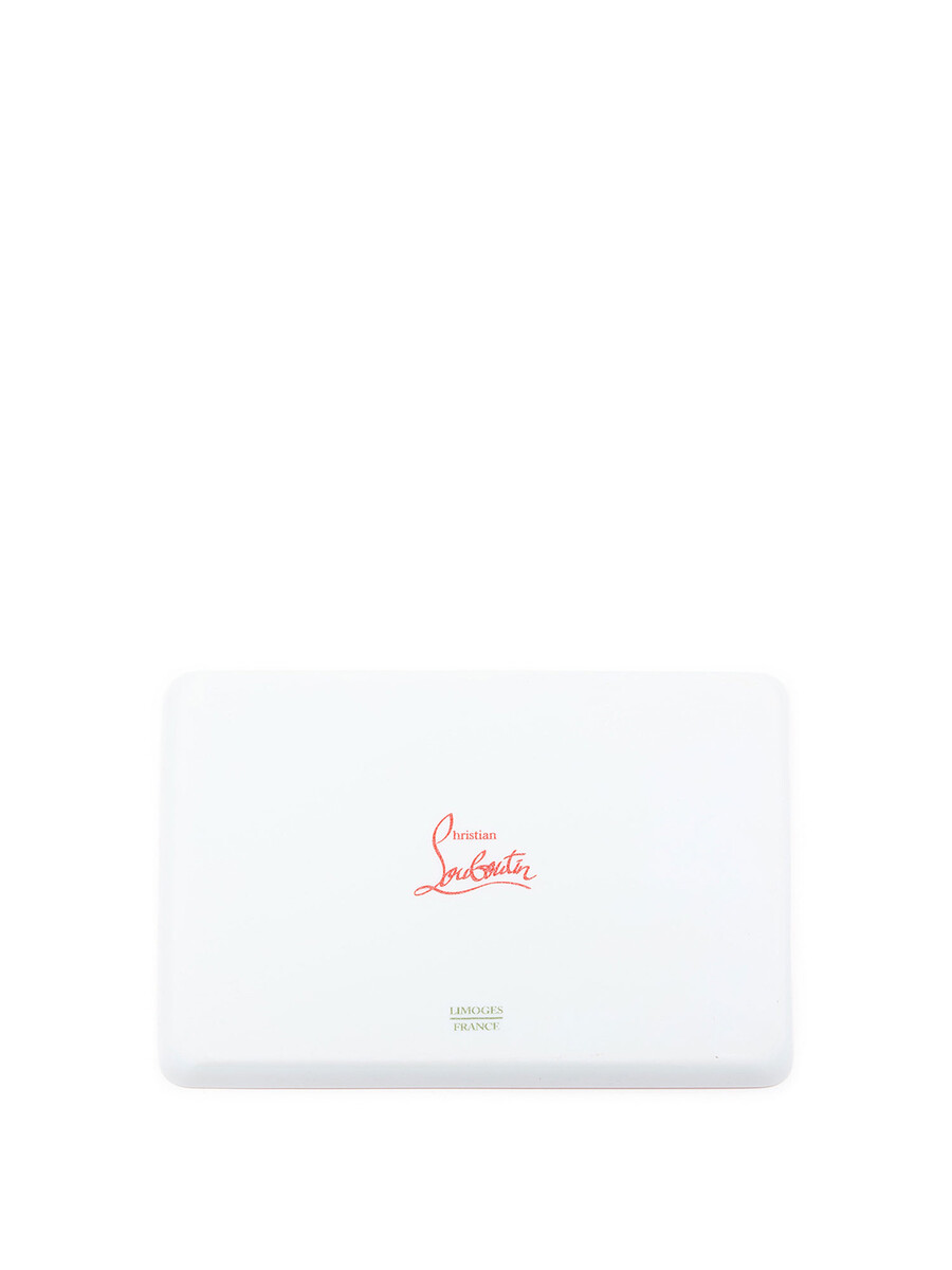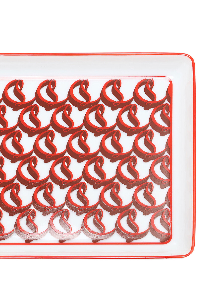 Ceramic platter featuring signature Louboutin red pattern in red and white.