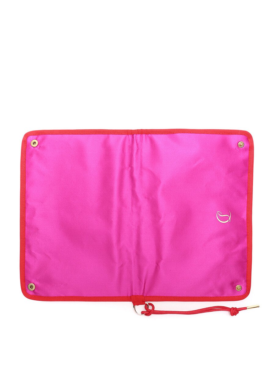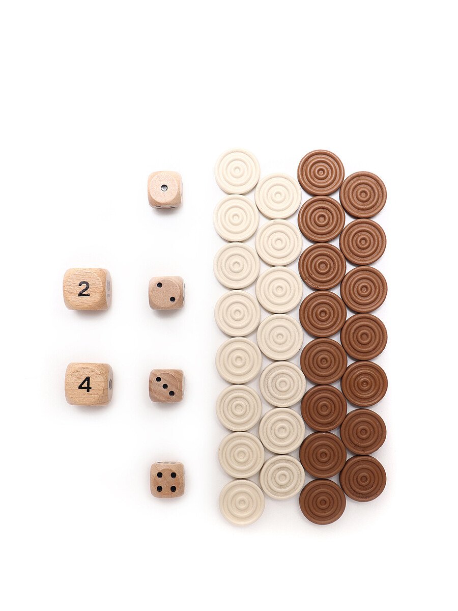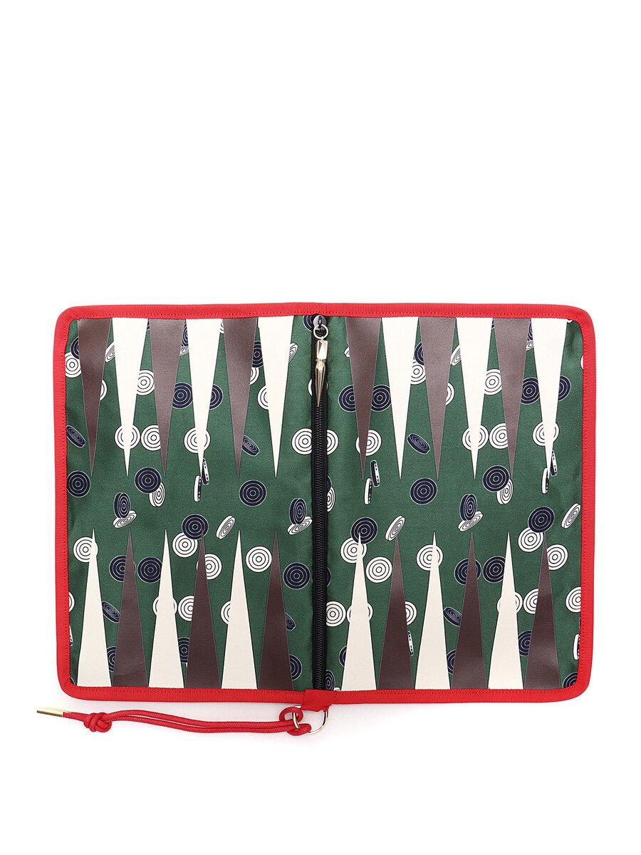 Luxurious backgammon set featuring a geometric motif in green, black, white, and red. Gold-tone signature hardware with a secure zipper closure. Comes with a box, game pieces, and a storage bag.