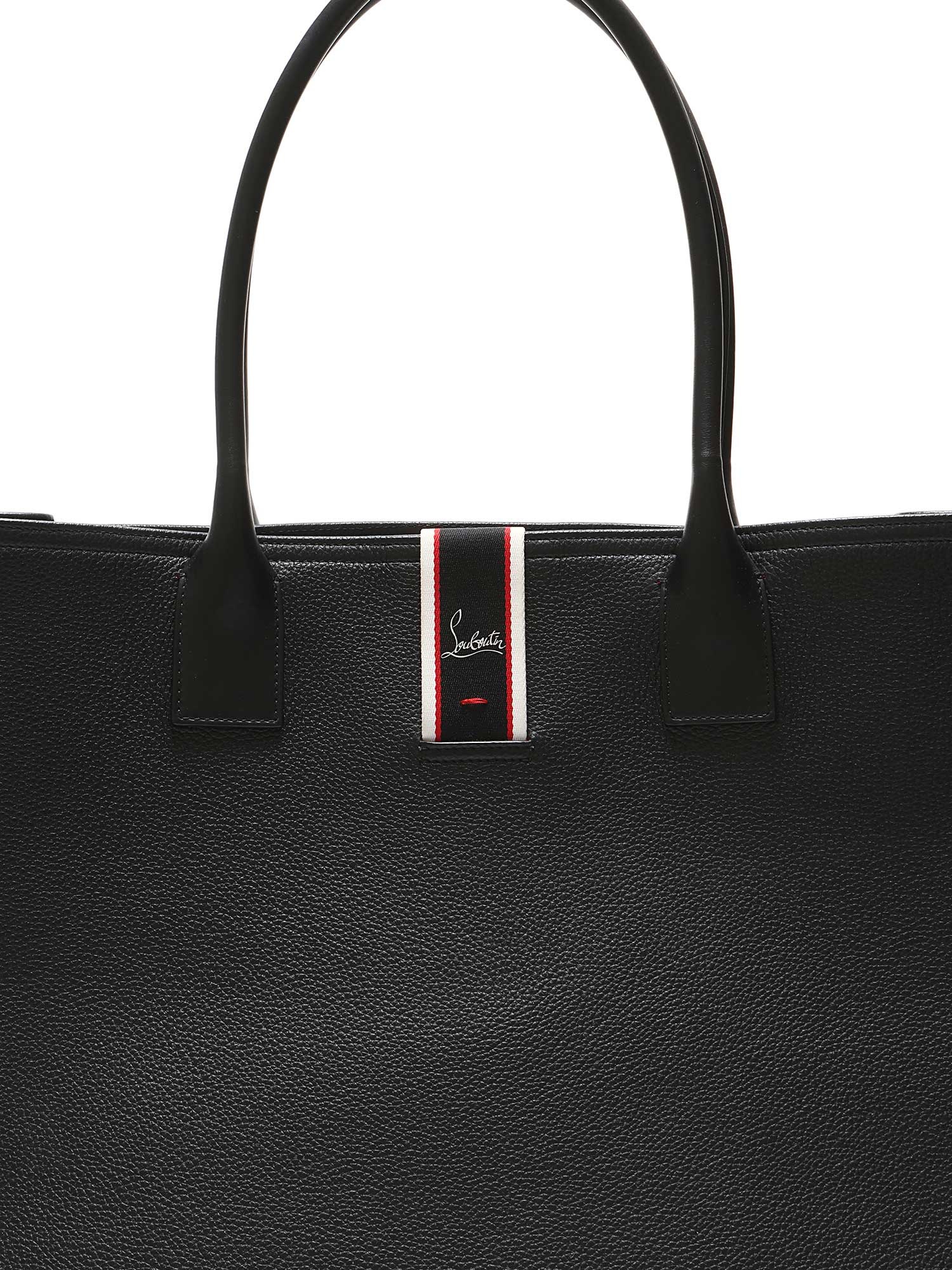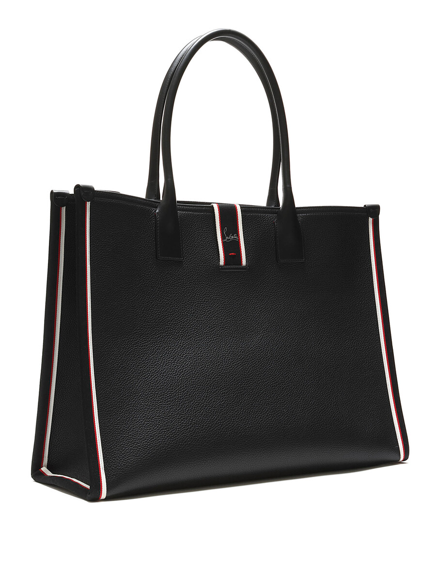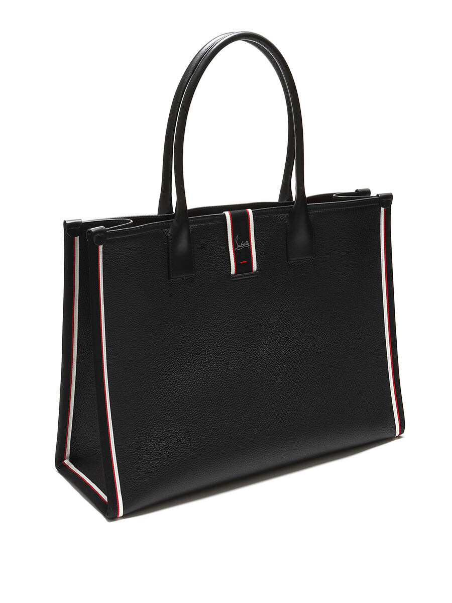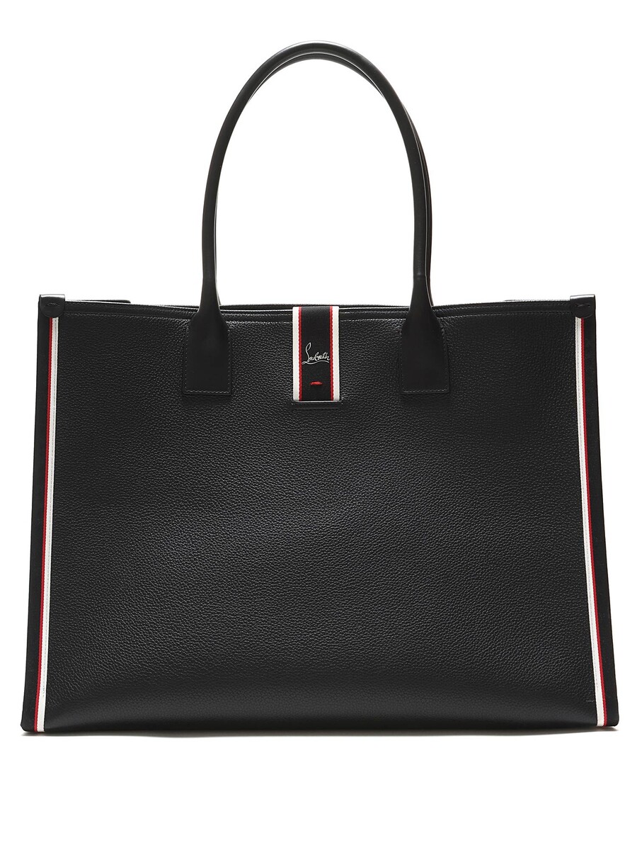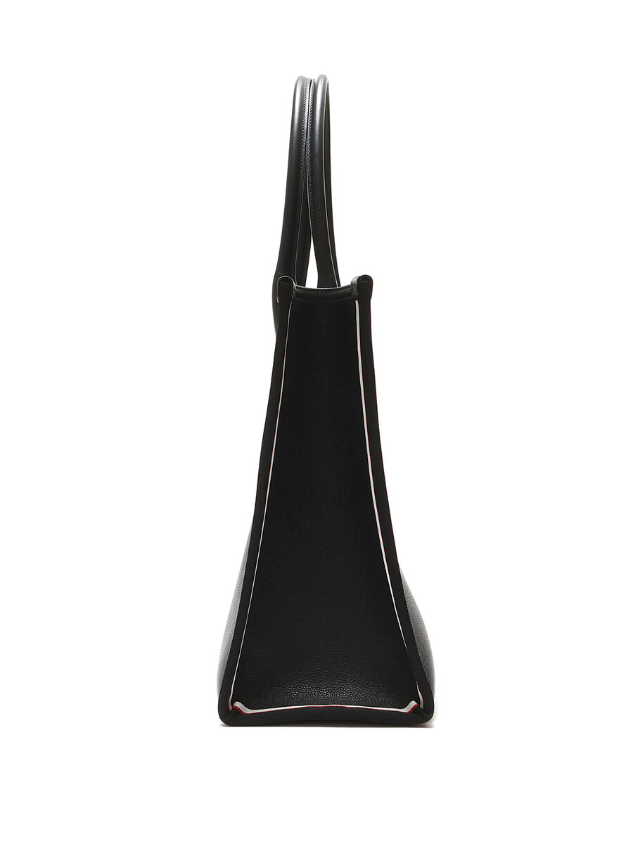 Two-tone leather tote bag with a striped pattern in black, red, and white. Magnetic button closure. Dual rolled leather handles. Silver-tone hardware.