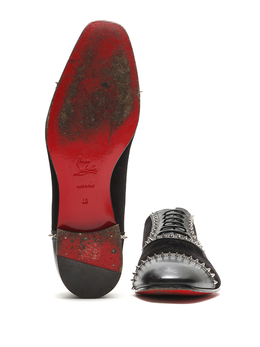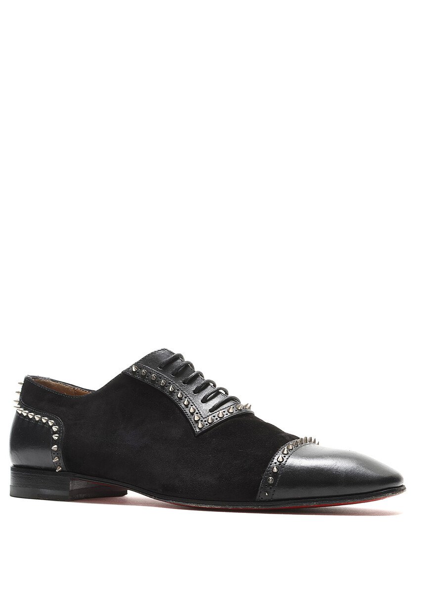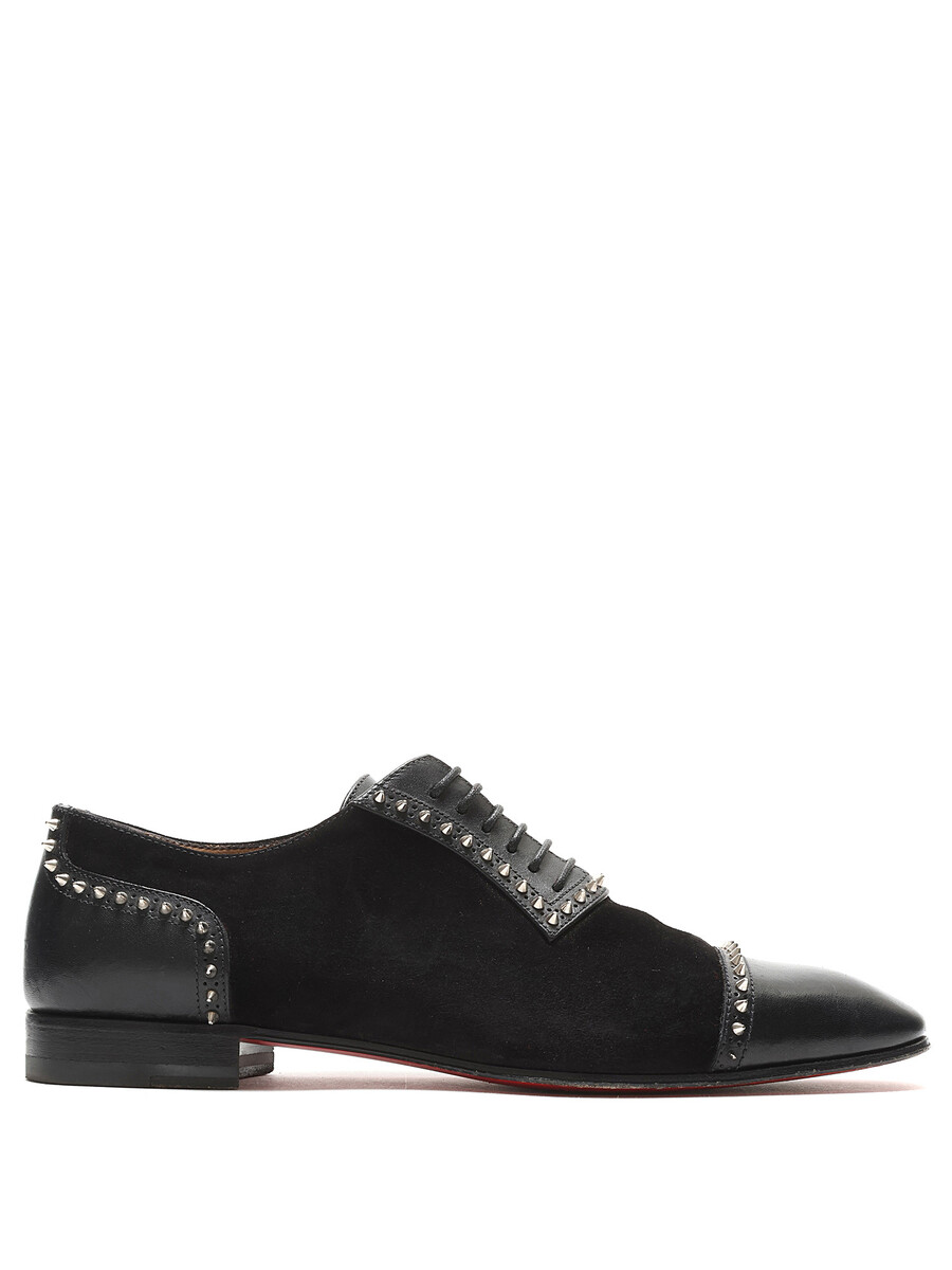 Suede Oxford shoes with metallic spike detailing in black and red. Features a lace-up closure, closed round toe, and leather sole. Comes with the iconic red dustbag.