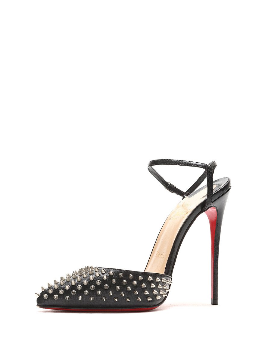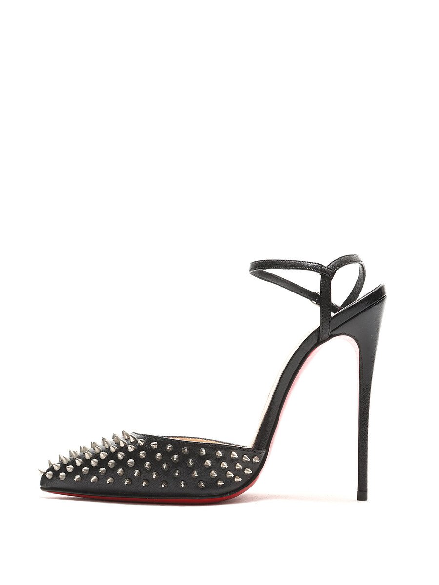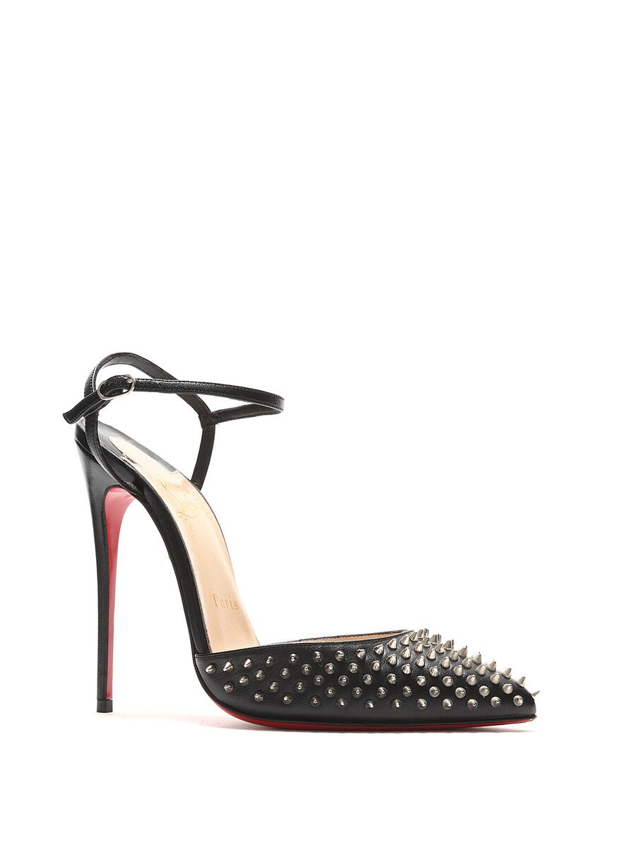 Black leather pointed toe pumps with metal spike detailing and signature red sole. Adjustable buckle closure at ankle. Comes with dustbag.