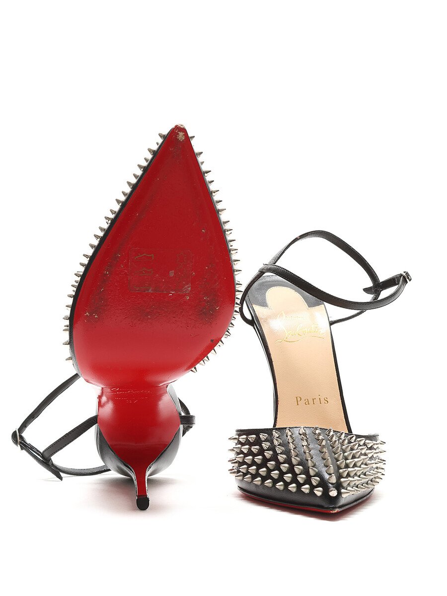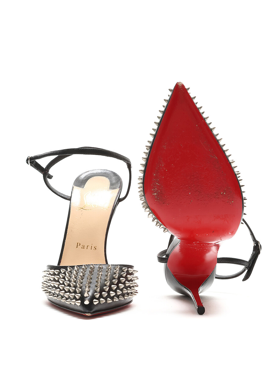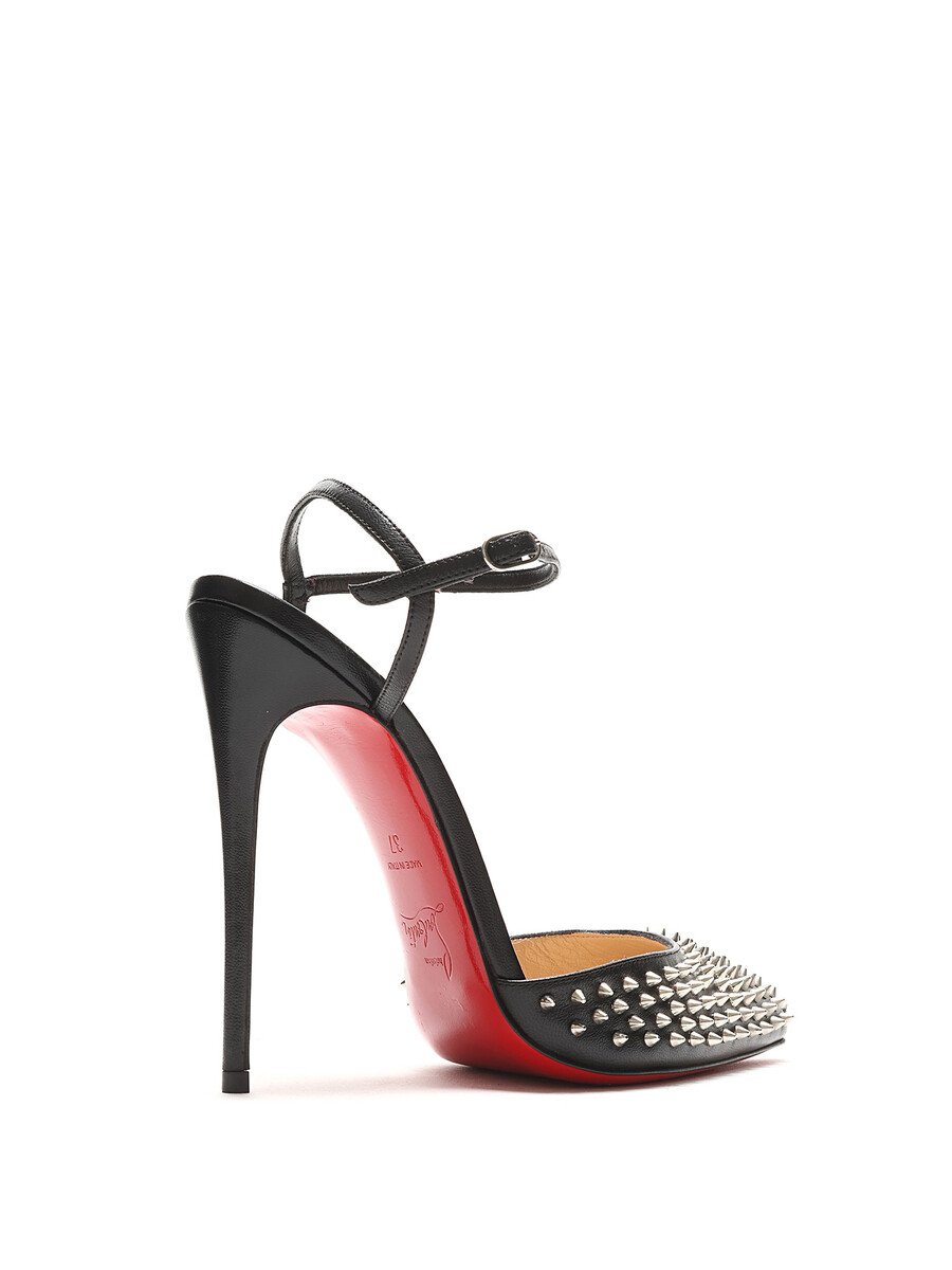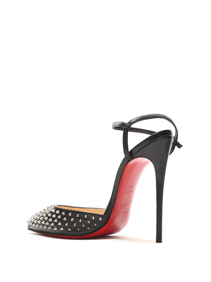Black leather pointed toe pumps with metal spike detailing and signature red sole. Adjustable buckle closure at ankle. Comes with dustbag.
