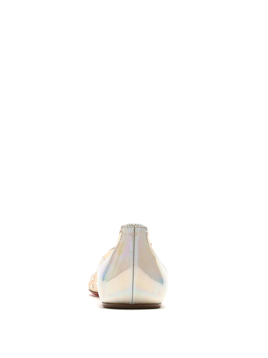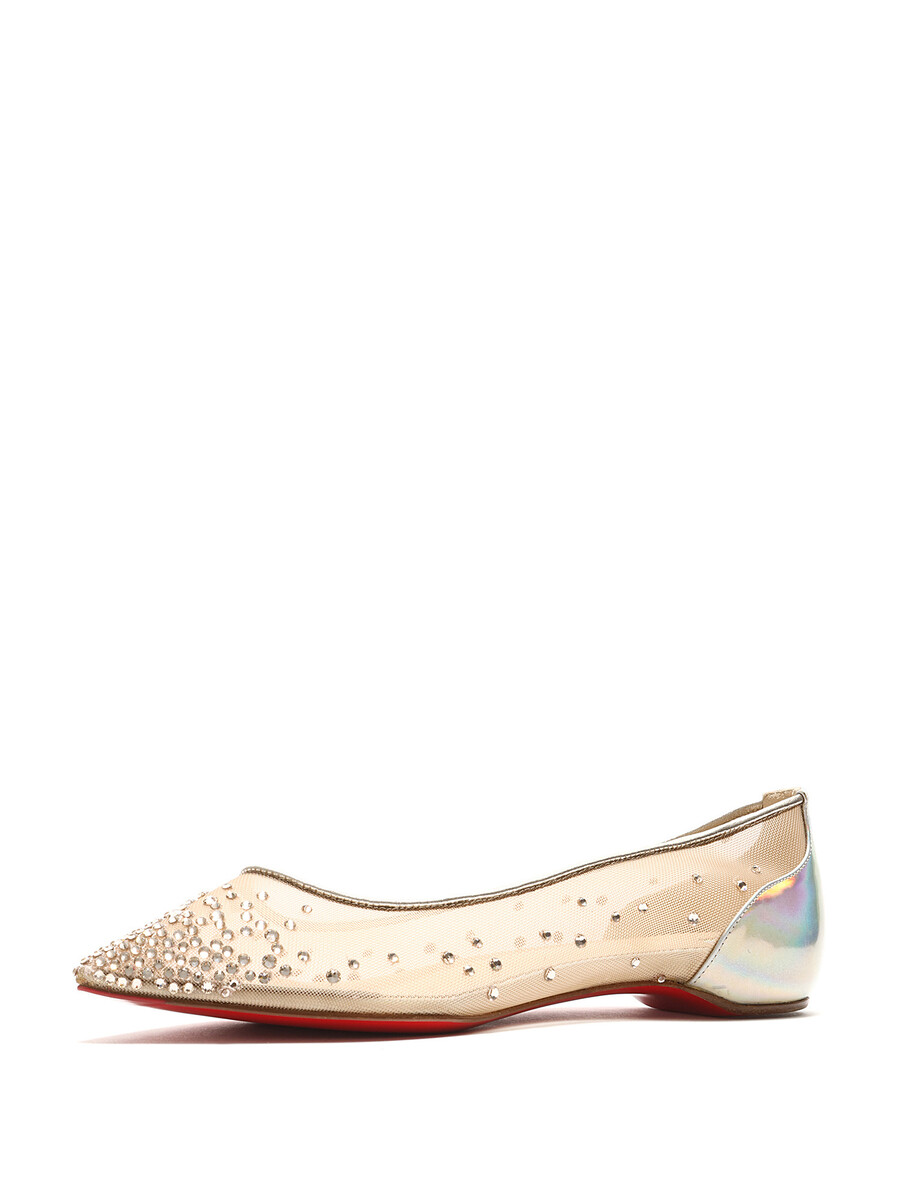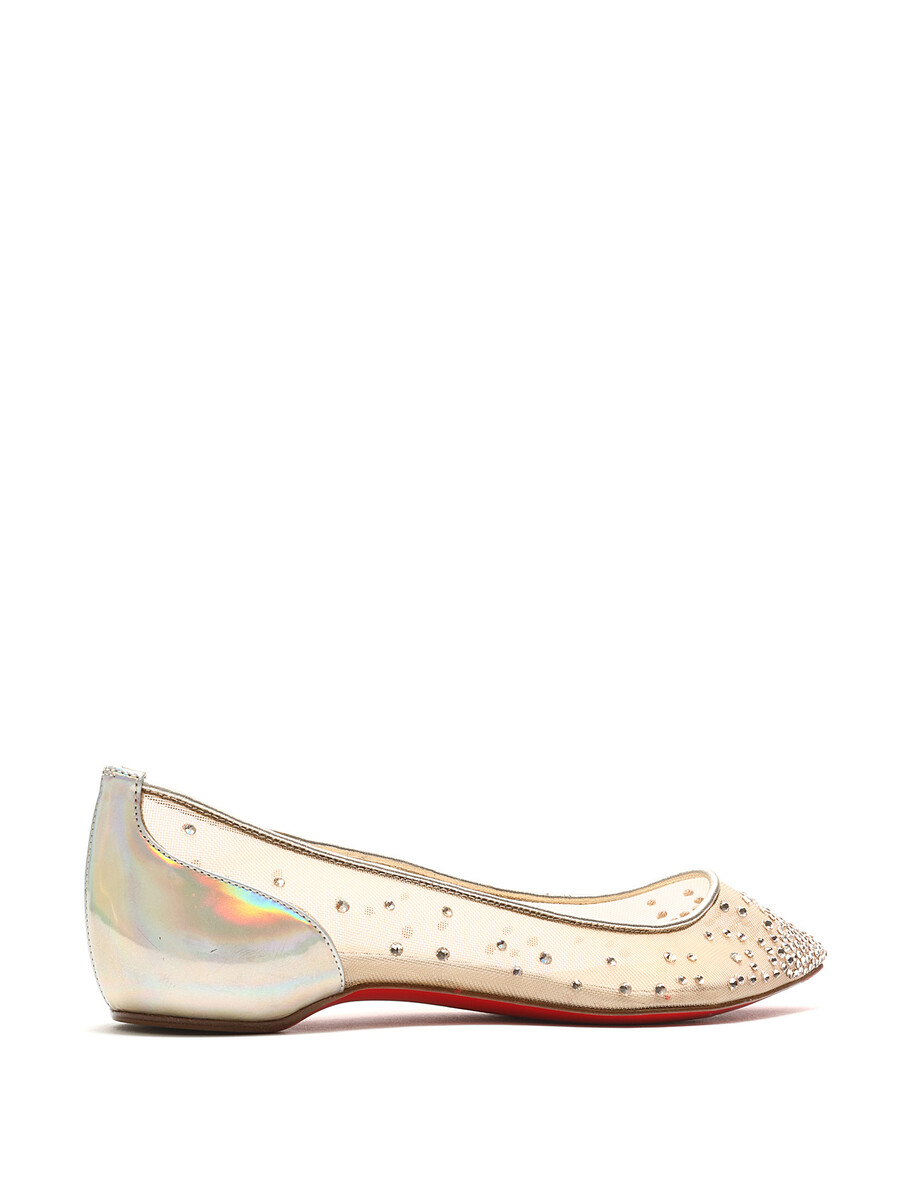 Mesh ballerina flats with embedded rhinestones. Pointed toe. Signature red leather sole.