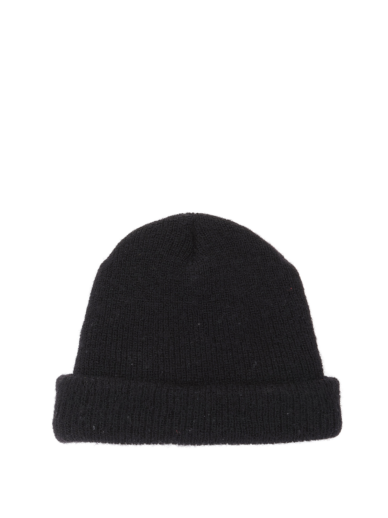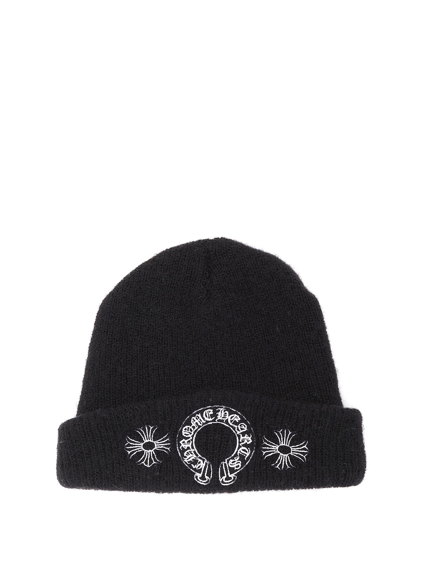 Black wool beanie with embroidered white logo.