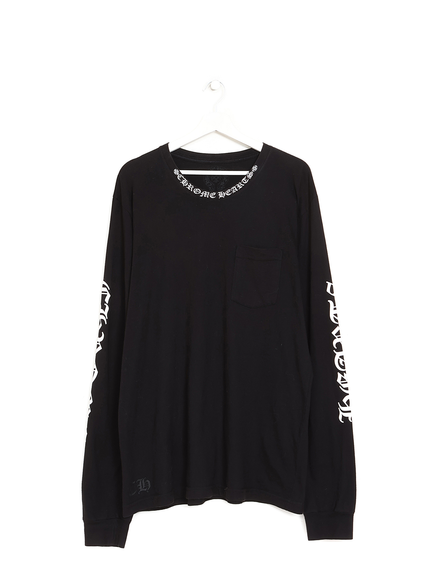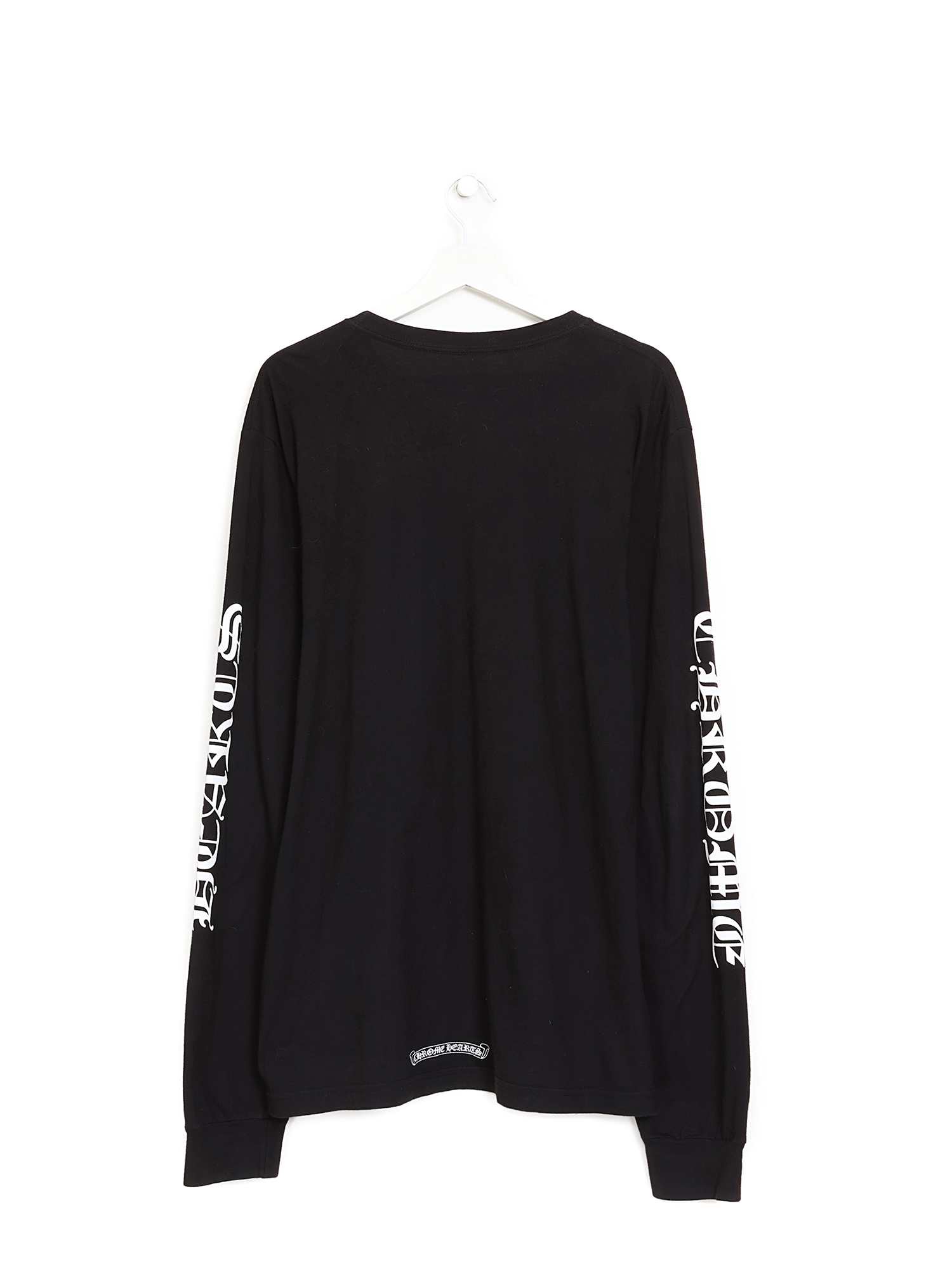 Long sleeve t-shirt in black featuring graphic logo print in white. Round collar.