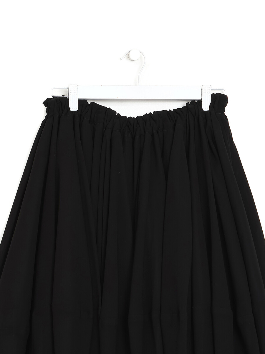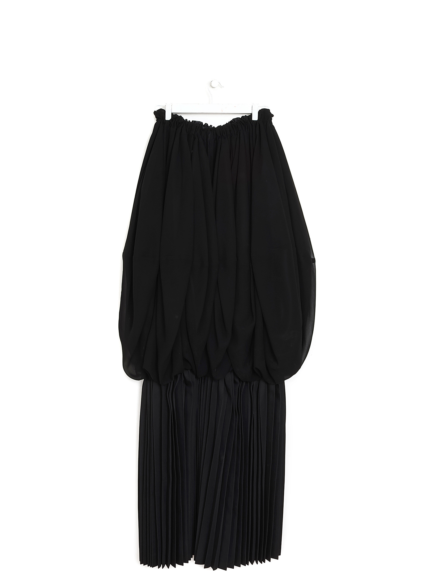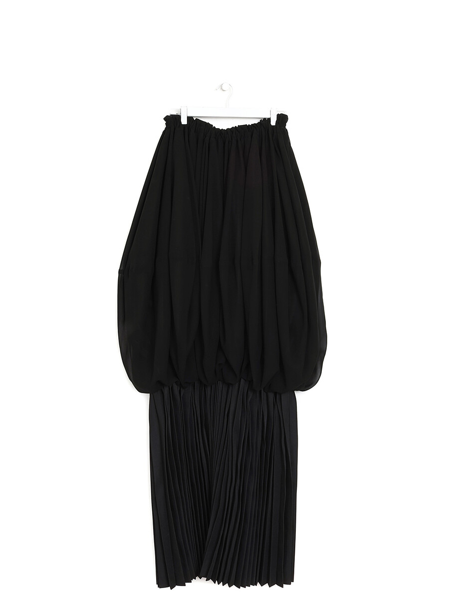 Oversized pleated maxi dress in black. Elasticized rounded collar.