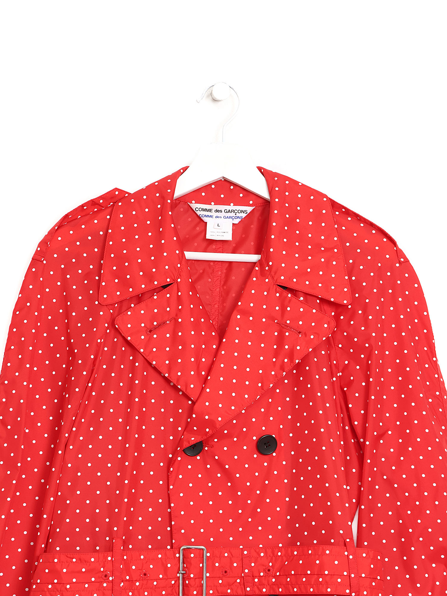 Double-breasted nylon trench coat in vibrant red with playful white polka dot motif. Adjustable belt at waist for a tailored fit.