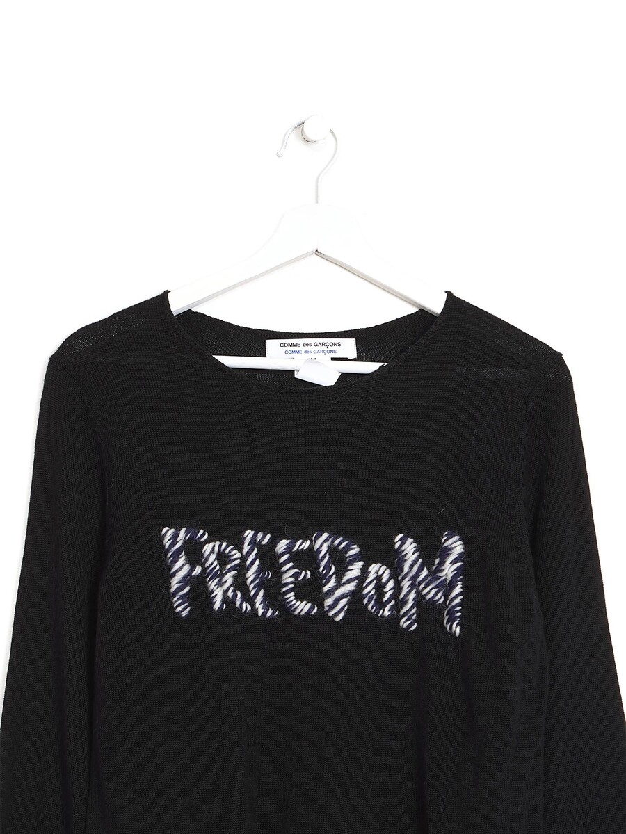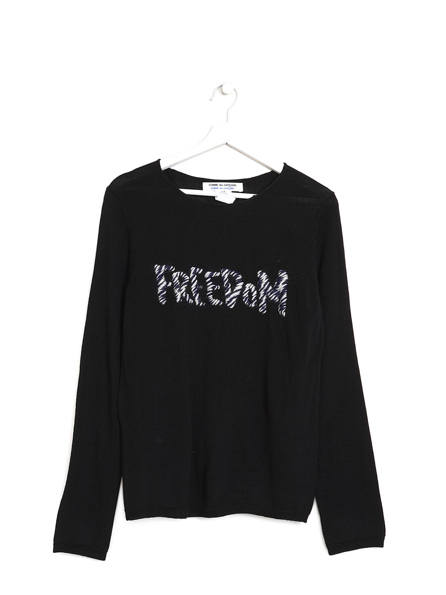 Graphic text sweater in a blend of black, blue, and white tones. Crew neckline.