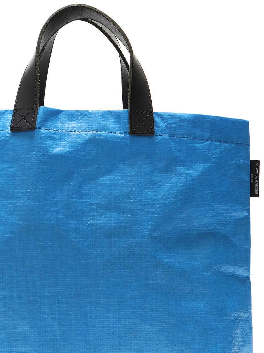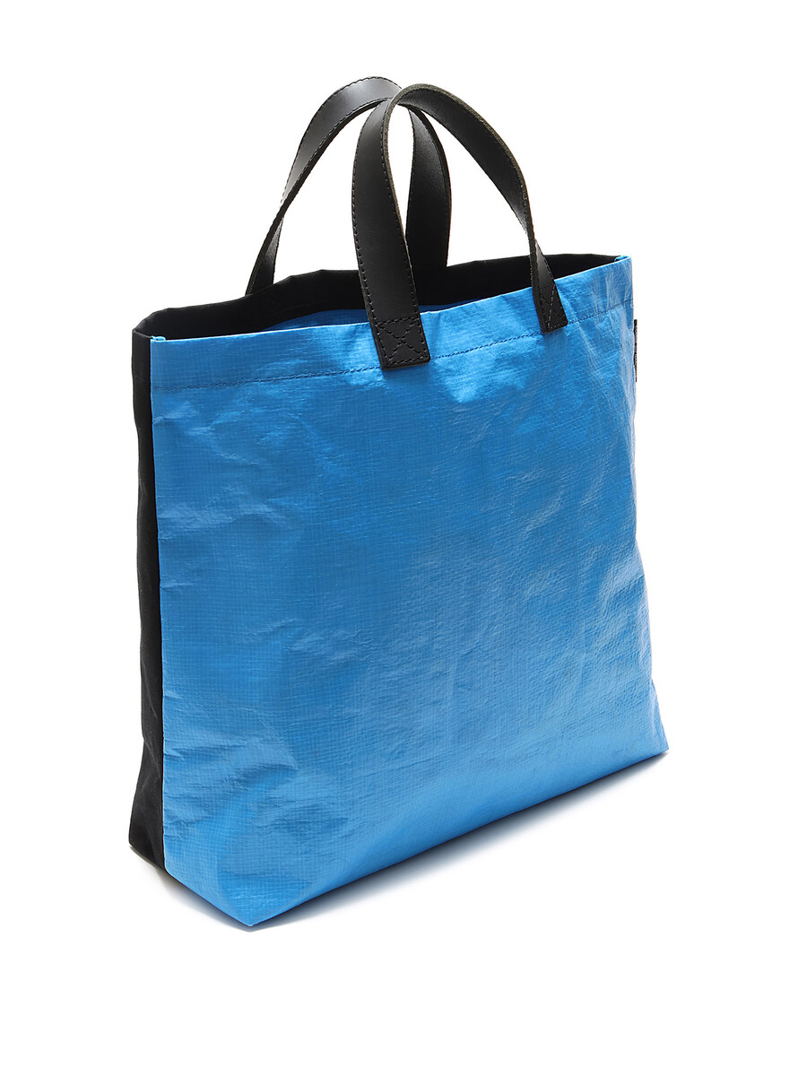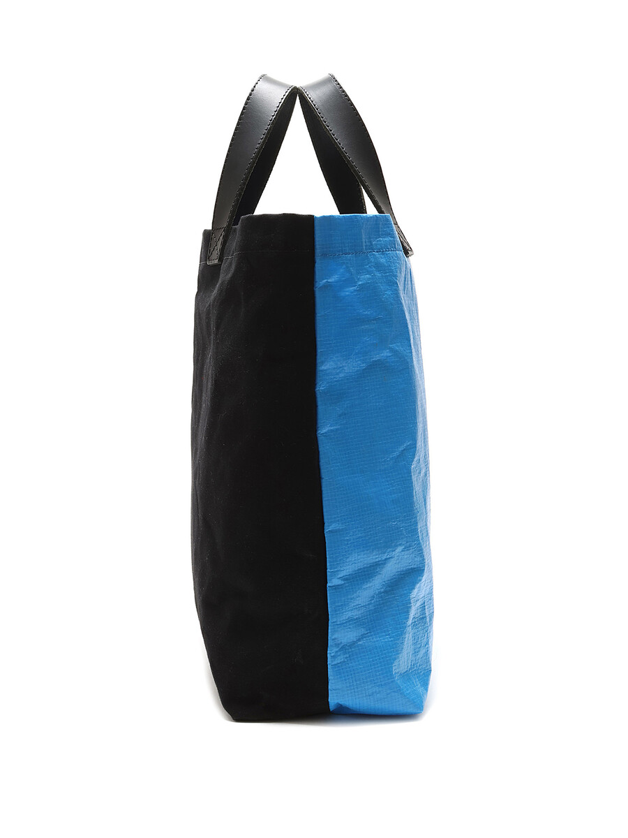 Two-tone synthetic tote bag with a contrasting design in blue and black. Black handles. Spacious interior for daily essentials.
