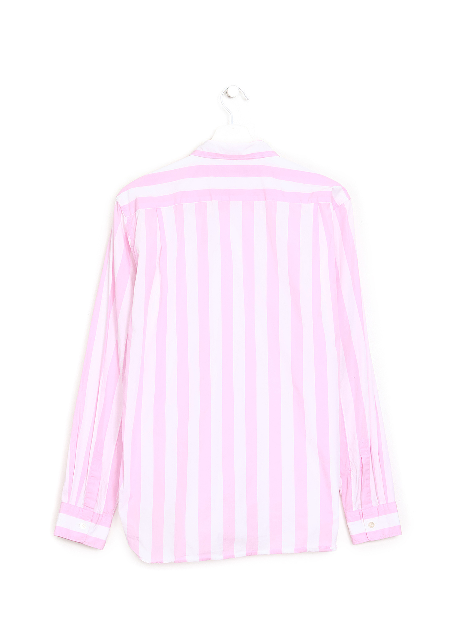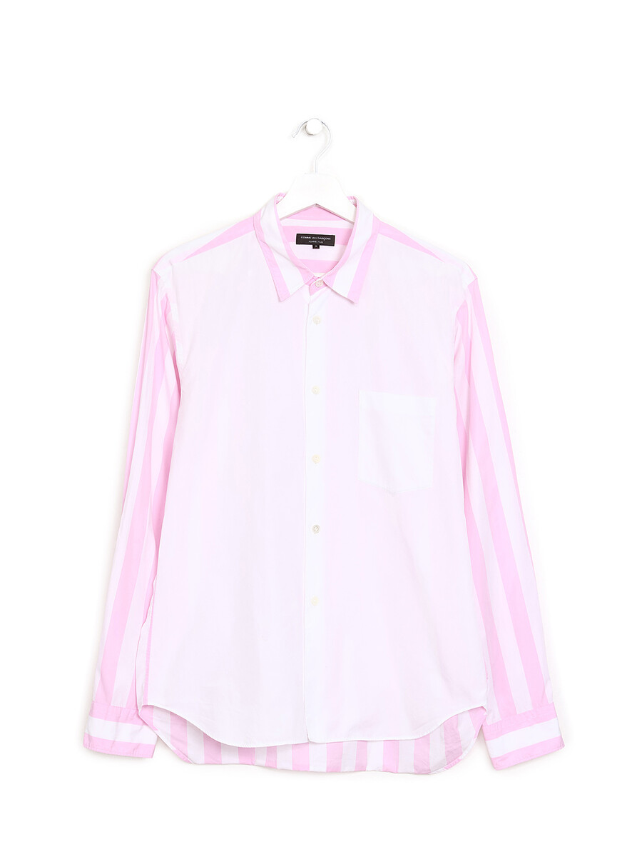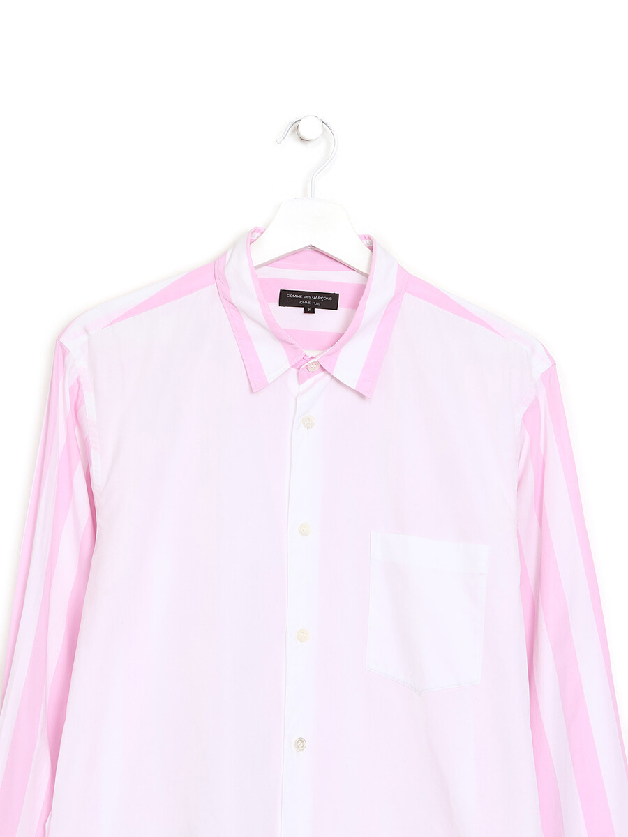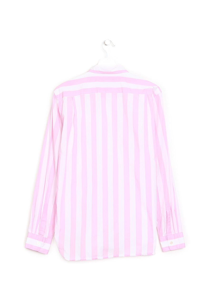 Long sleeve striped shirt in white and pink. Button closure. Classic collar. Patch pocket.