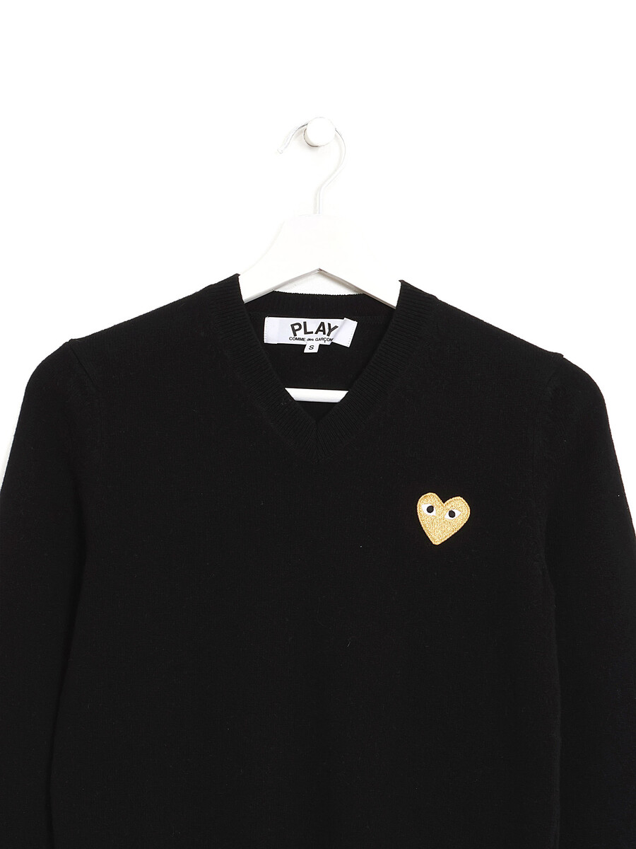 V-neck knit sweater in black with long sleeves and heart logo at chest.