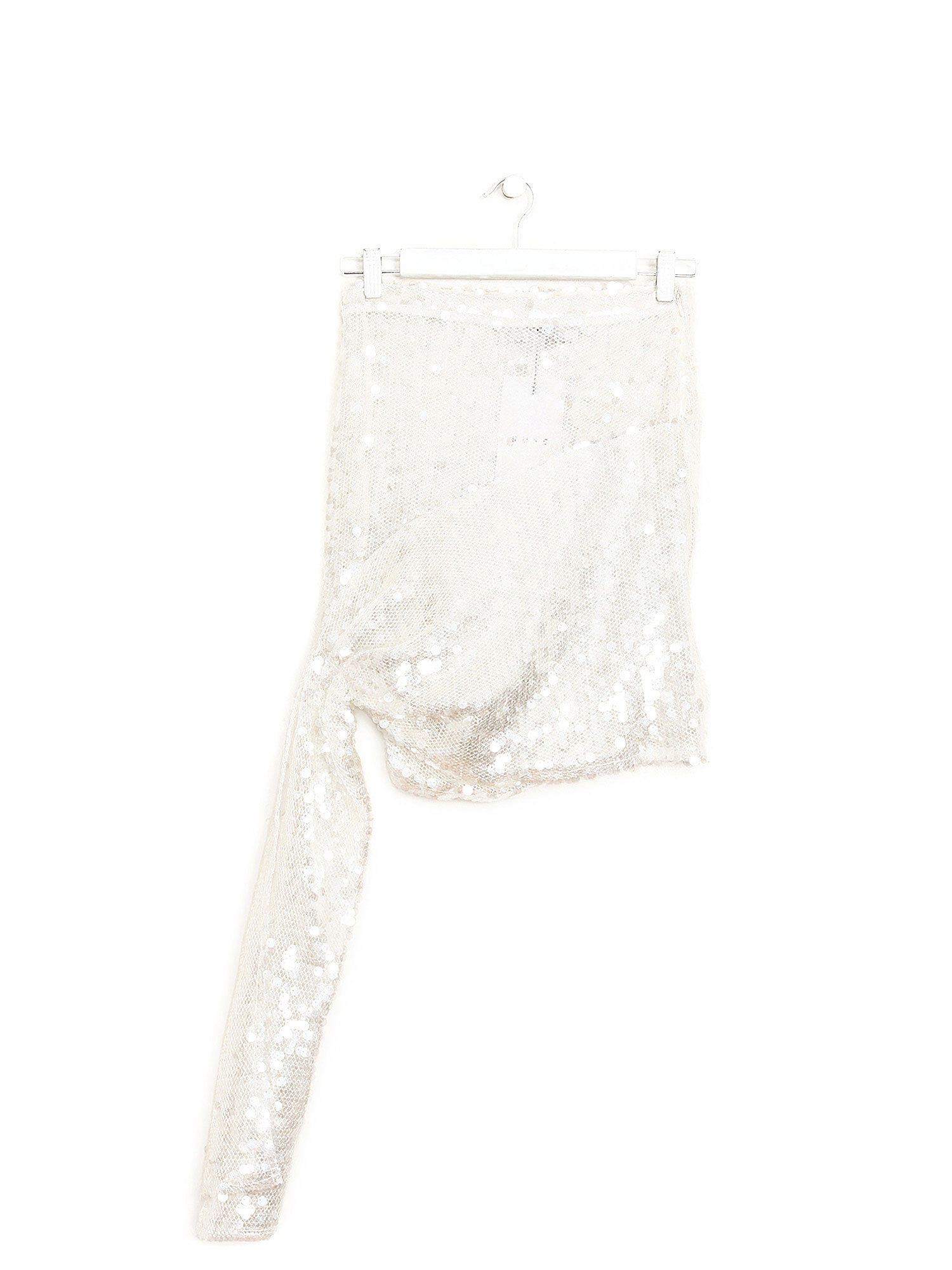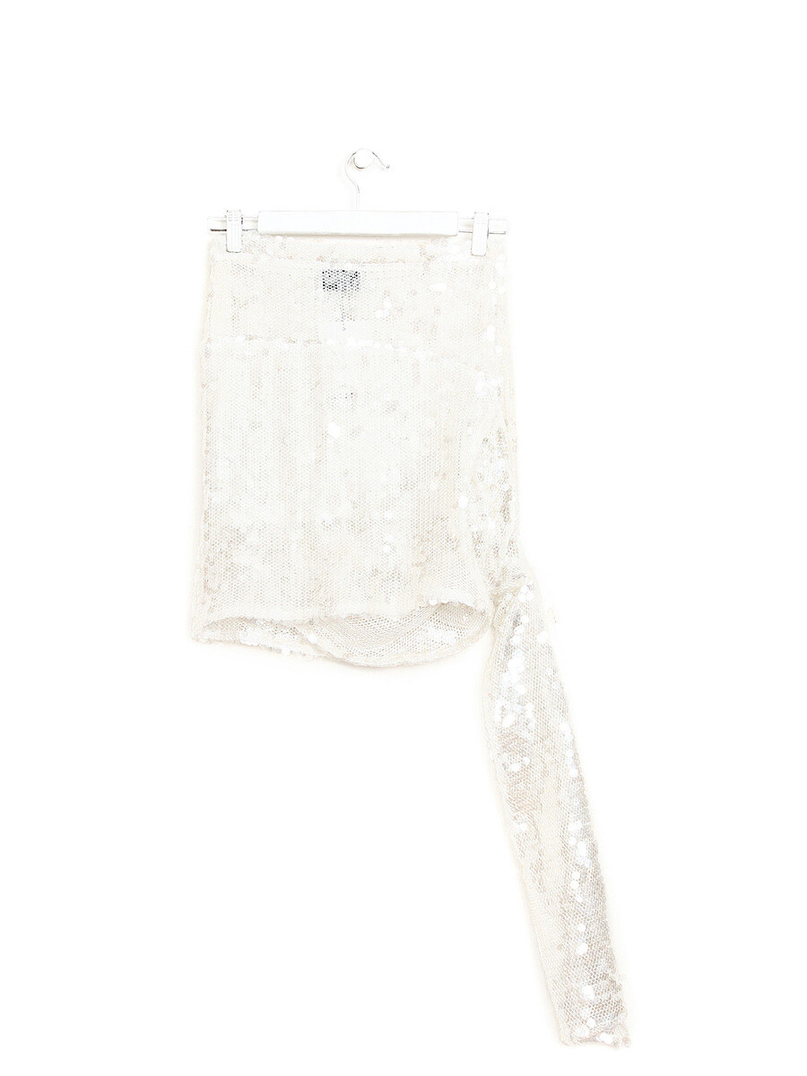 Sequin skirt with leg panel detailing in a shimmering finish. Knot detailing adds a twist to its silhouette.
