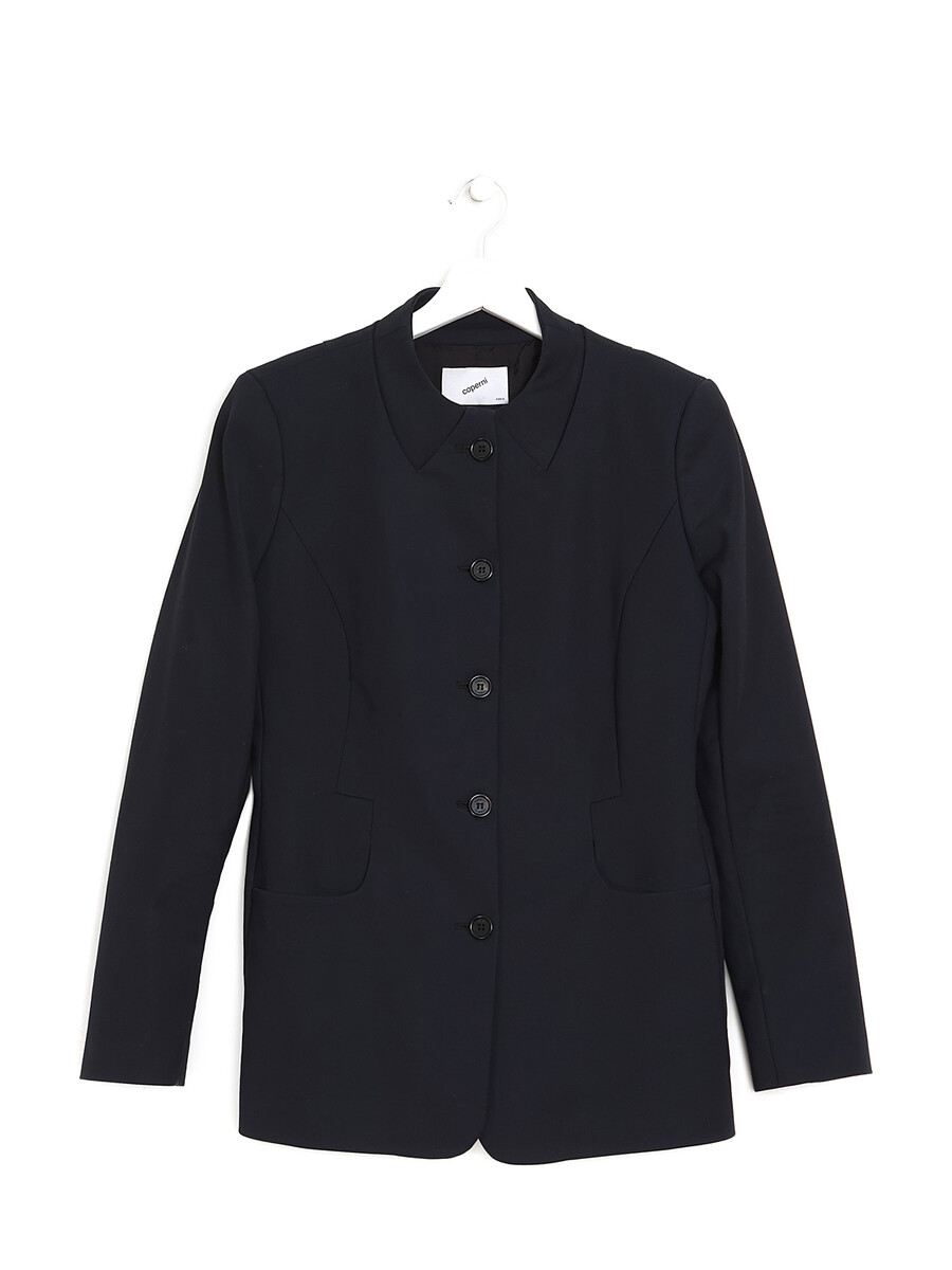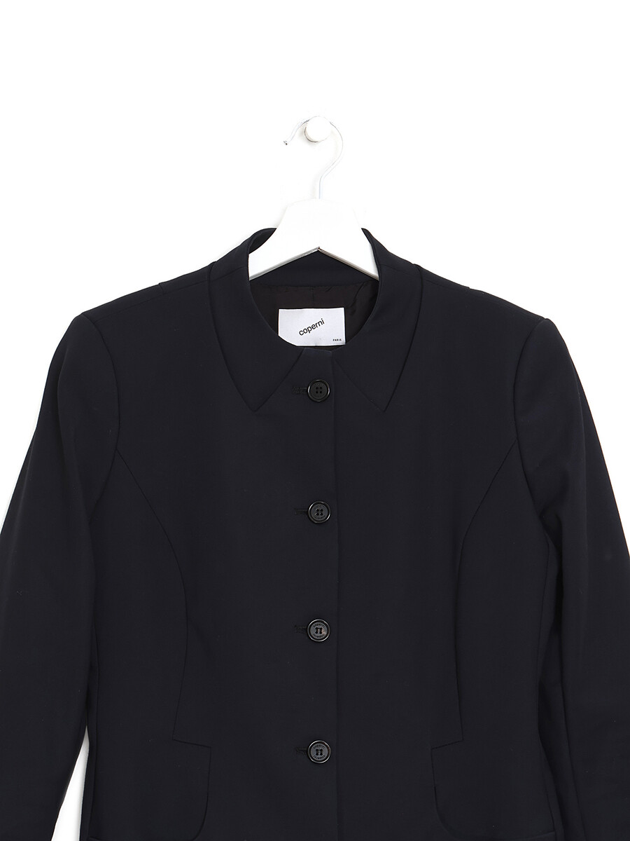 Long sleeve tailored jacket in stretch fabric with button closure. Lapel collar.