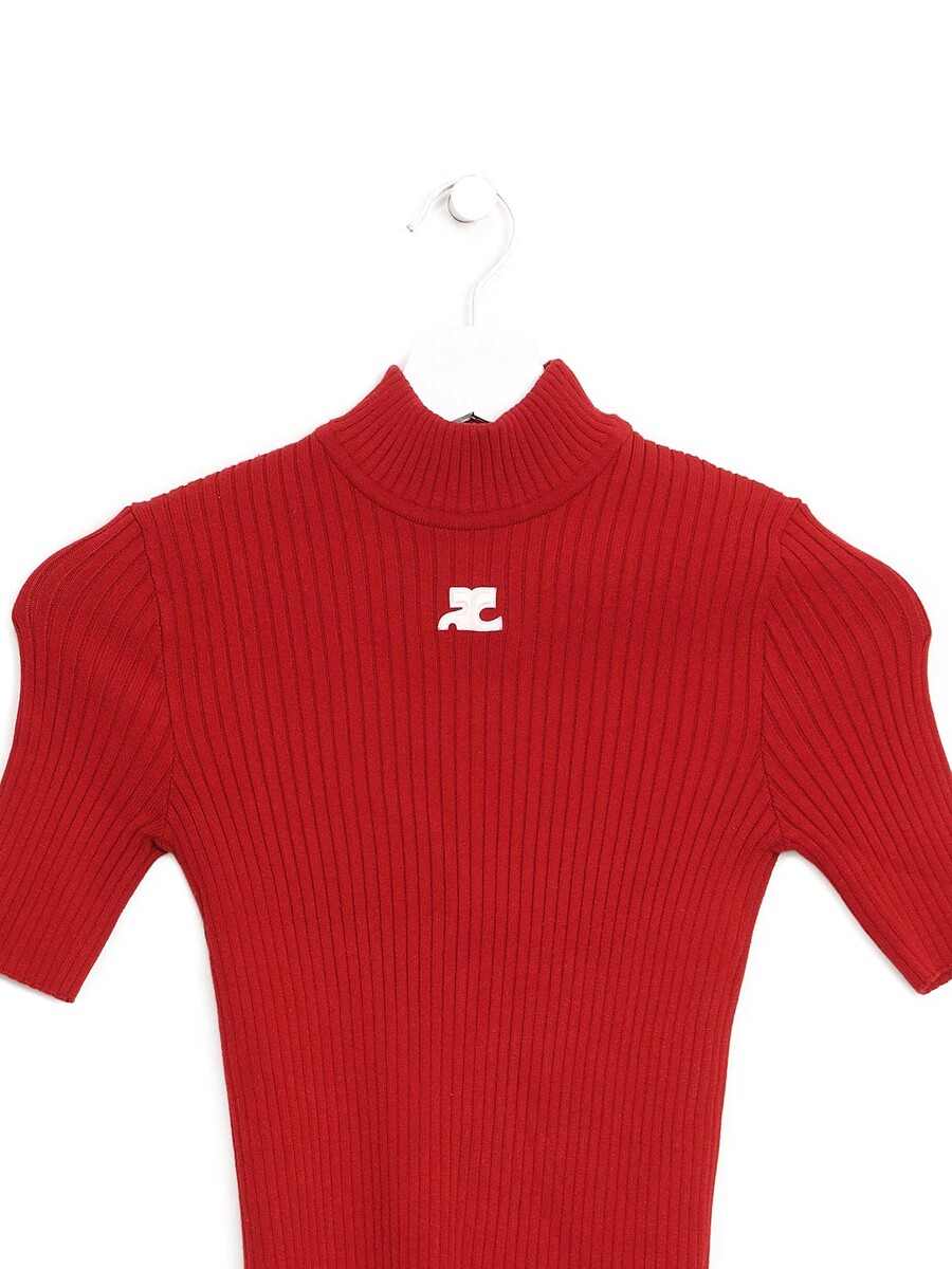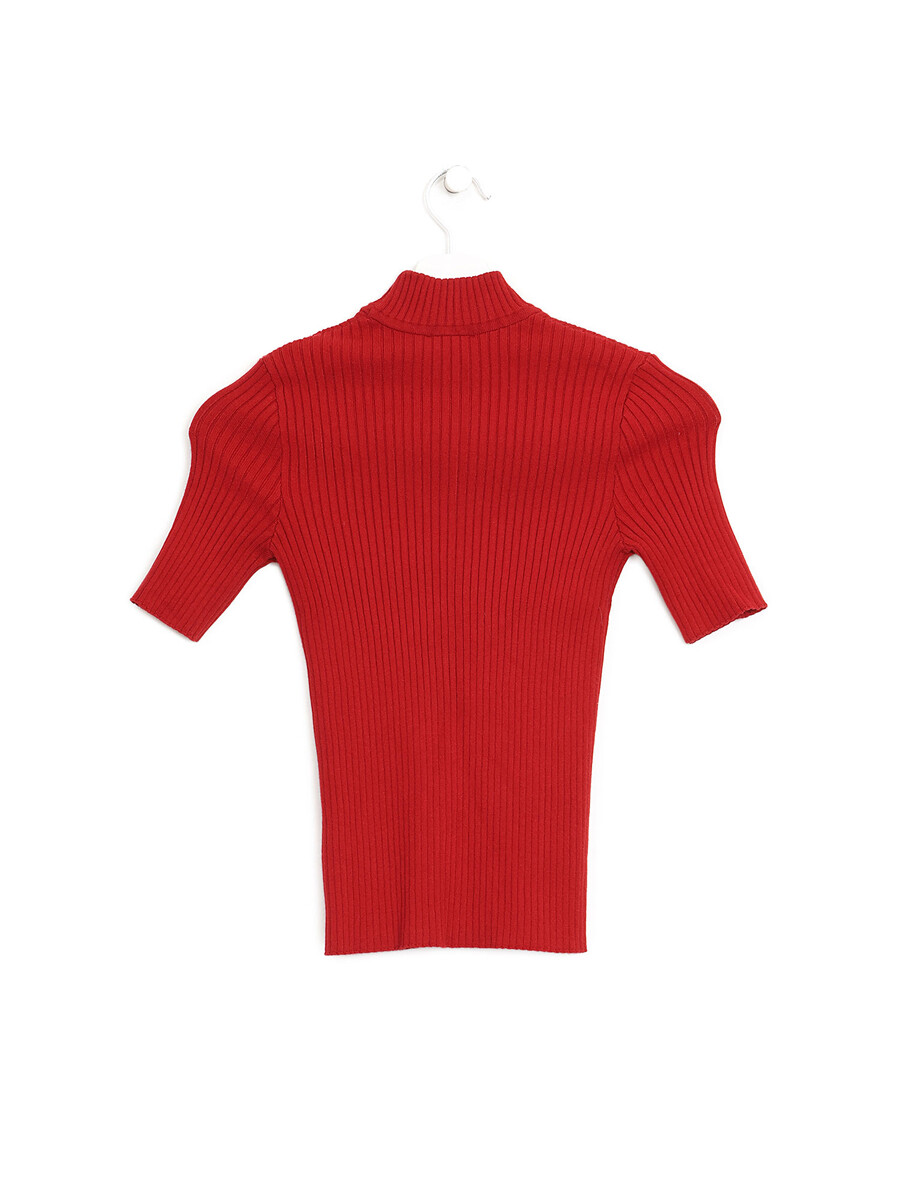 Short sleeve ribbed knit sweater in red and white. High neckline. A fitted silhouette with a timeless style.