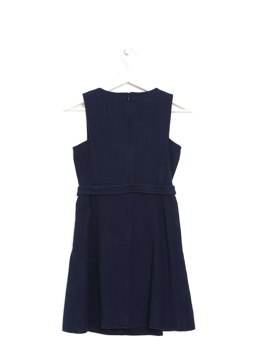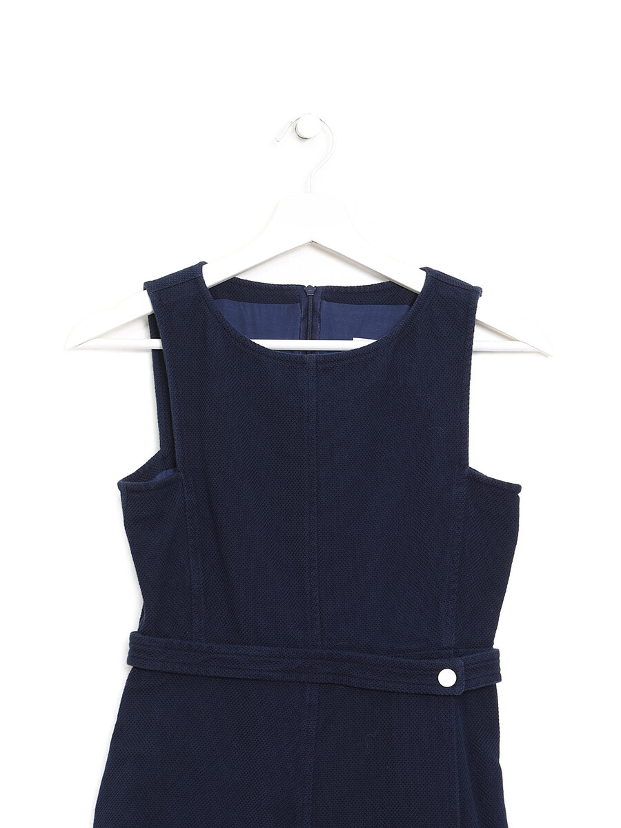 Sleeveless navy blue dress featuring a zip closure at back and a belted waist.