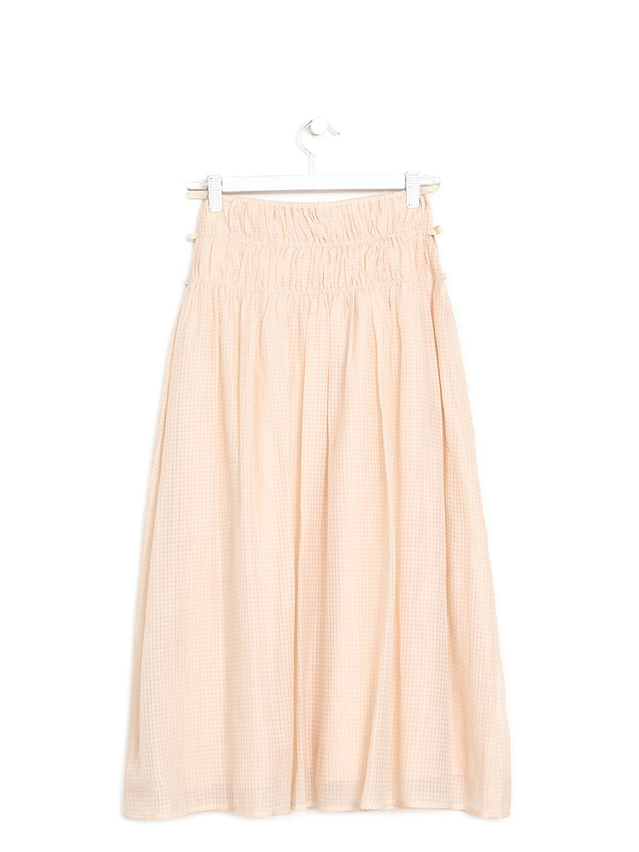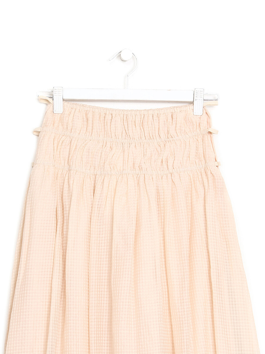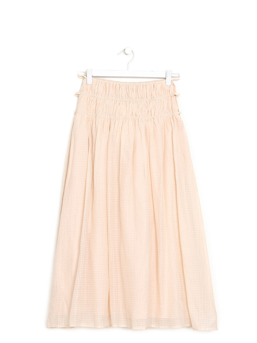 Tiered skirt in beige with a square pattern. Elastic waistband featuring side cut-outs. Light and breezy design. Made from a silk-cotton blend.