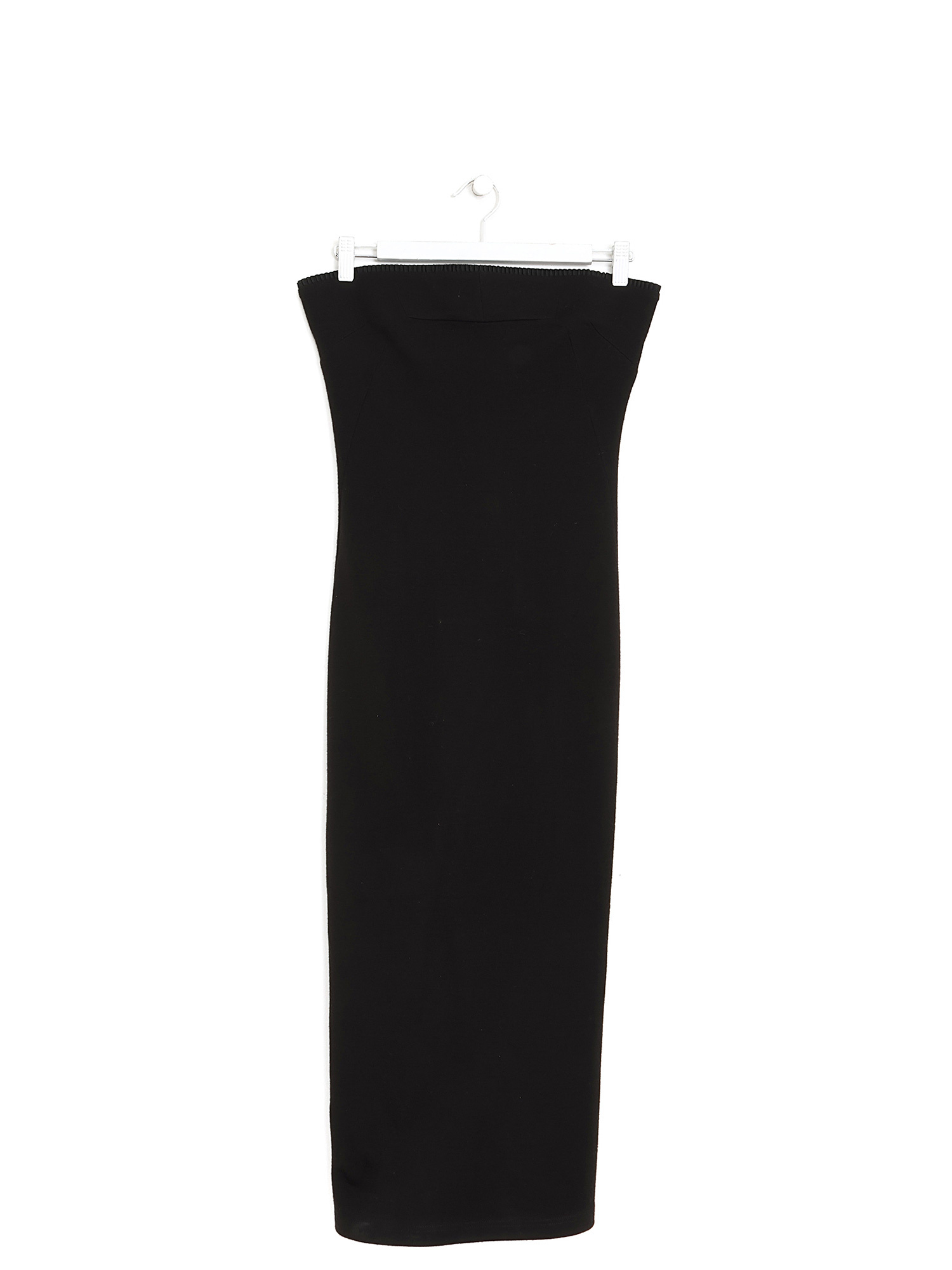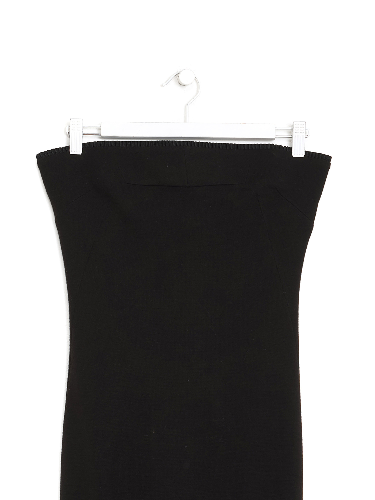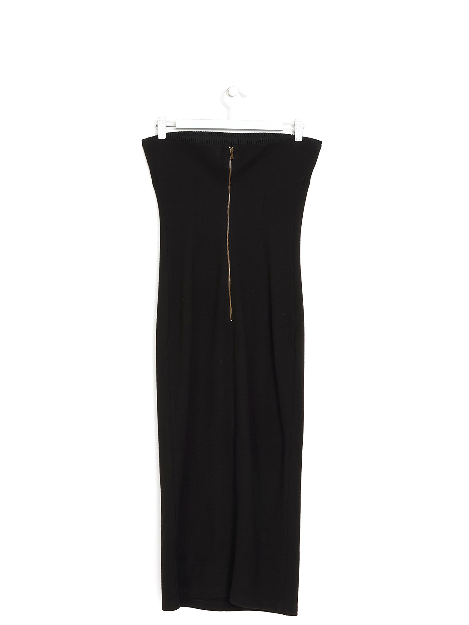 Strapless black mid-length dress with ruffled trim details. Gold-tone zipper closure at the back. Elegant and chic design.