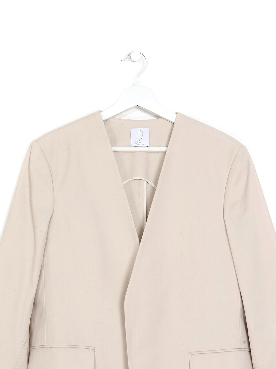 Ivory oversized collarless blazer with V neckline. Hidden button closure. Two flap pockets. Single back vent.