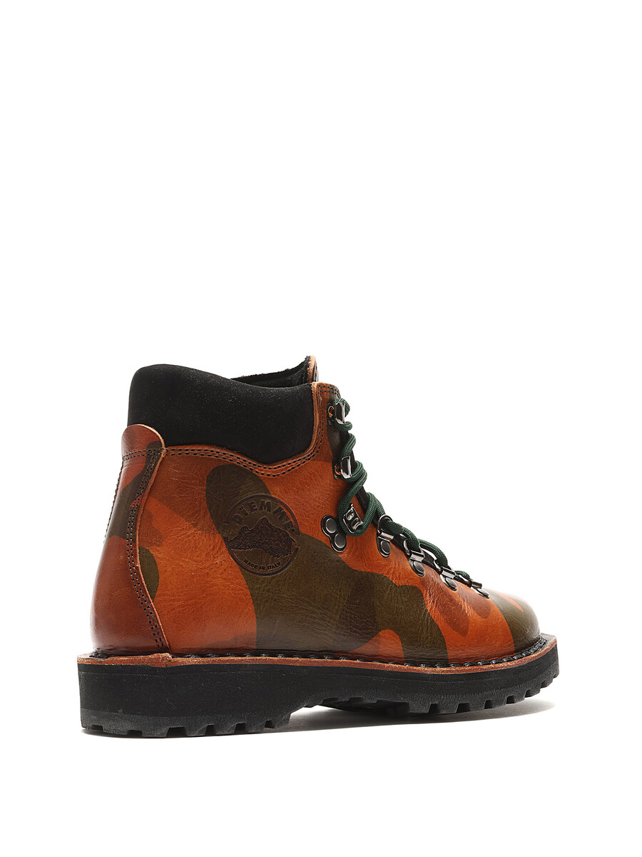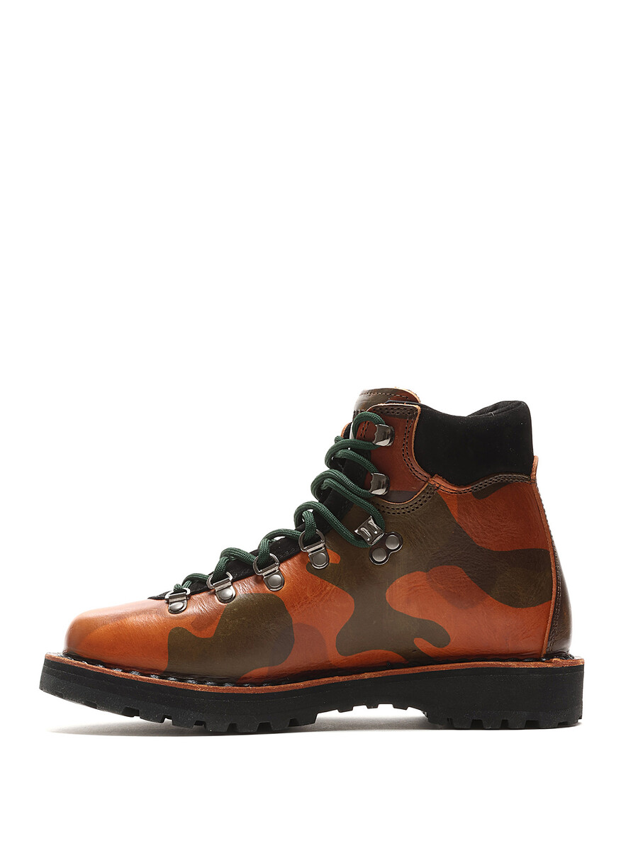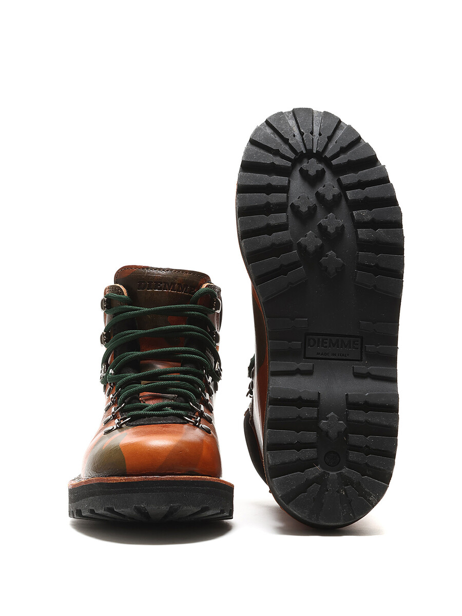 Leather hiking boots with a camouflage pattern in brown and green. Lace-up closure. Round toe style. Rubber lug sole.