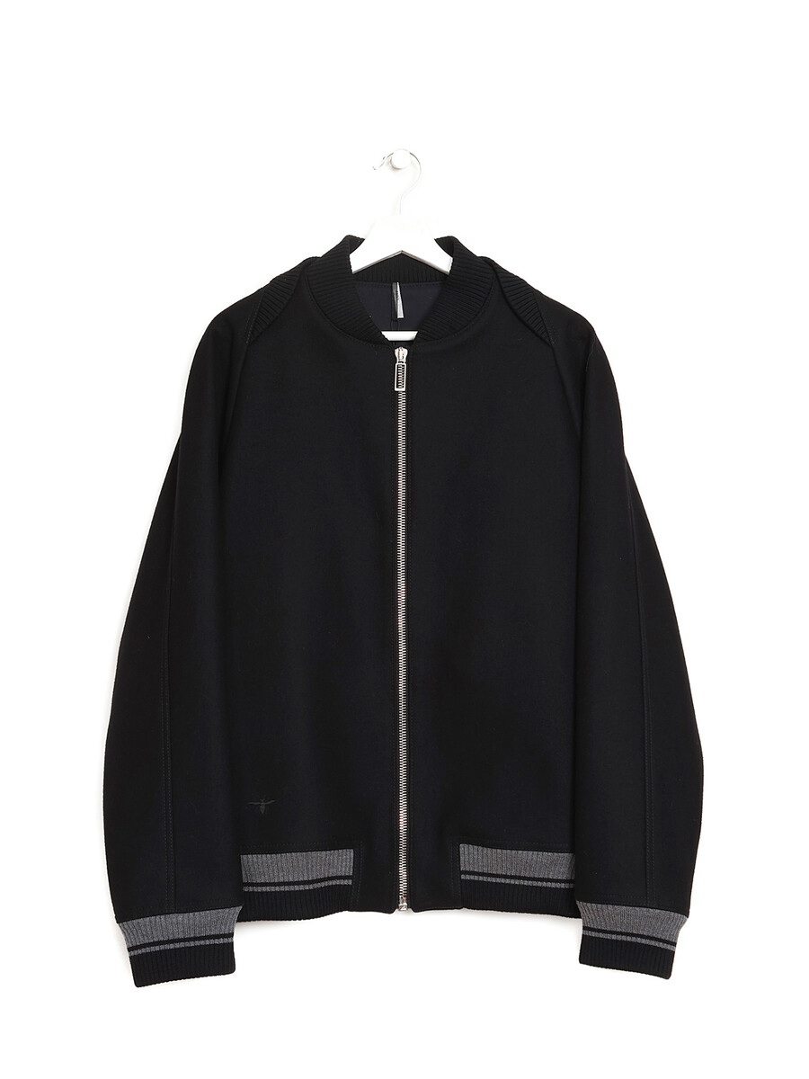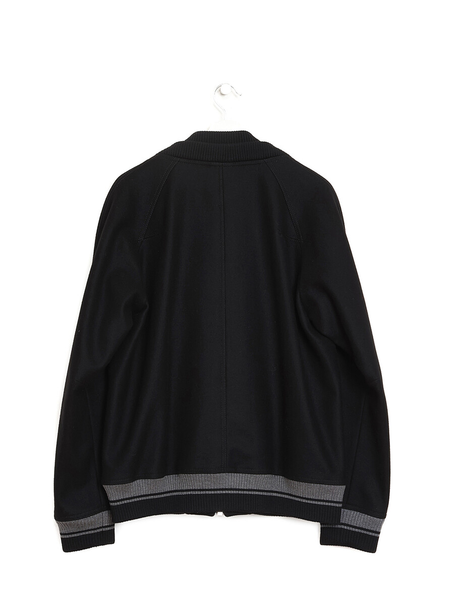 Wool blend jacket in black and grey tones. Features a zipper closure, ribbed 'trompe l'oeil' collar, and two pockets.