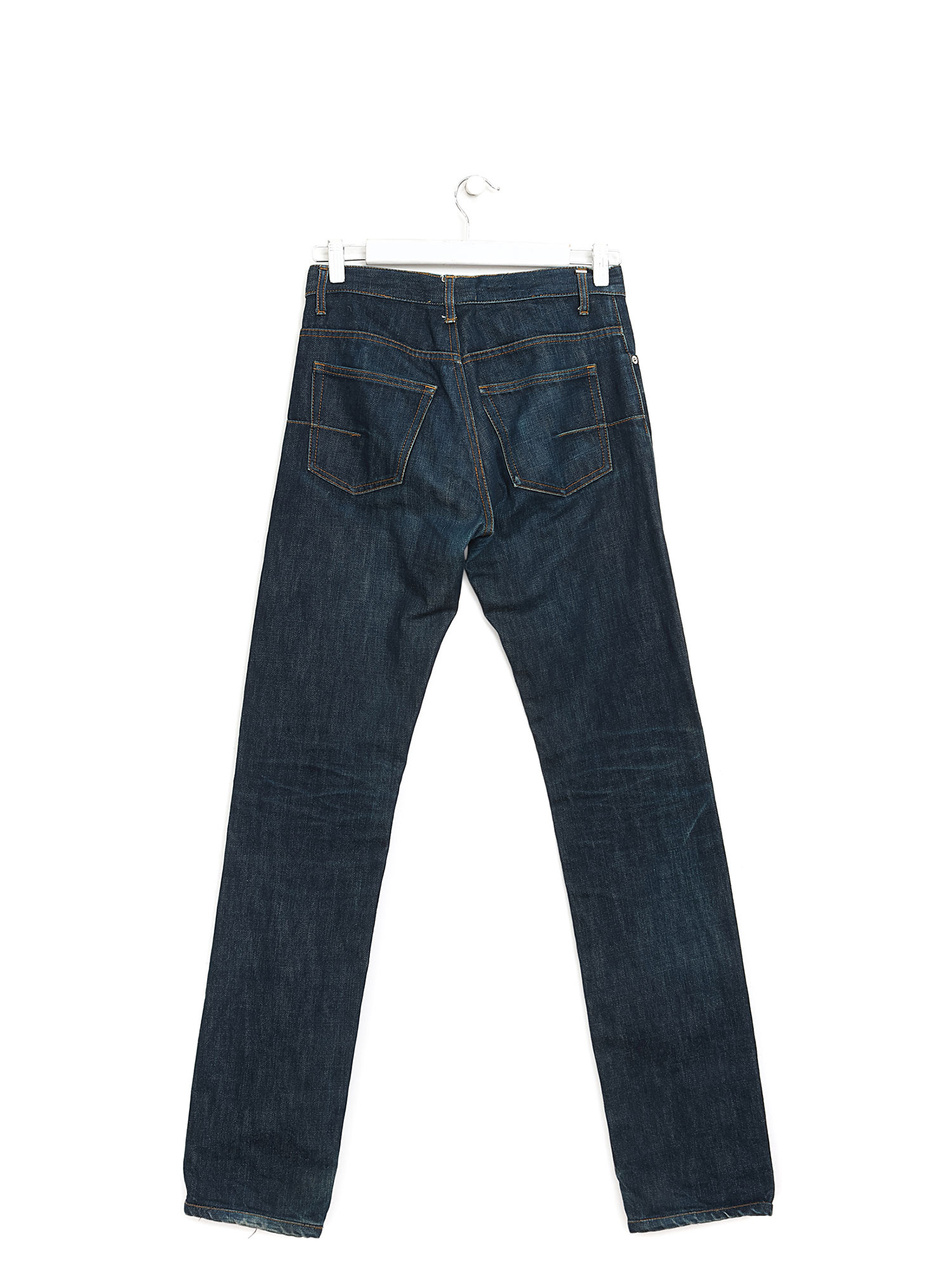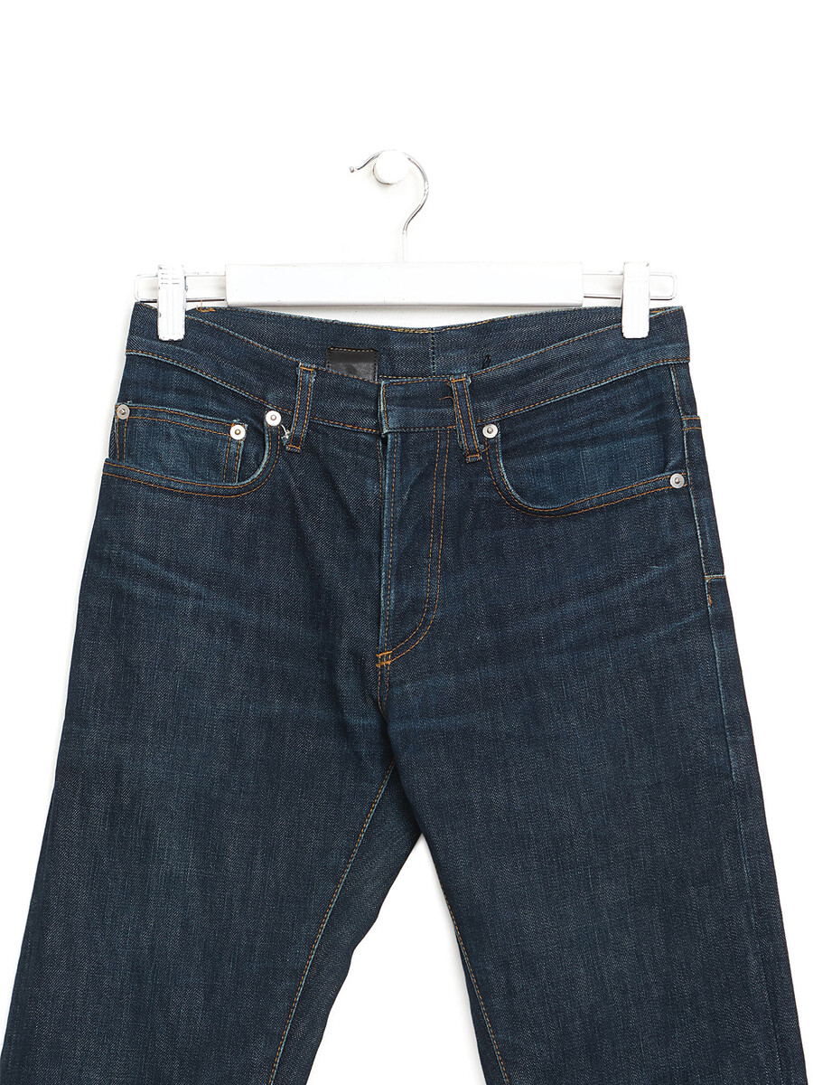 Mid-rise denim jeans in blue. Button front closure. Classic five-pocket styling with two back patch pockets and three front pockets.