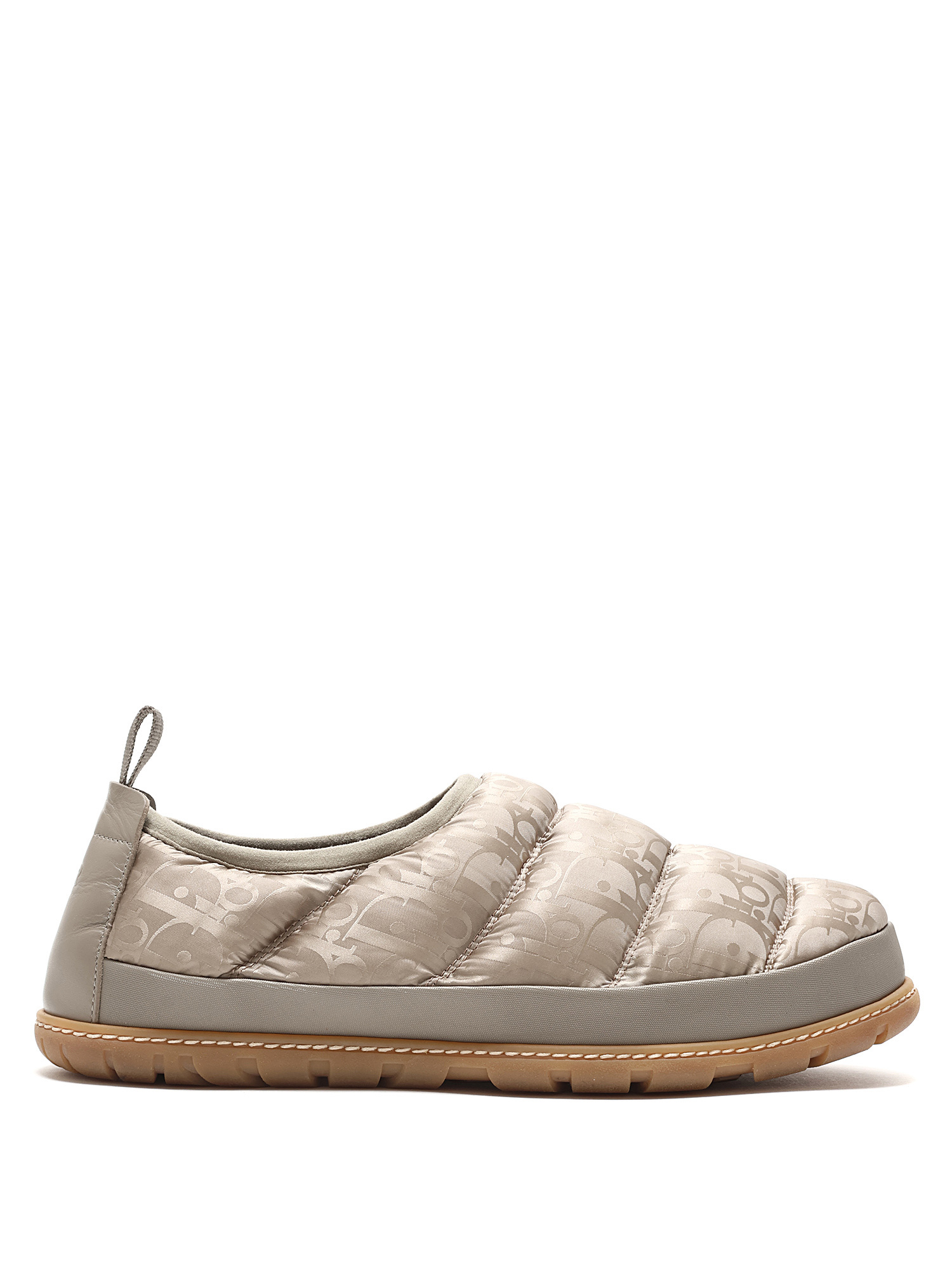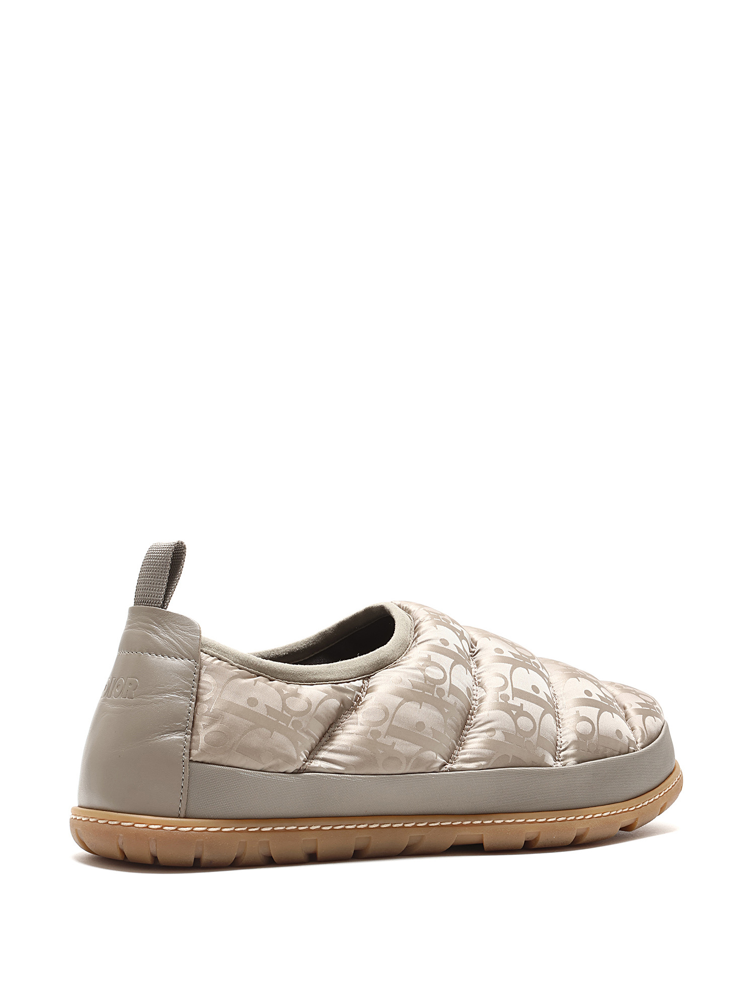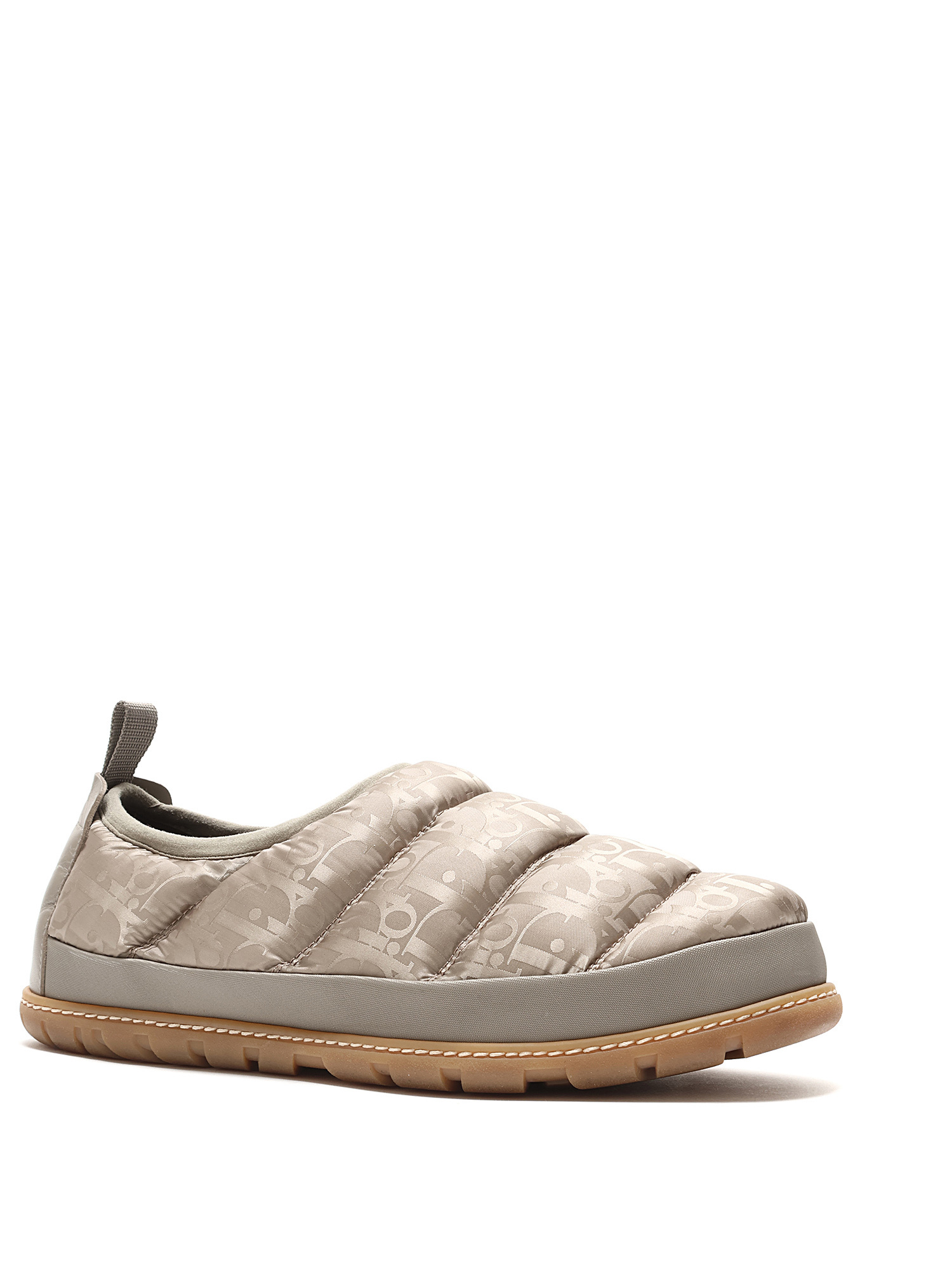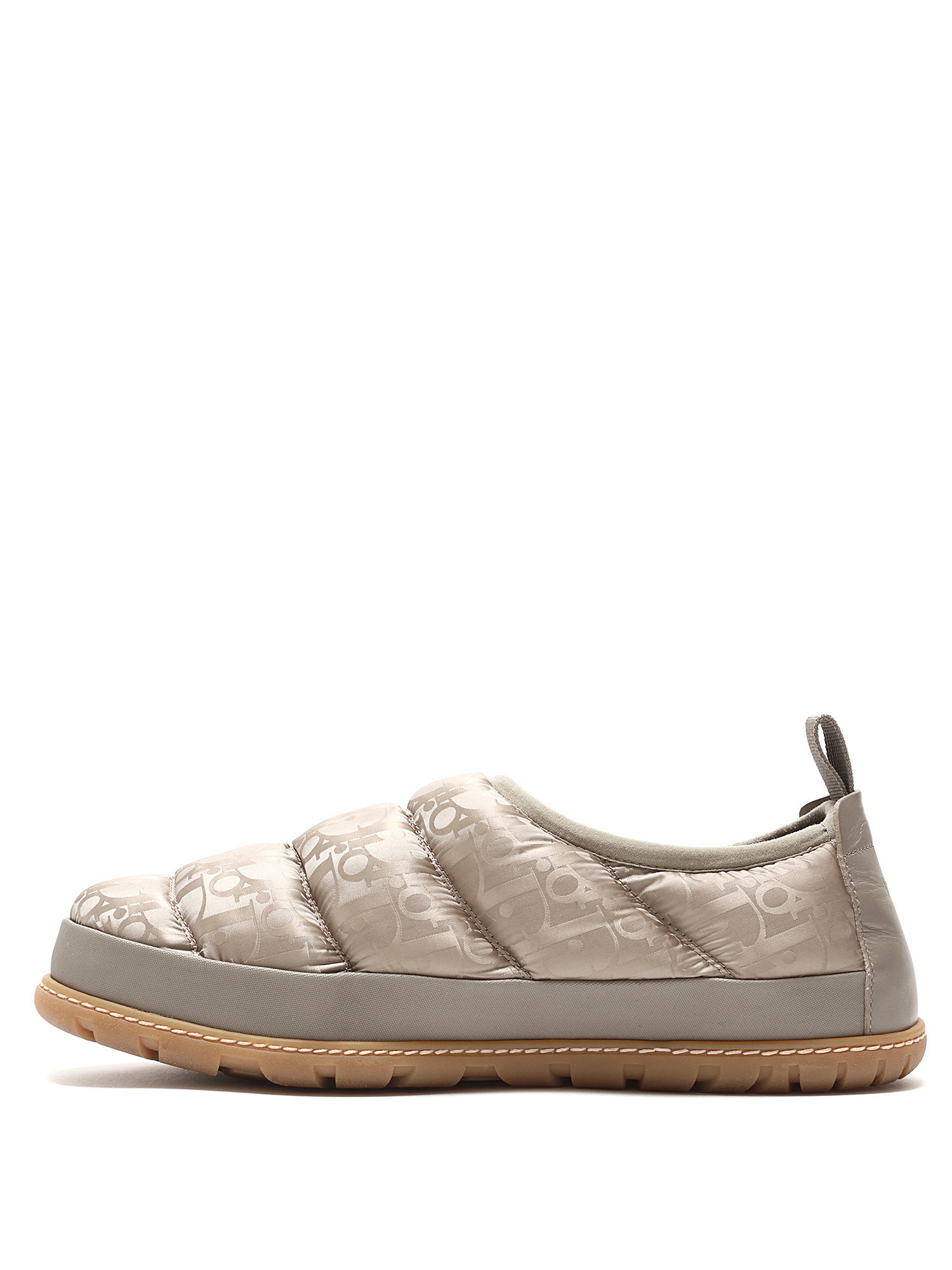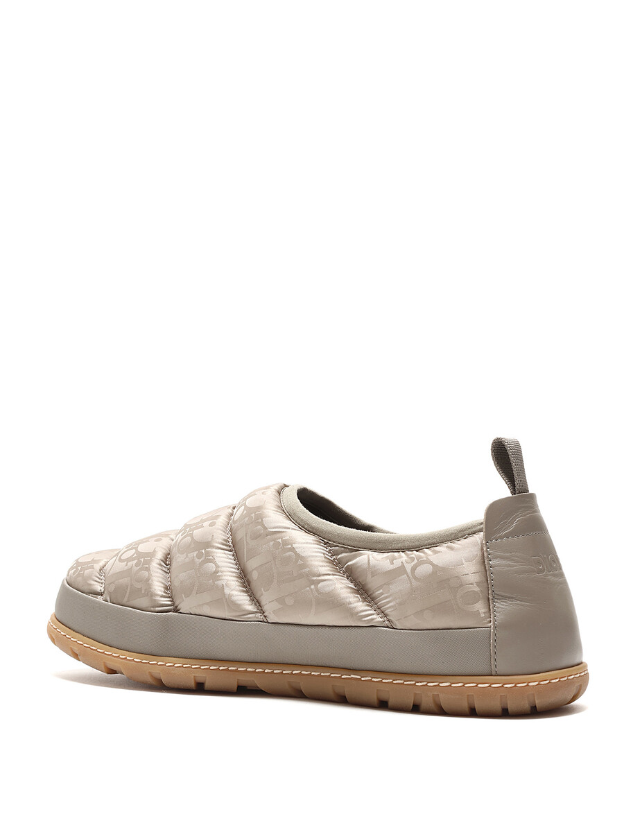 Quilted slip-on sneakers with signature Dior logo pattern in light taupe. Round toe style. Rubber sole. Slip-on closure. Comes with dustbag.