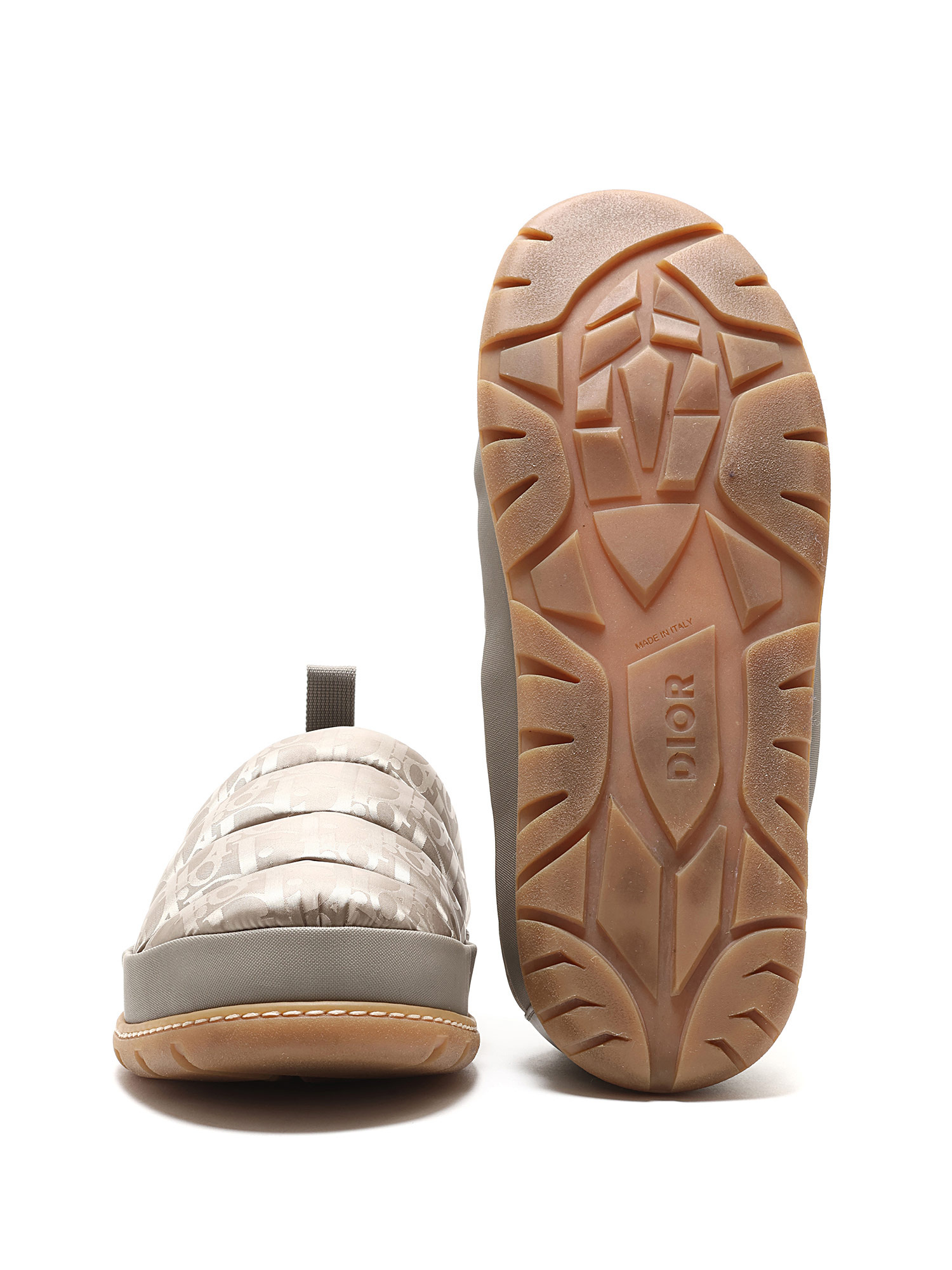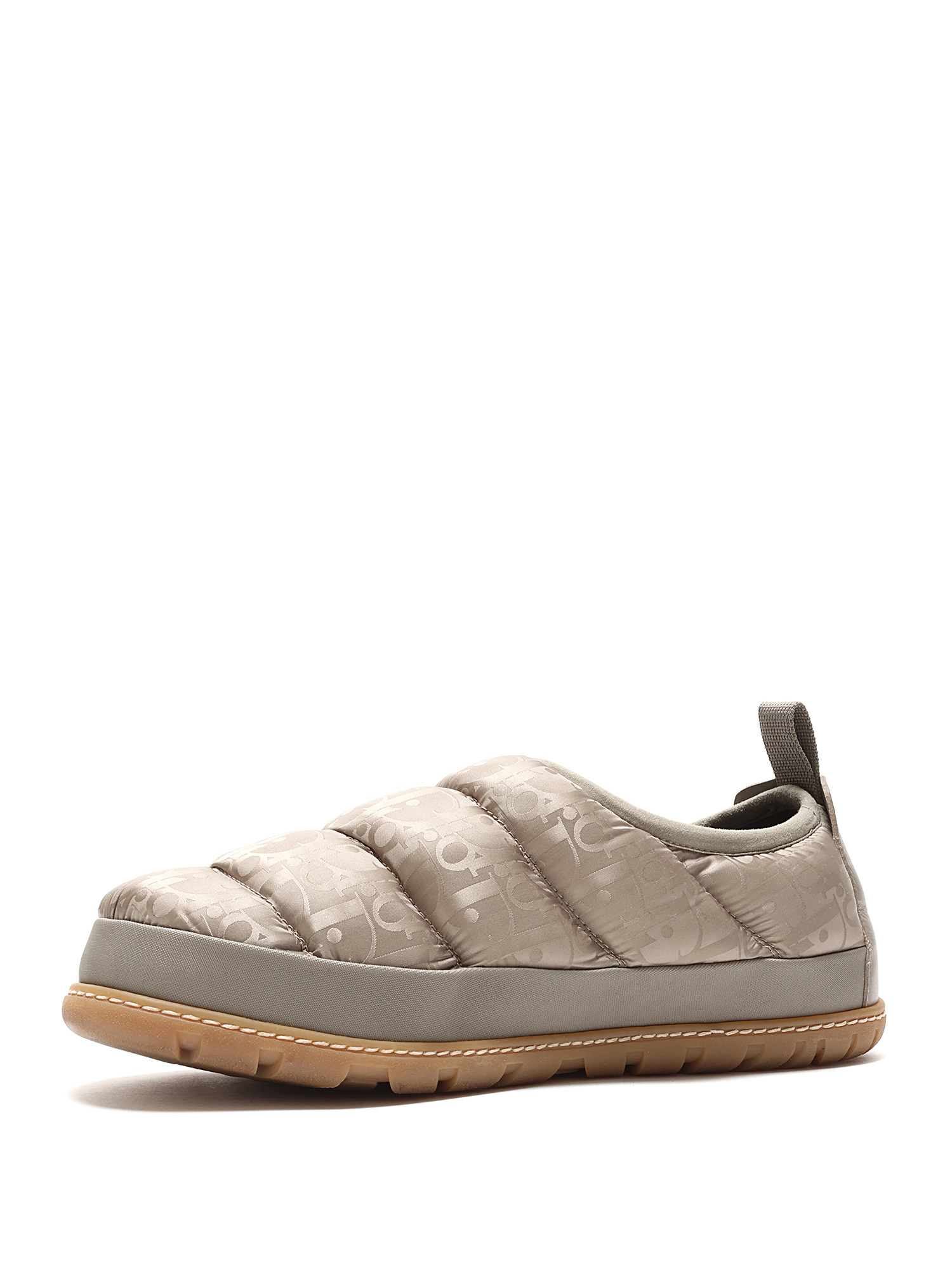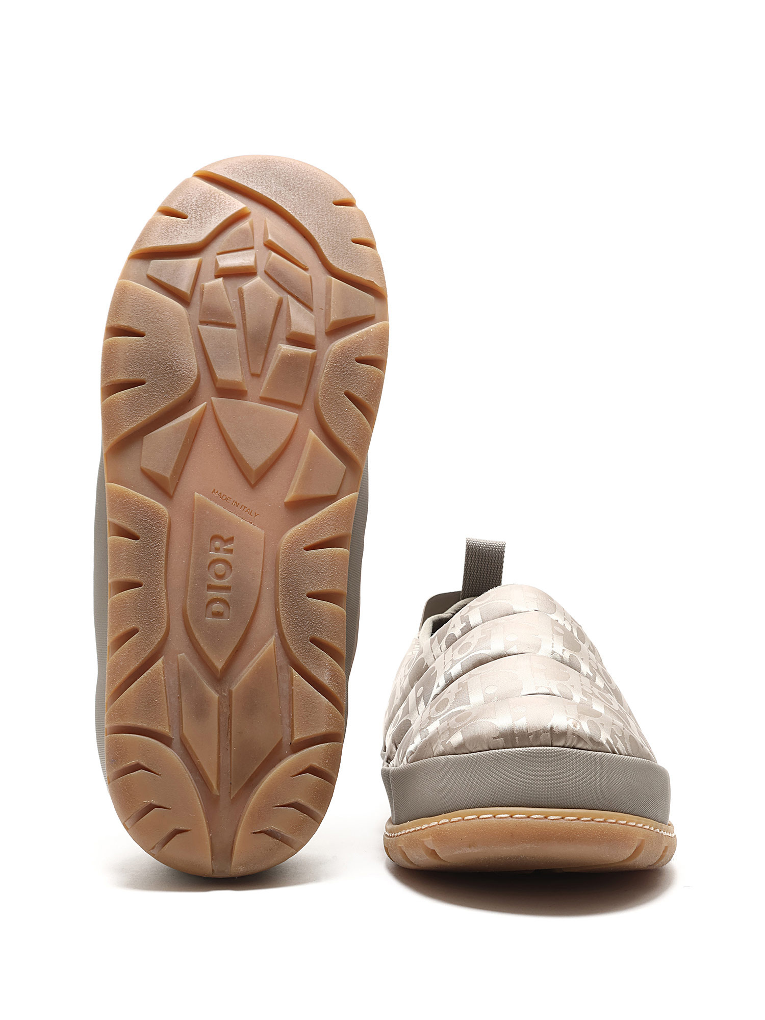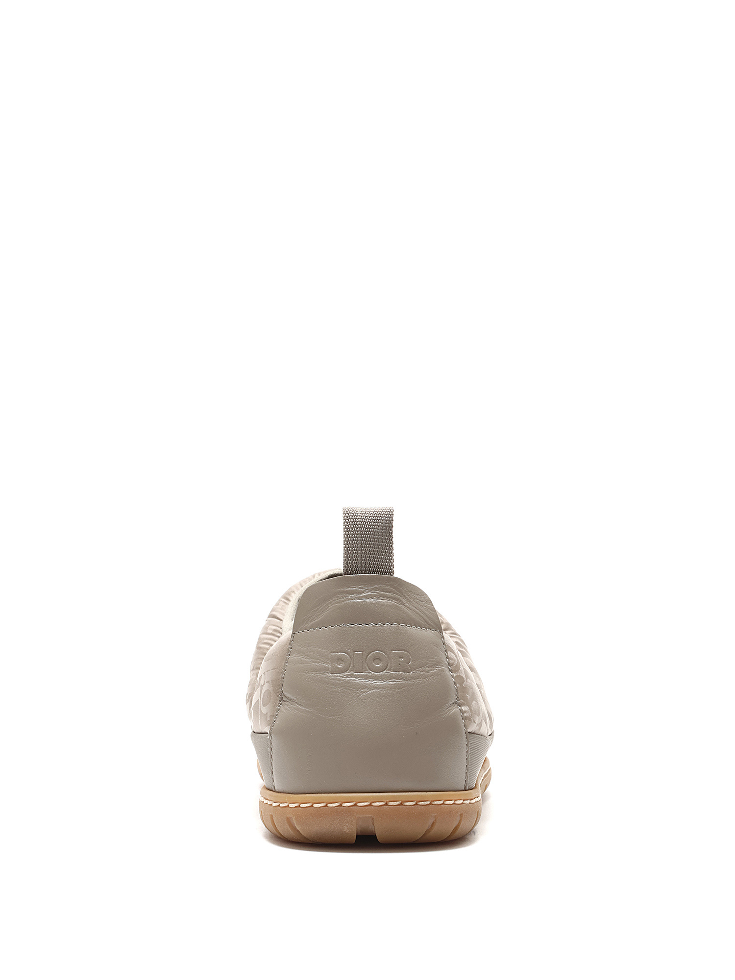 Quilted slip-on sneakers with signature Dior logo pattern in light taupe. Round toe style. Rubber sole. Slip-on closure. Comes with dustbag.