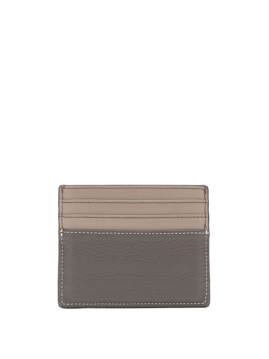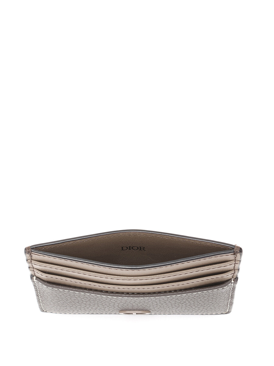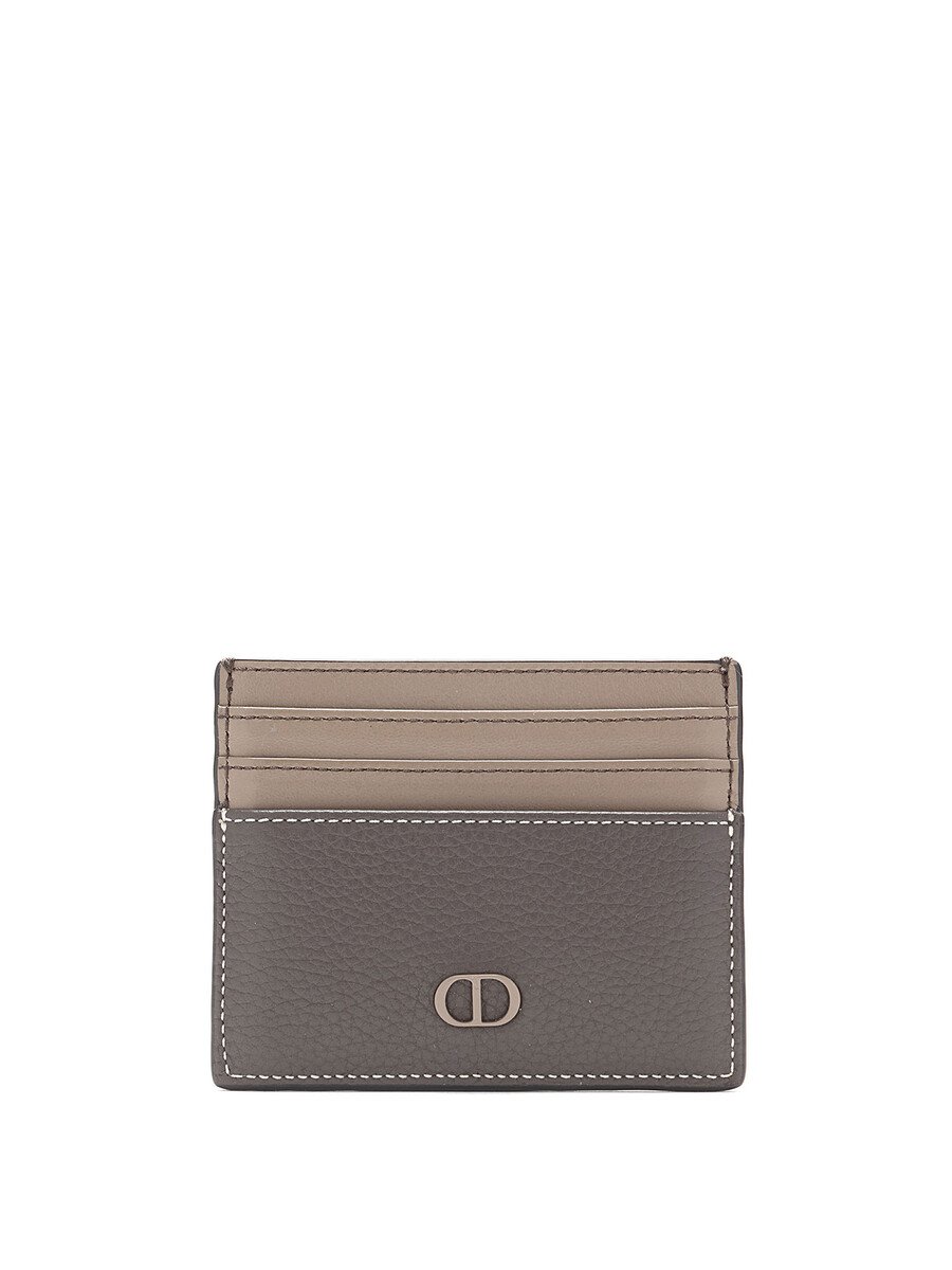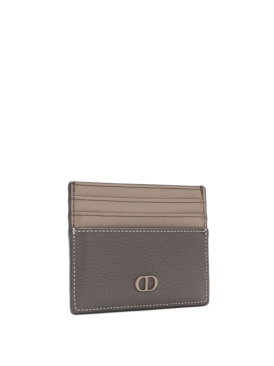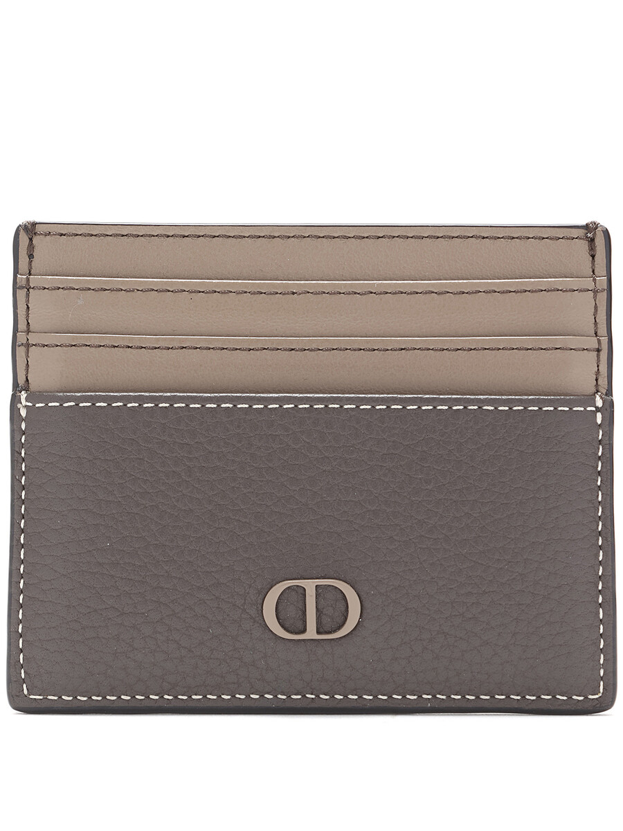 Leather card holder with pebbled texture in brown and beige. Features a metal 'CD' logo and detailed contrast stitching.