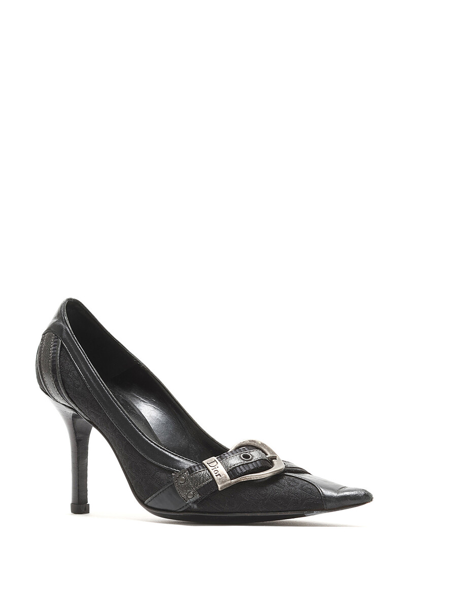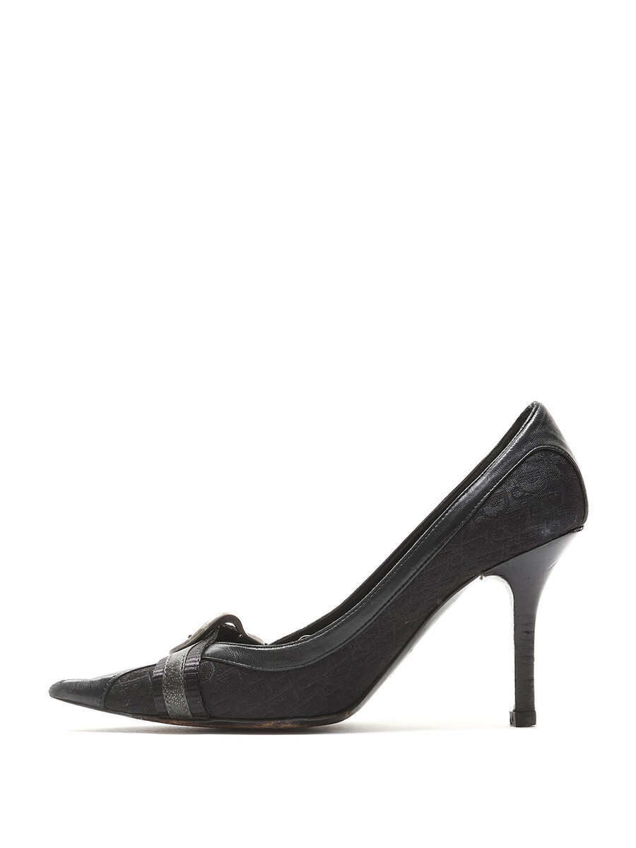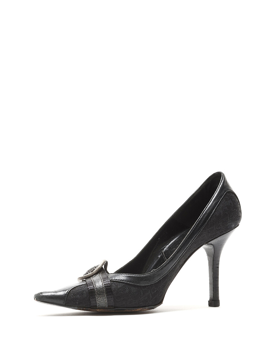 Pointed-toe monogrammed black pumps with metallic buckle detailing. Features a buckle closure and leather sole.