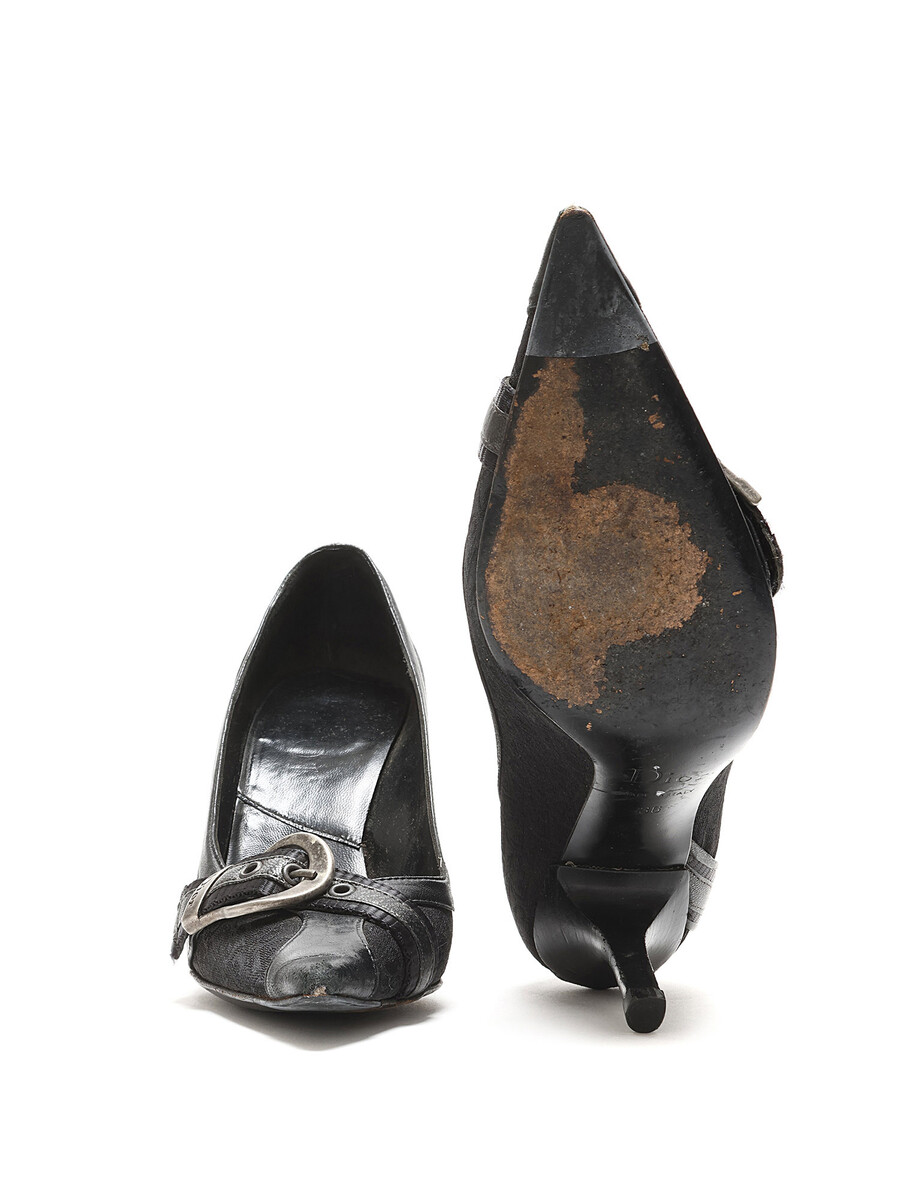 Signs of use. Wear to soles, tips and fabric. Scuffs to metal and leather.