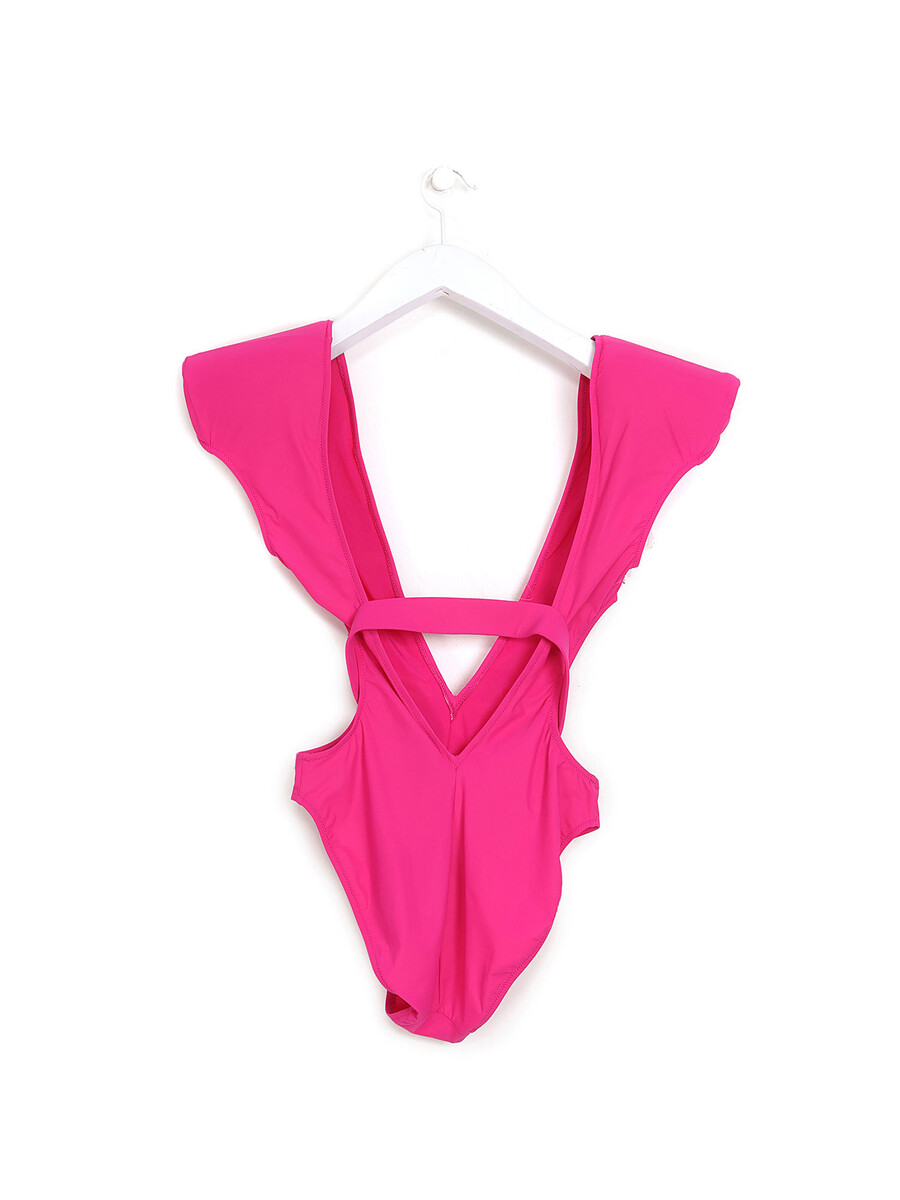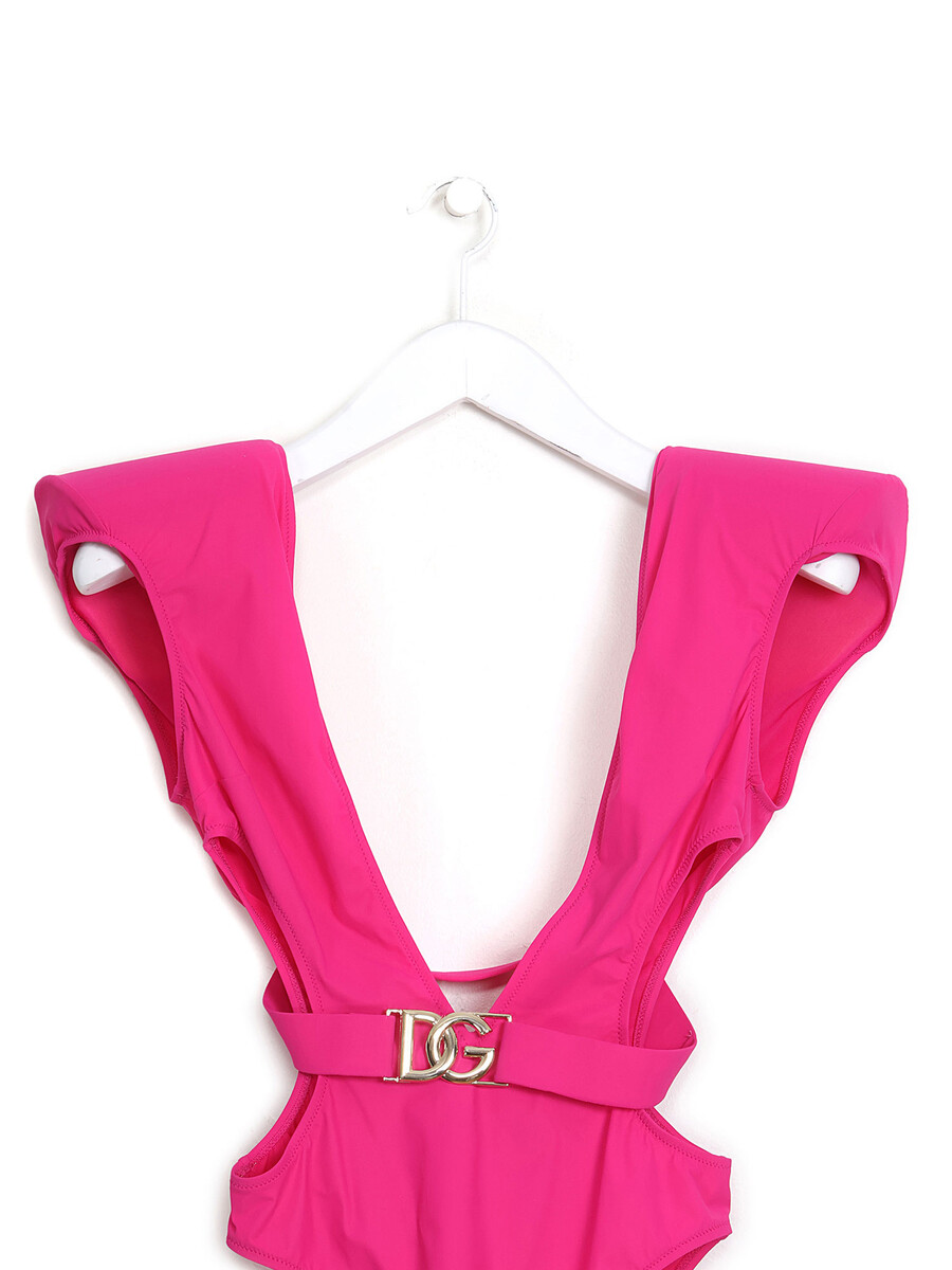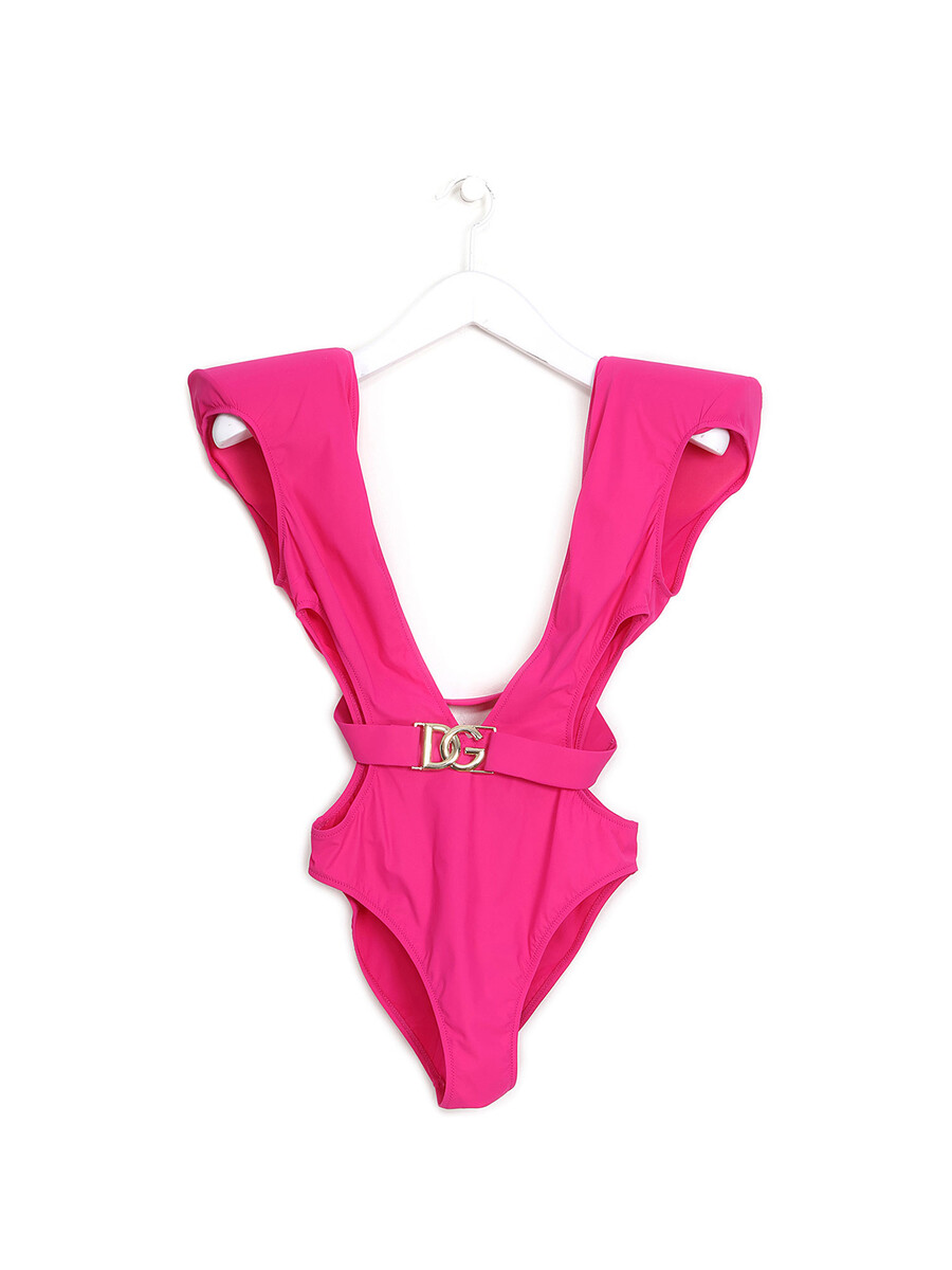Fuchsia cut-out swimsuit featuring a square neckline and padded shoulder. Logo buckle detailing at the center. With dust bag.
