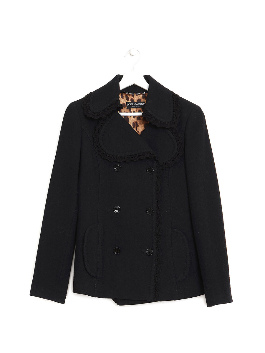 Double-breasted wool coat with leopard-print lining. Double black button closure. Large collar. Flap pockets at the front.