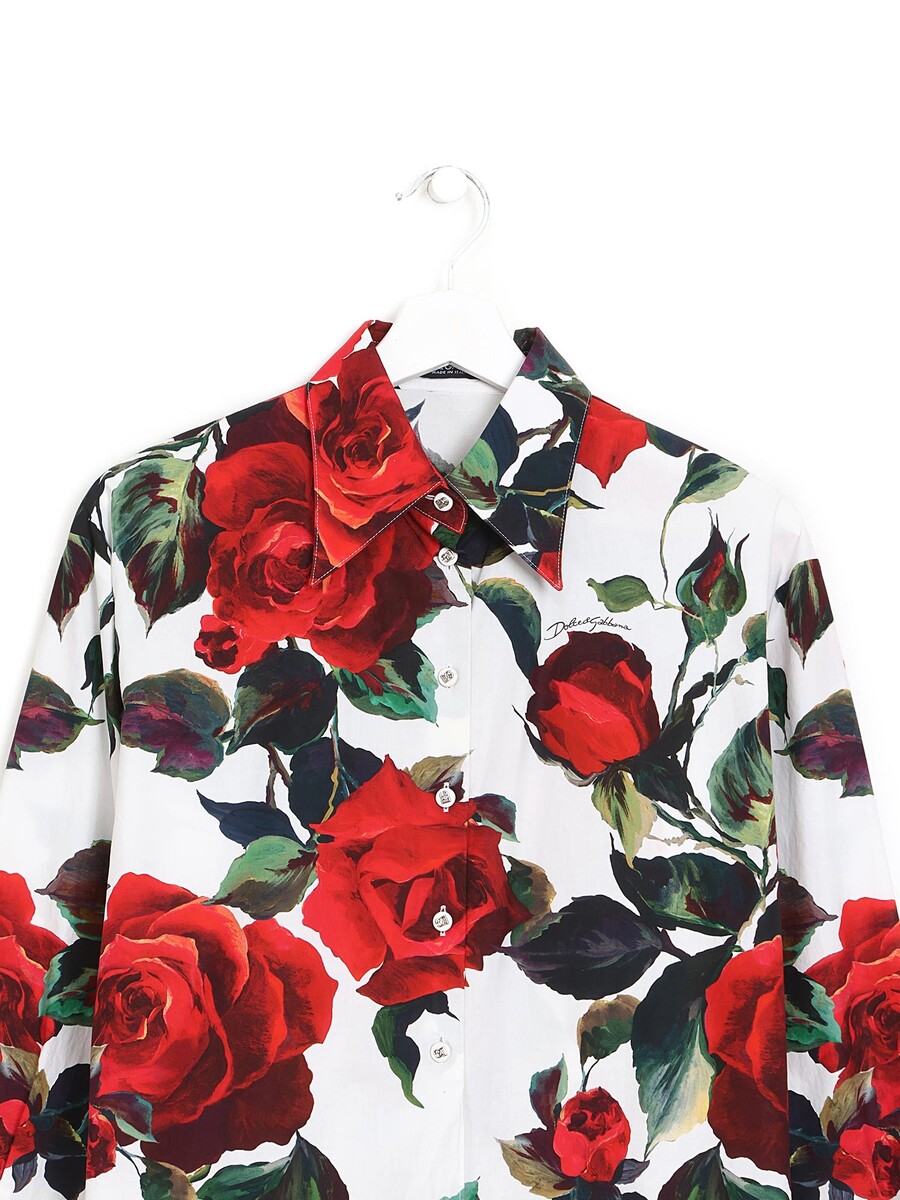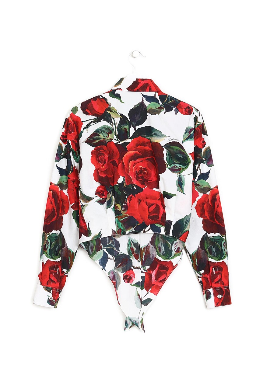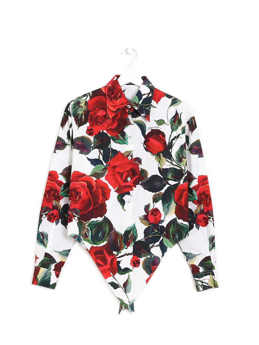 Long sleeve cotton shirt with an all-over floral print in red and white. Features button front closure and a classic shirt collar.