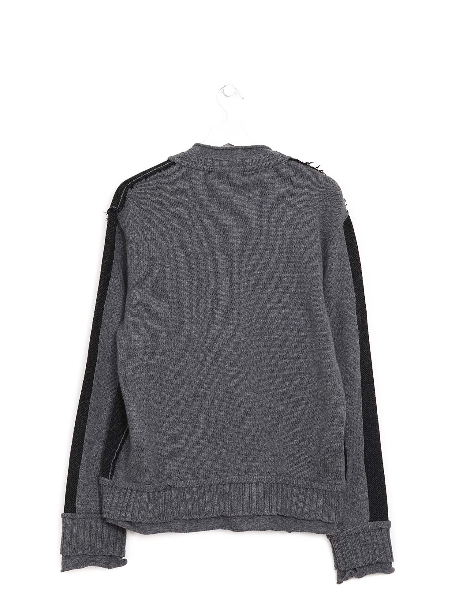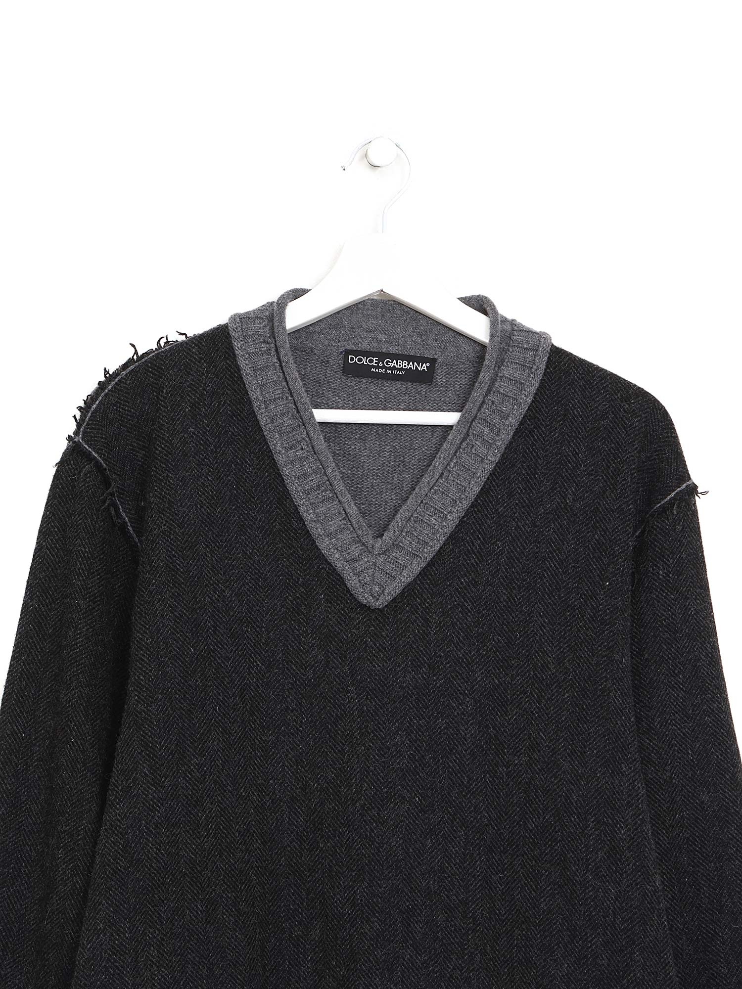 Long sleeve V-neck wool sweater in gray. Features contrasting light gray trims and ribbed cuffs. Lightweight construction with a classic fit.