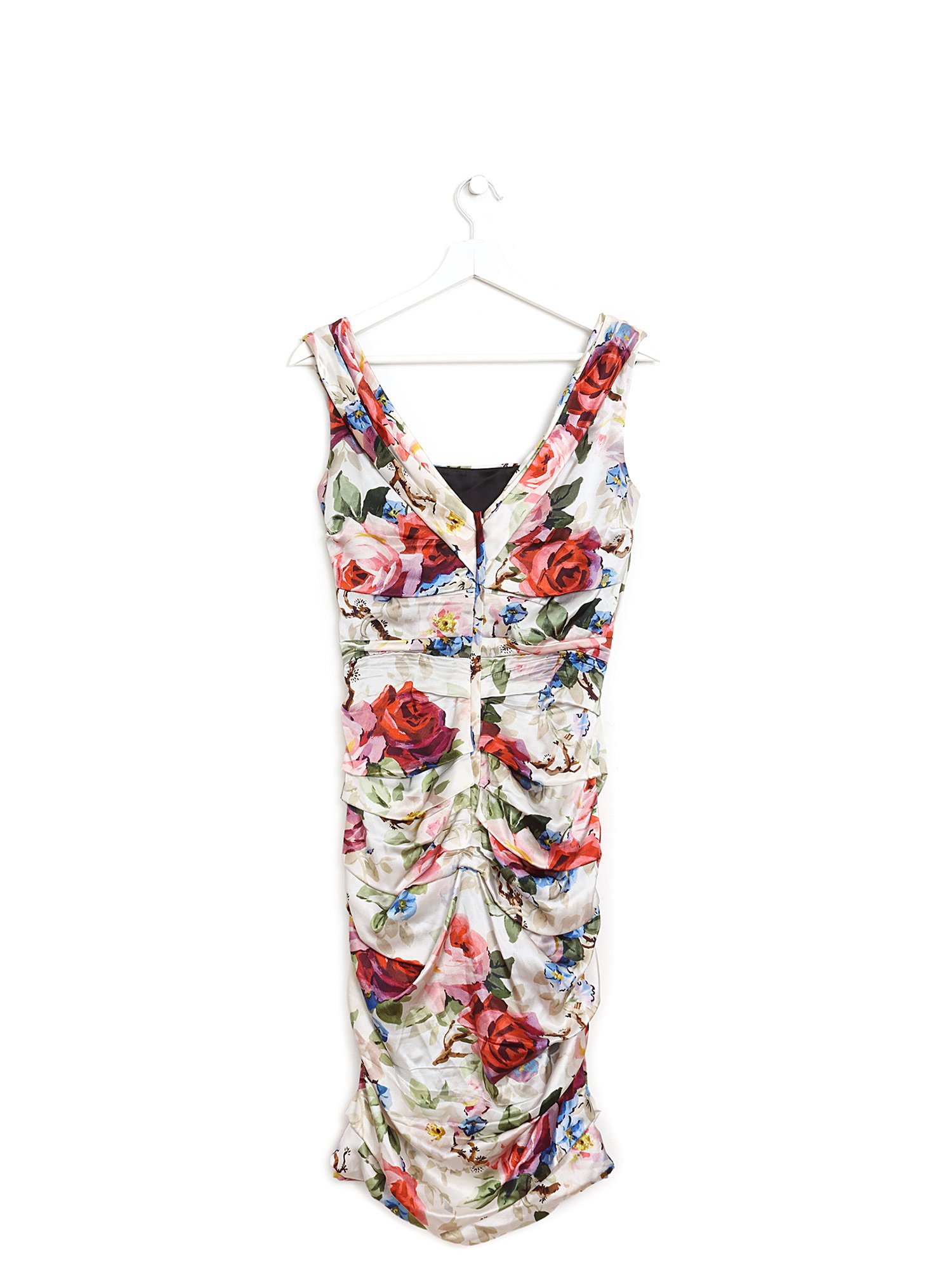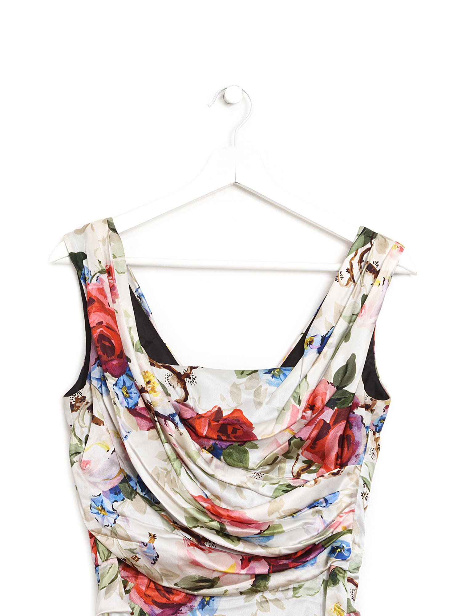 Sleeveless draped dress in white featuring a vibrant floral graphic print throughout.