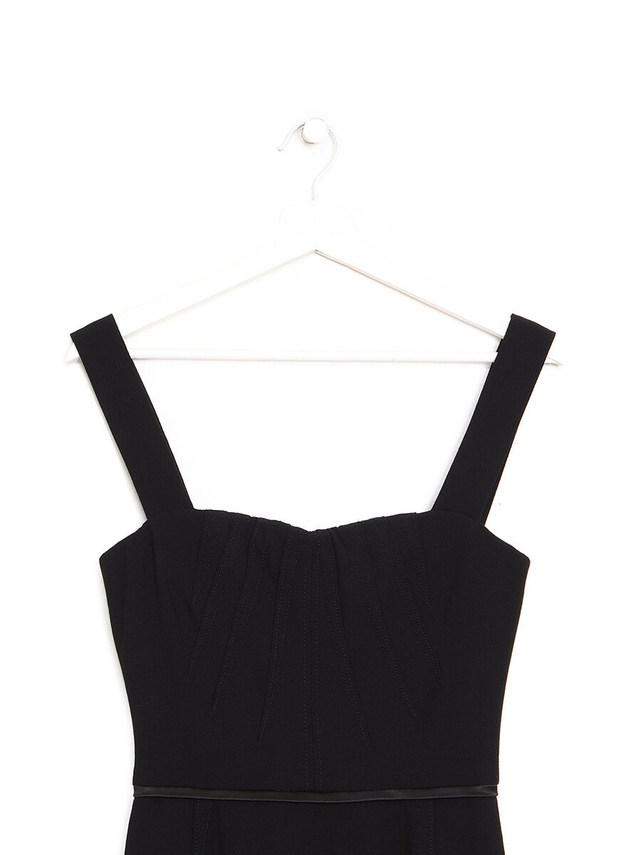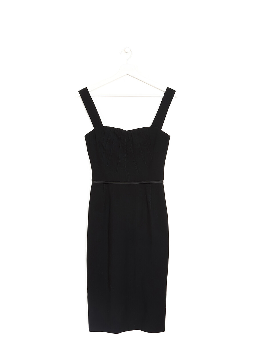 Black sleeveless midi dress with animal print lining. Back zip closure.