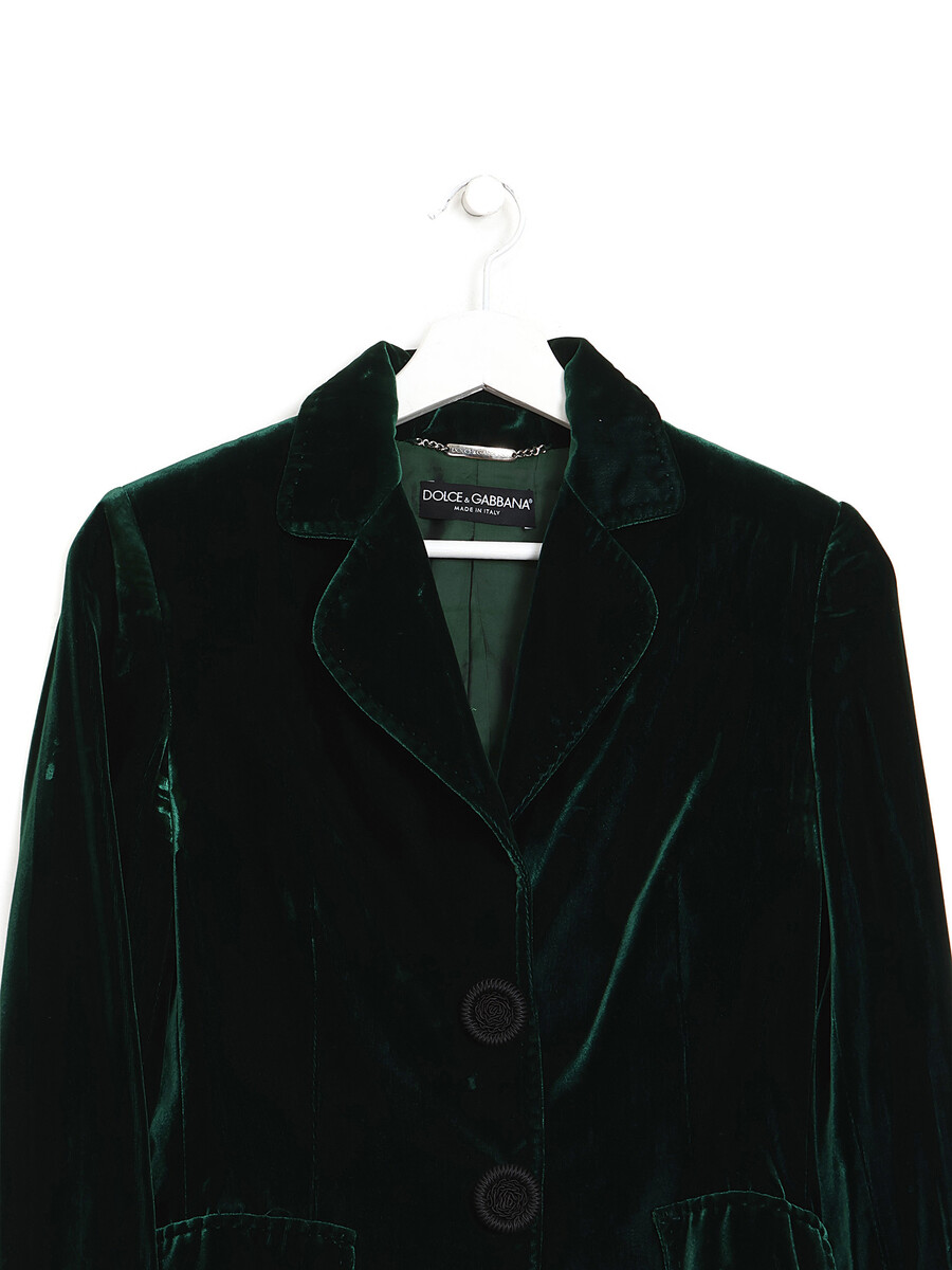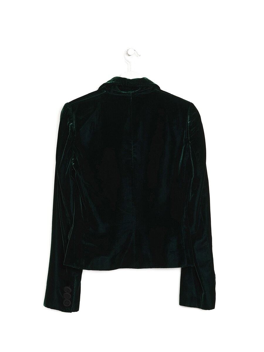 Long sleeve velvet jacket in green. Front button closure. Shirt collar.