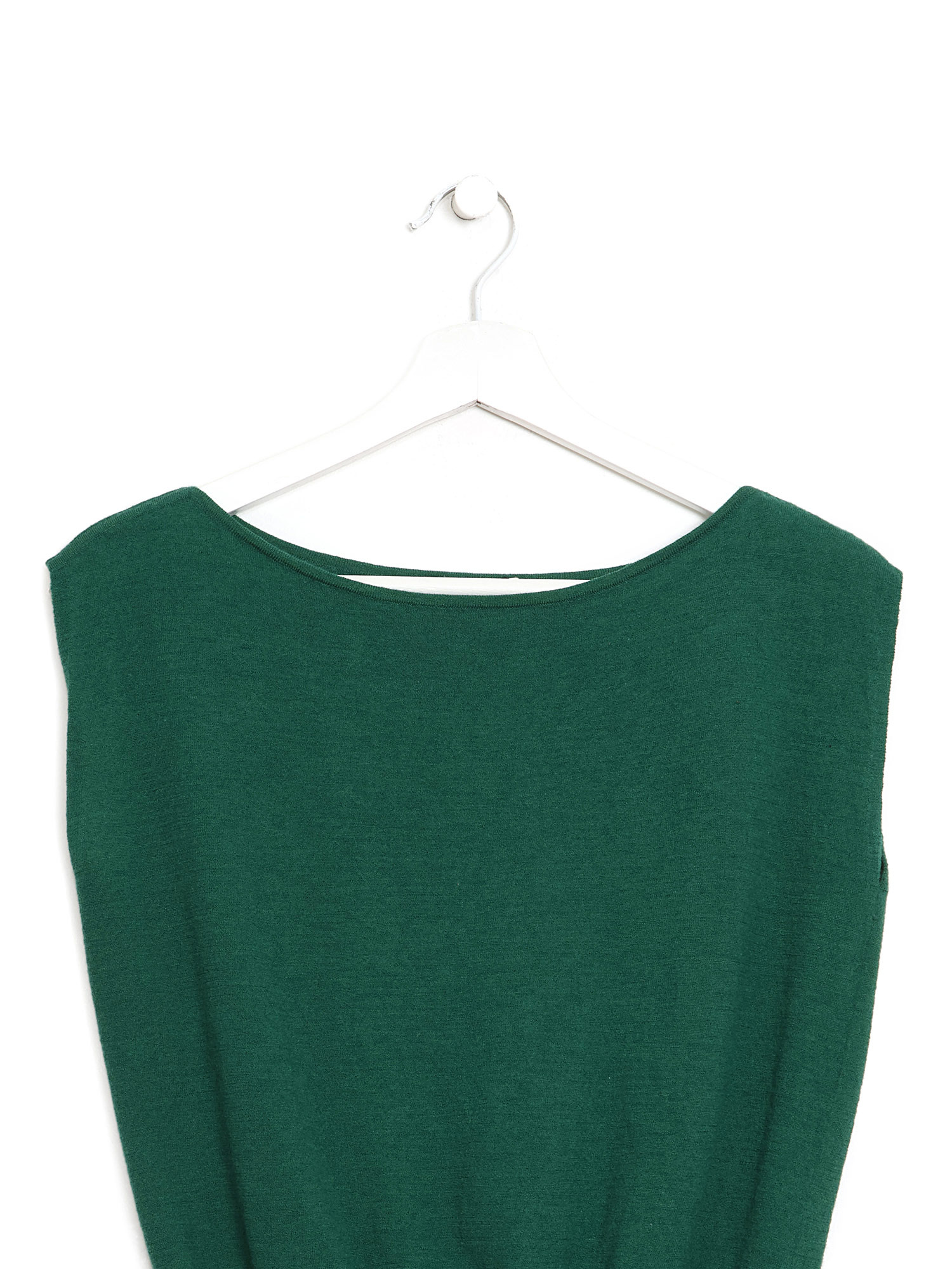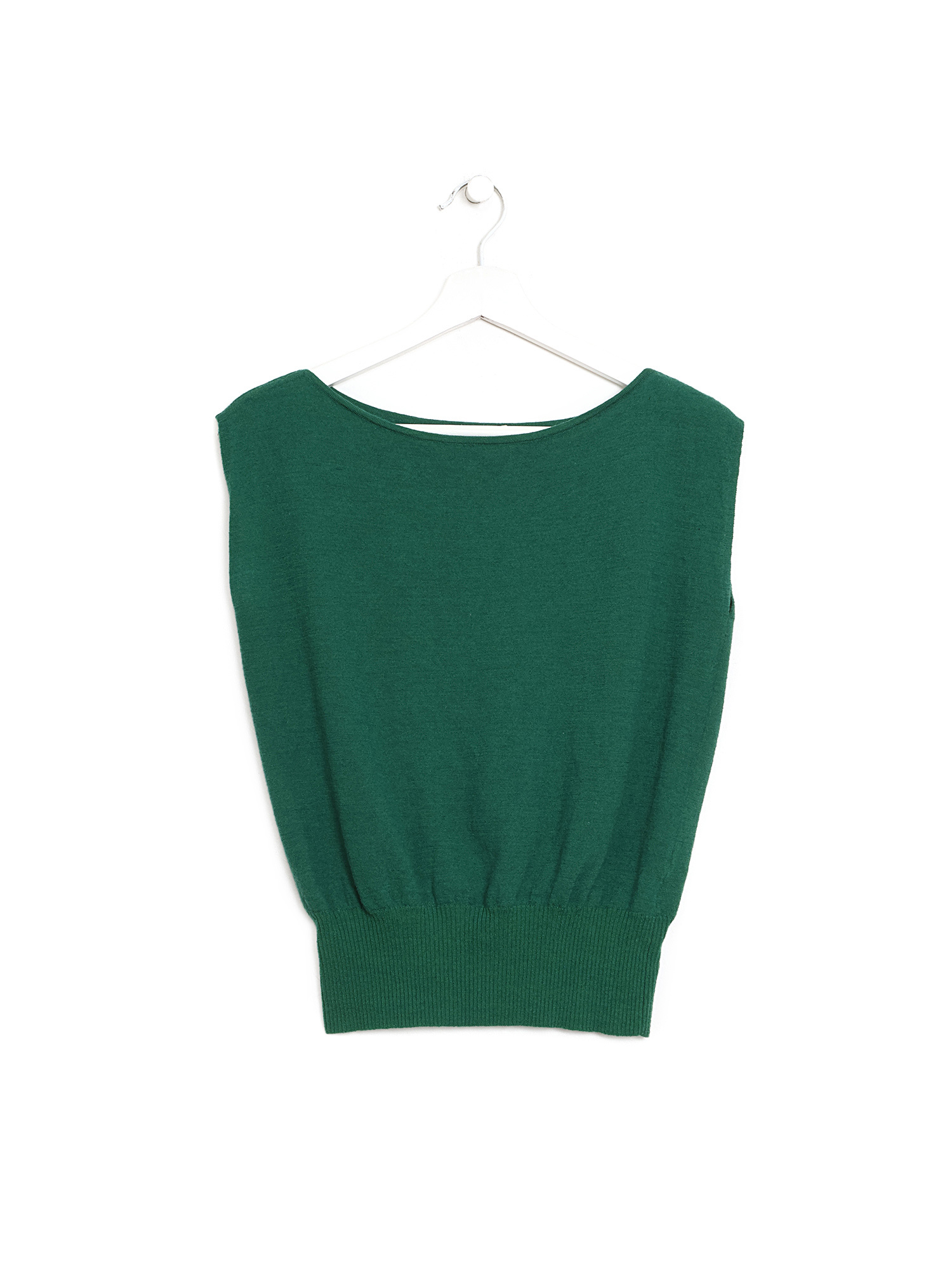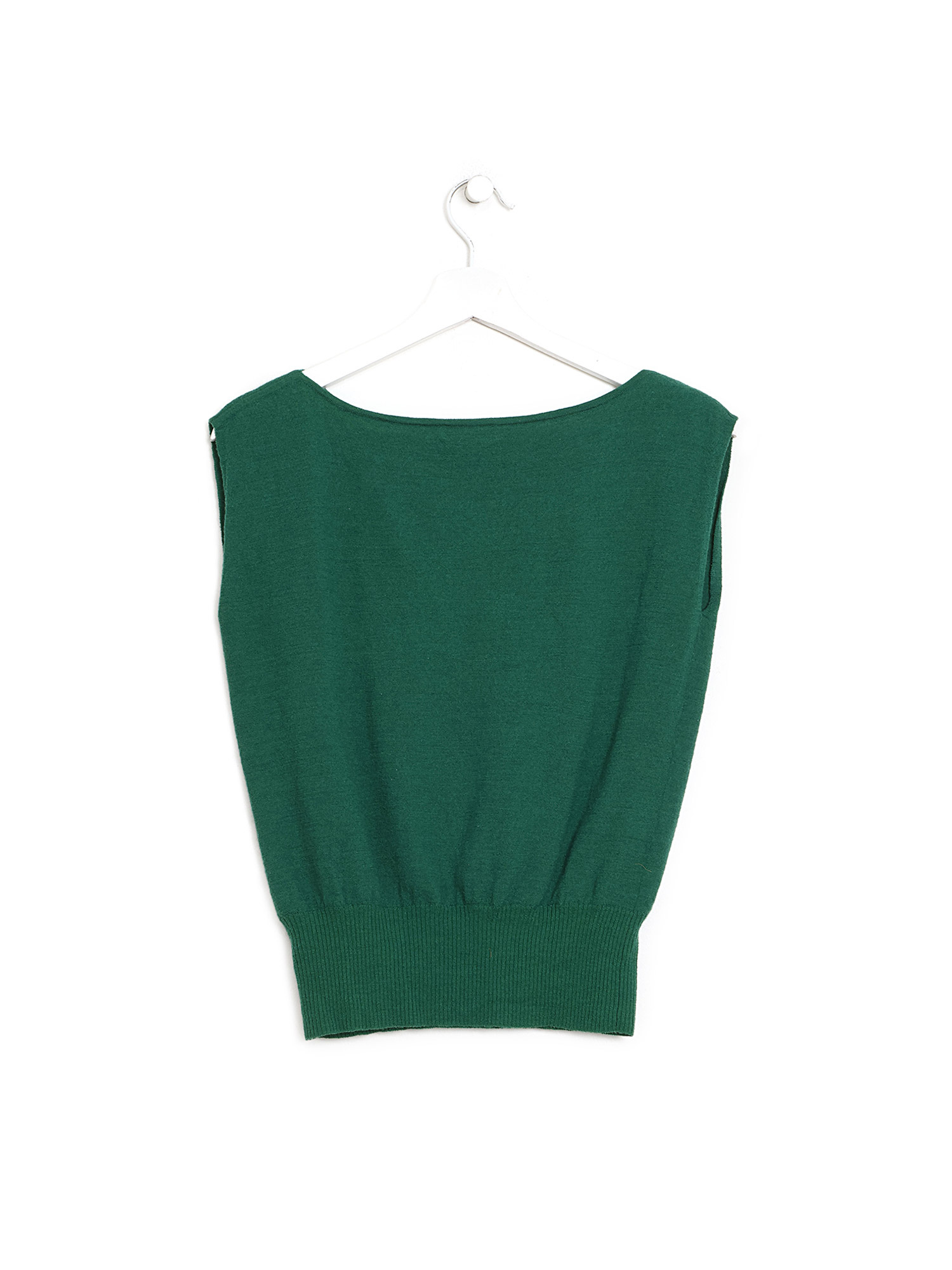Sleeveless green wool top. Features a fine knit design. Simple and elegant with a classic round neckline.