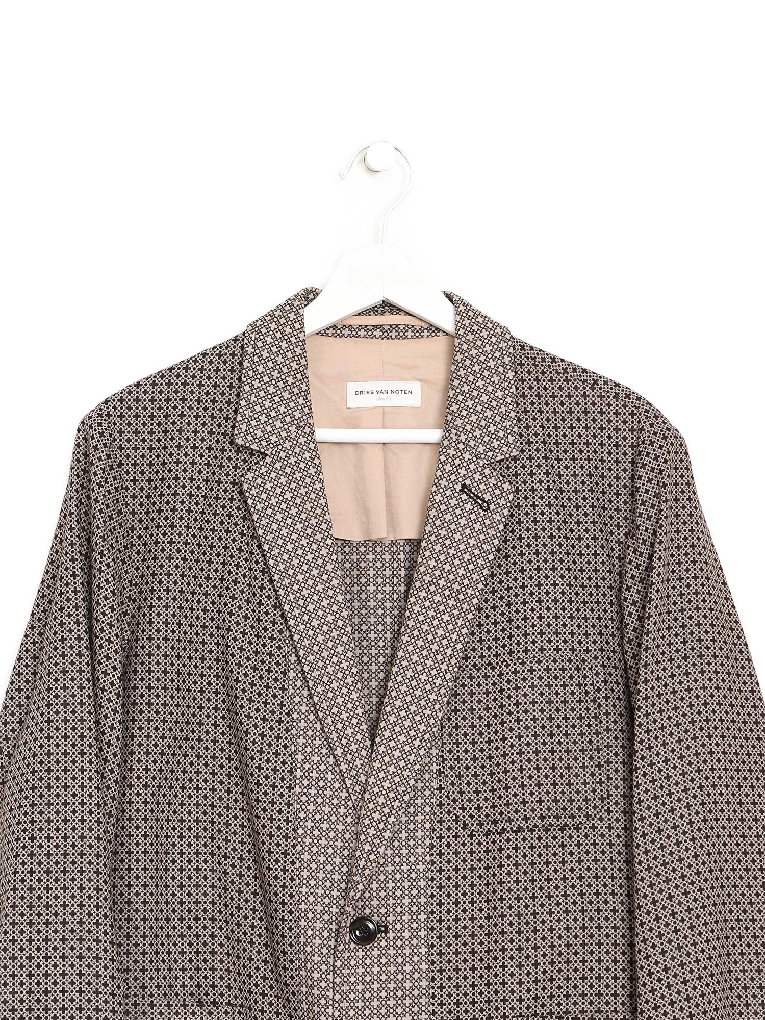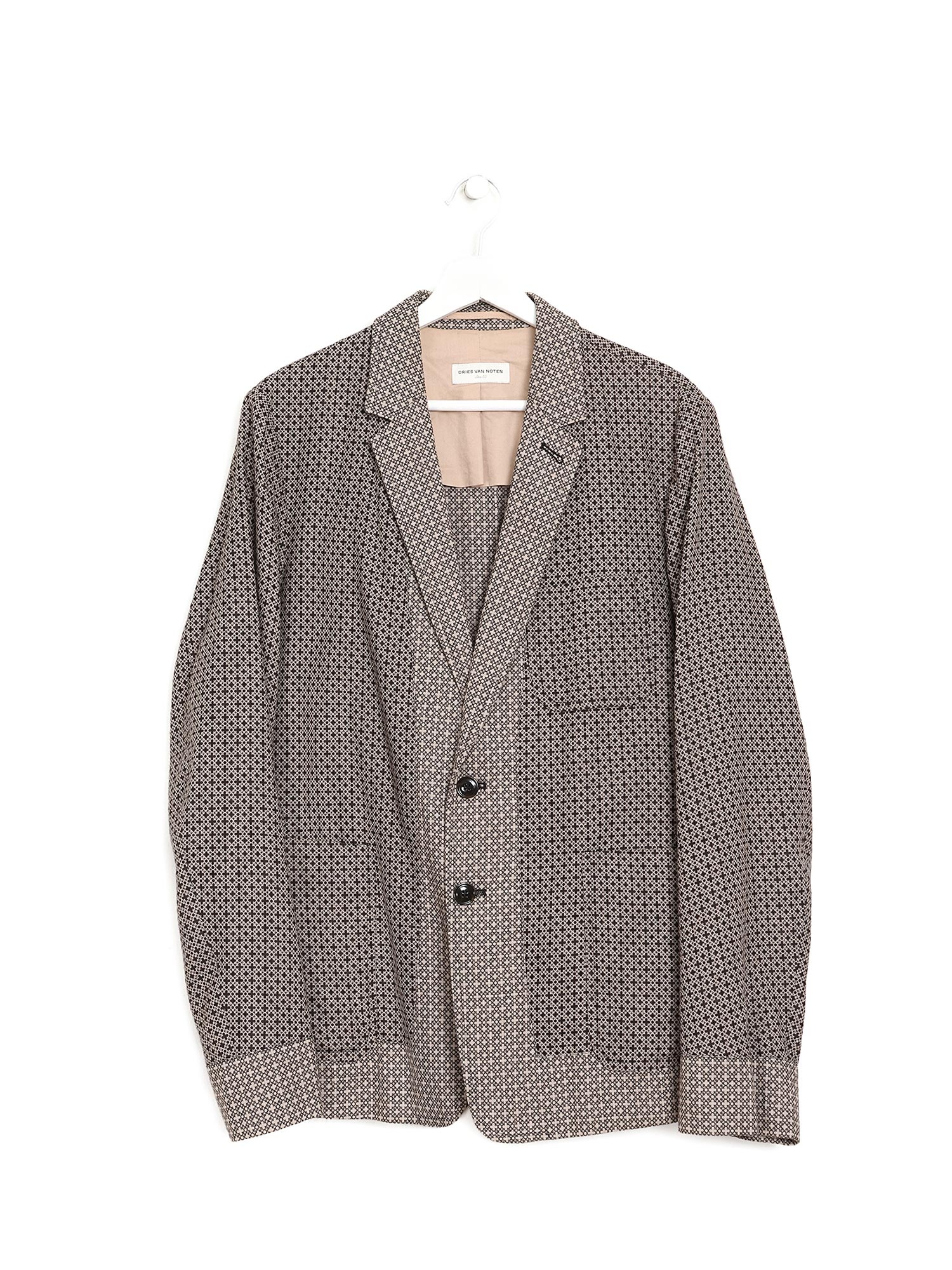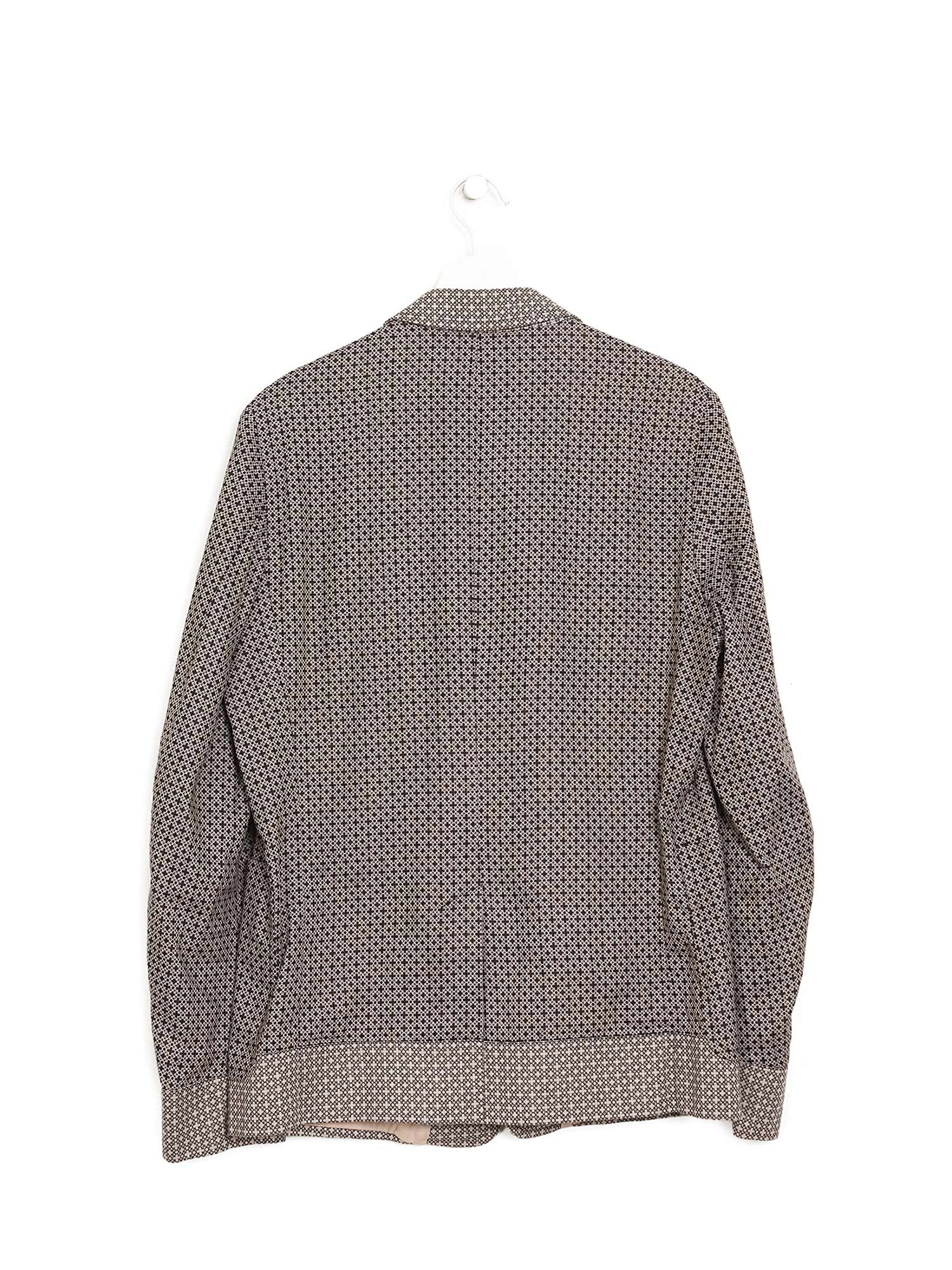 Geometric patterned long sleeve blazer with button front closure. Shirt collar. Lightweight linen-cotton blend. Tailored fit.