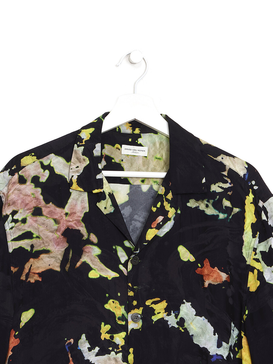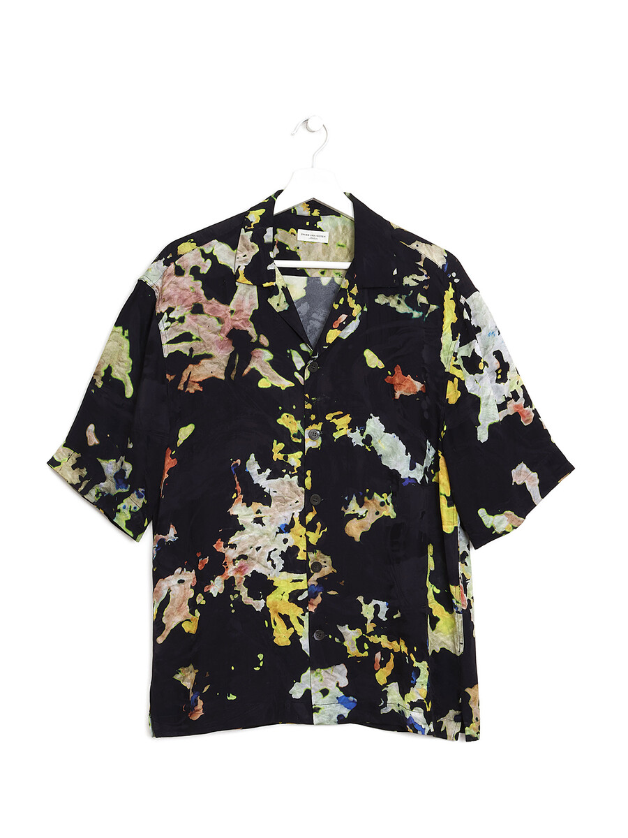 Short sleeve abstract patterned shirt in black and multicolor tones. Button closure. Classic shirt collar.