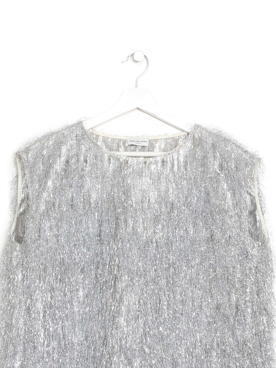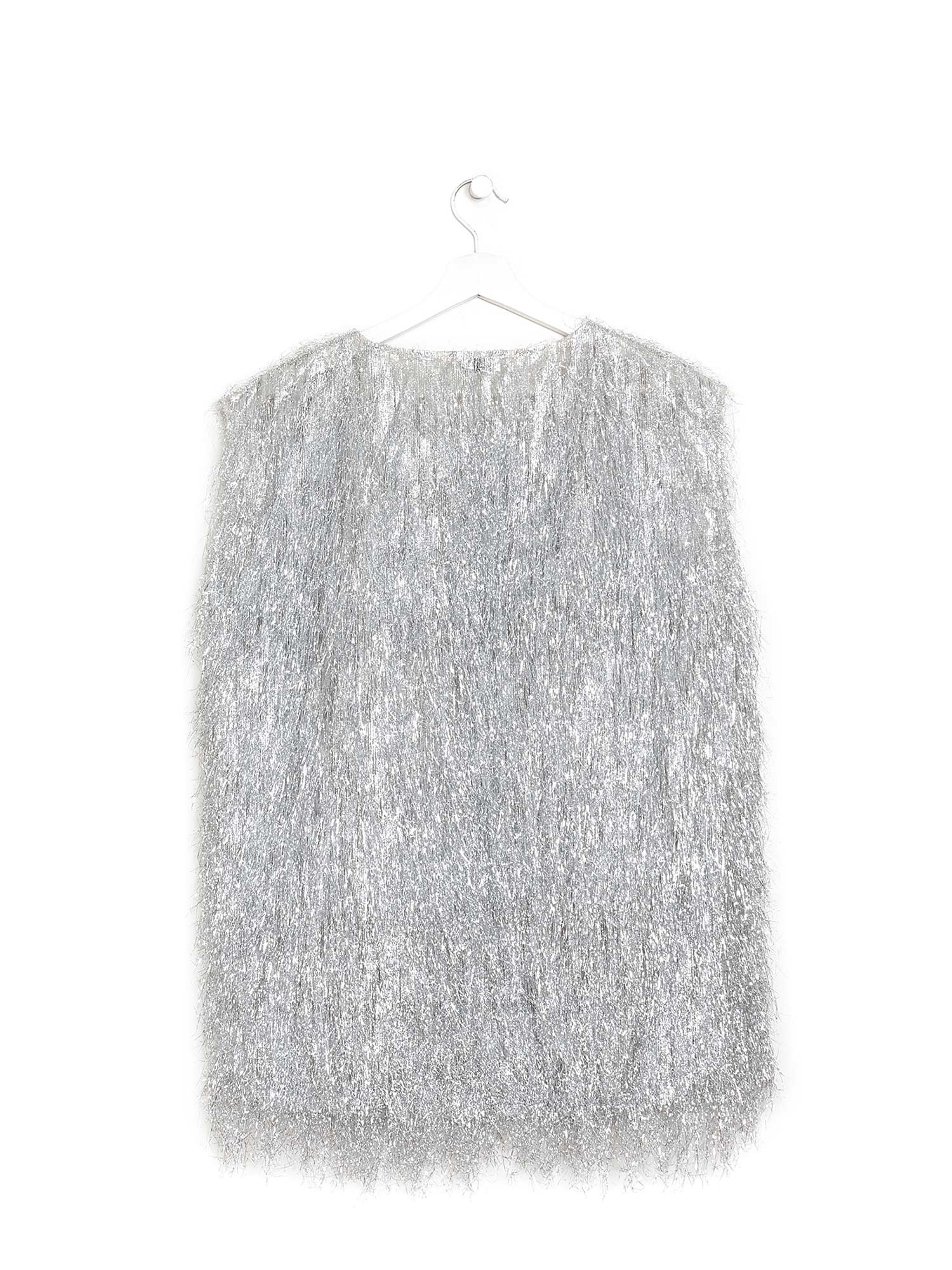 Sleeveless mini dress with metallic fringe detailing. Round neckline. A-line silhouette.