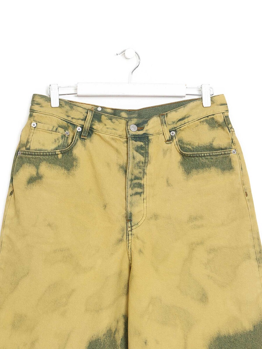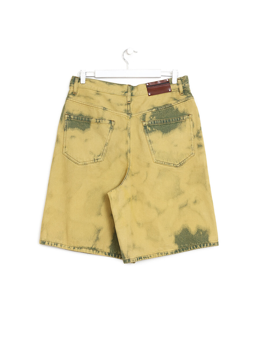 Tie-dye shorts in shades of yellow and green. Five-pocket style with button and zipper closure.