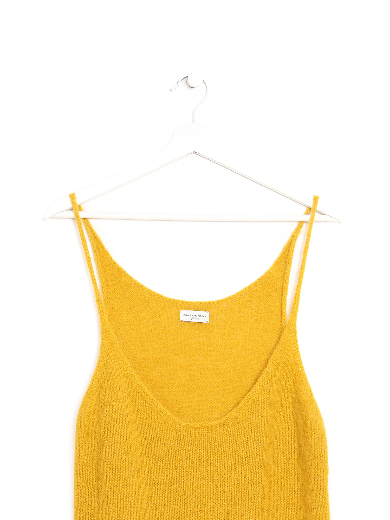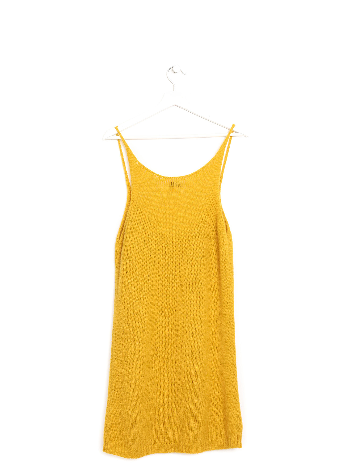 Mustard mohair knit tank top. Round neckline. Soft texture with slight pilling at sides. Relaxed fit.