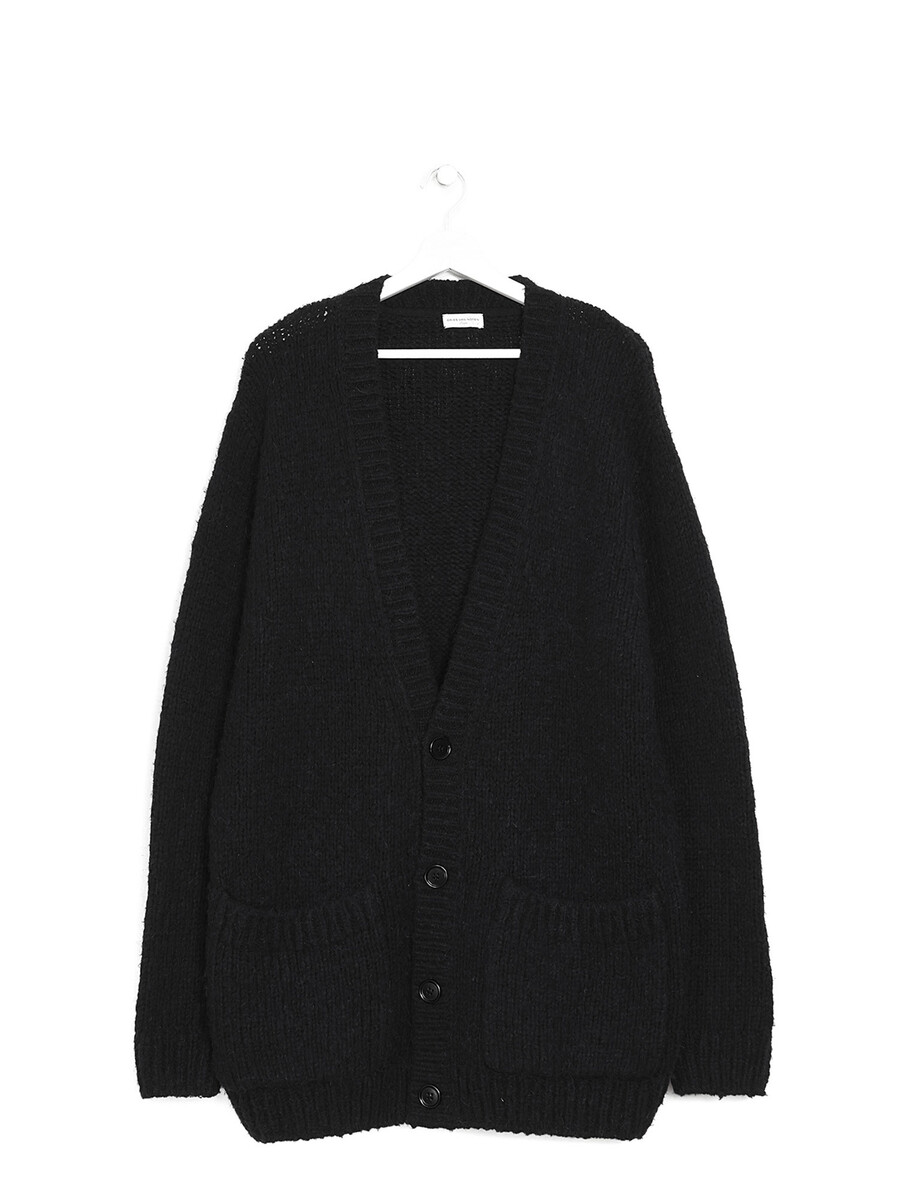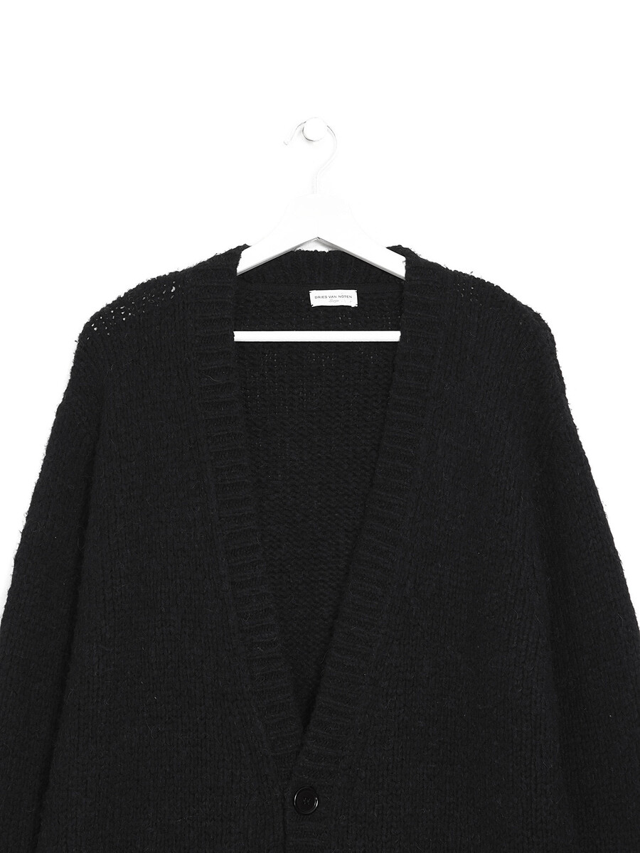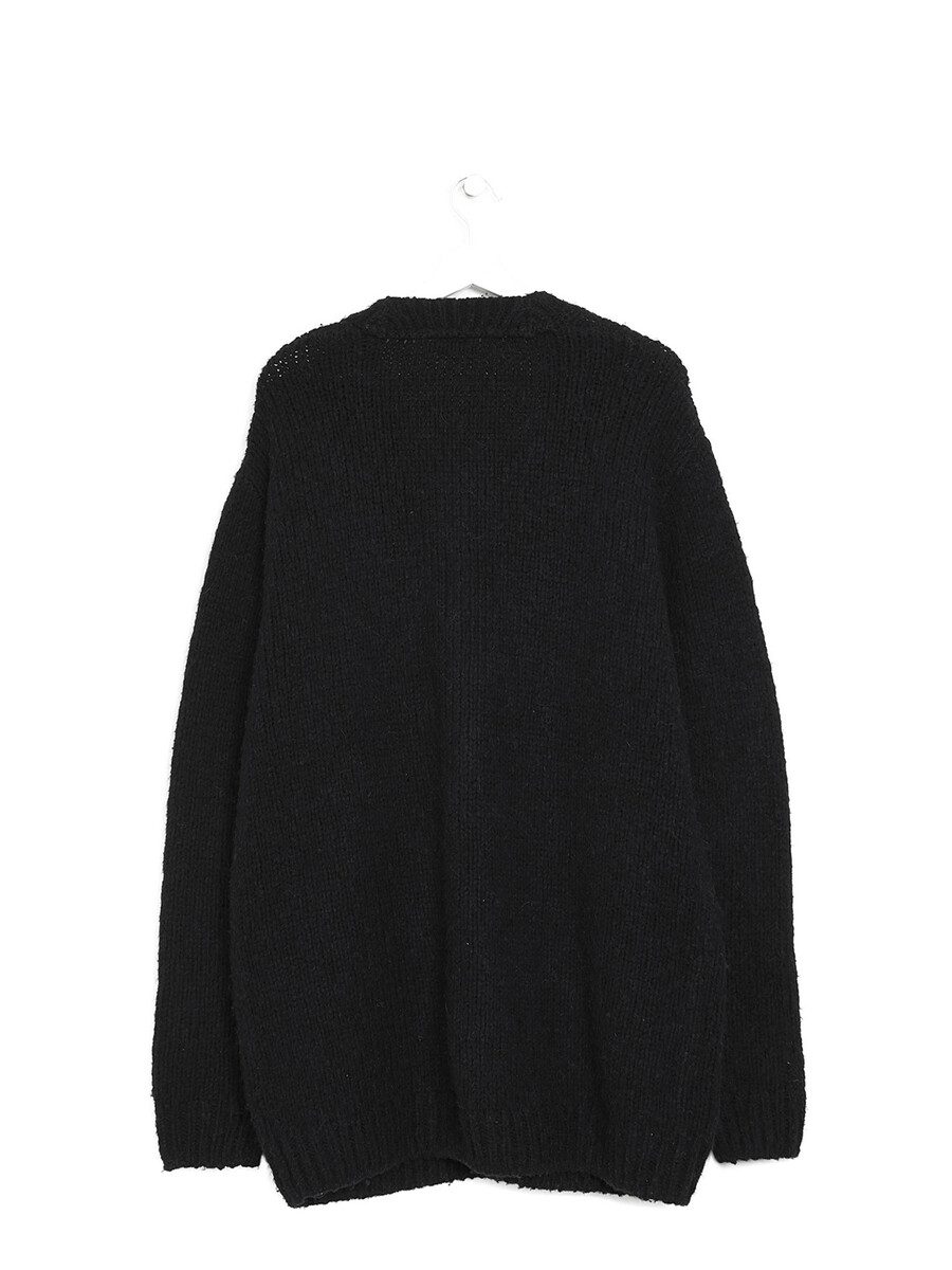 Black long sleeve cardigan featuring a V-neckline. Button closure.