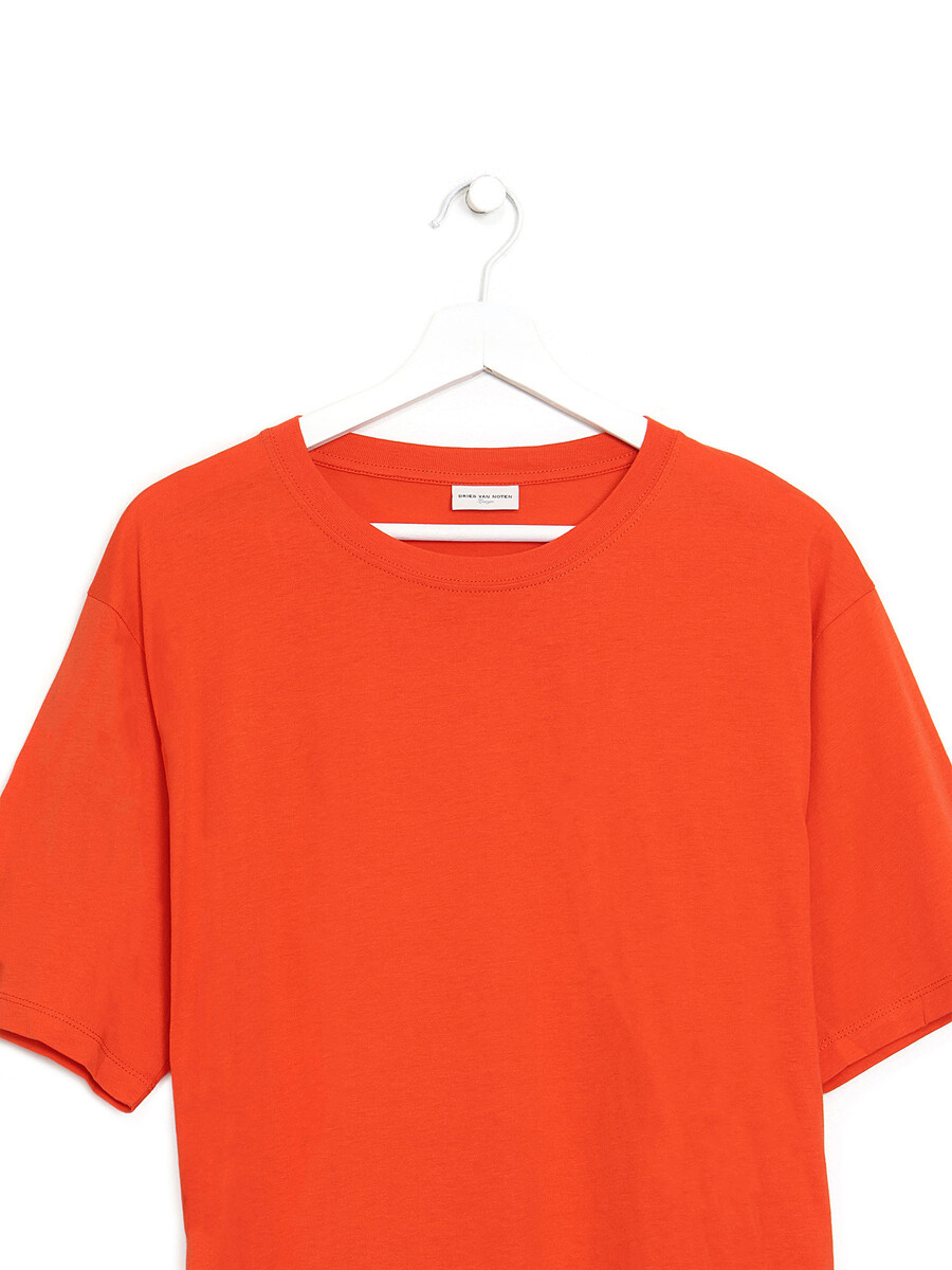 Short sleeve t-shirt in vibrant orange. Crew neckline. Lightweight and breathable, perfect for everyday wear.