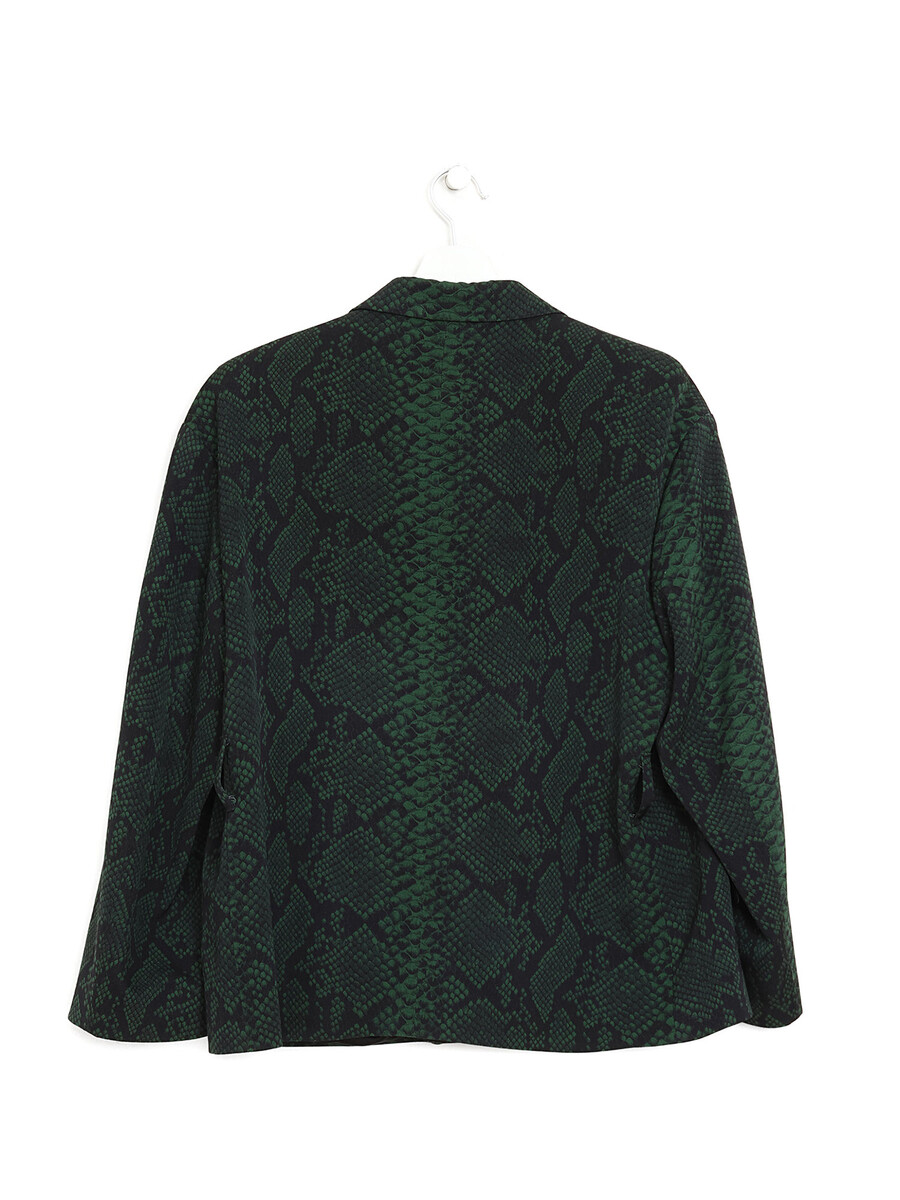 Snake print blazer in green and black tones. Features a notched lapel collar and button closure. Tie belt at the waist for a tailored fit.