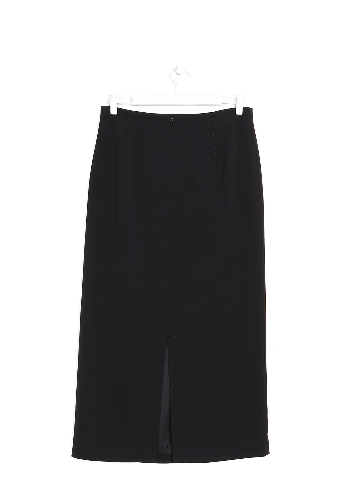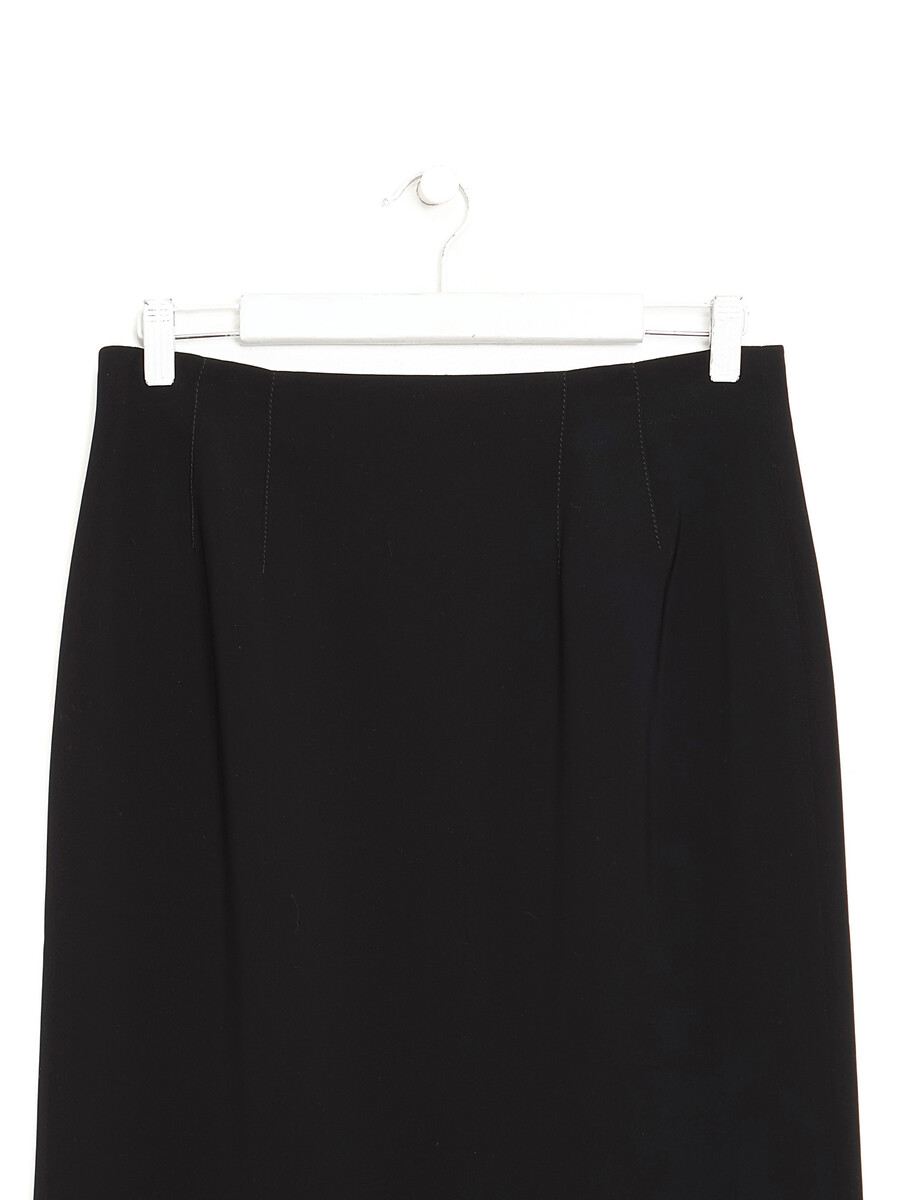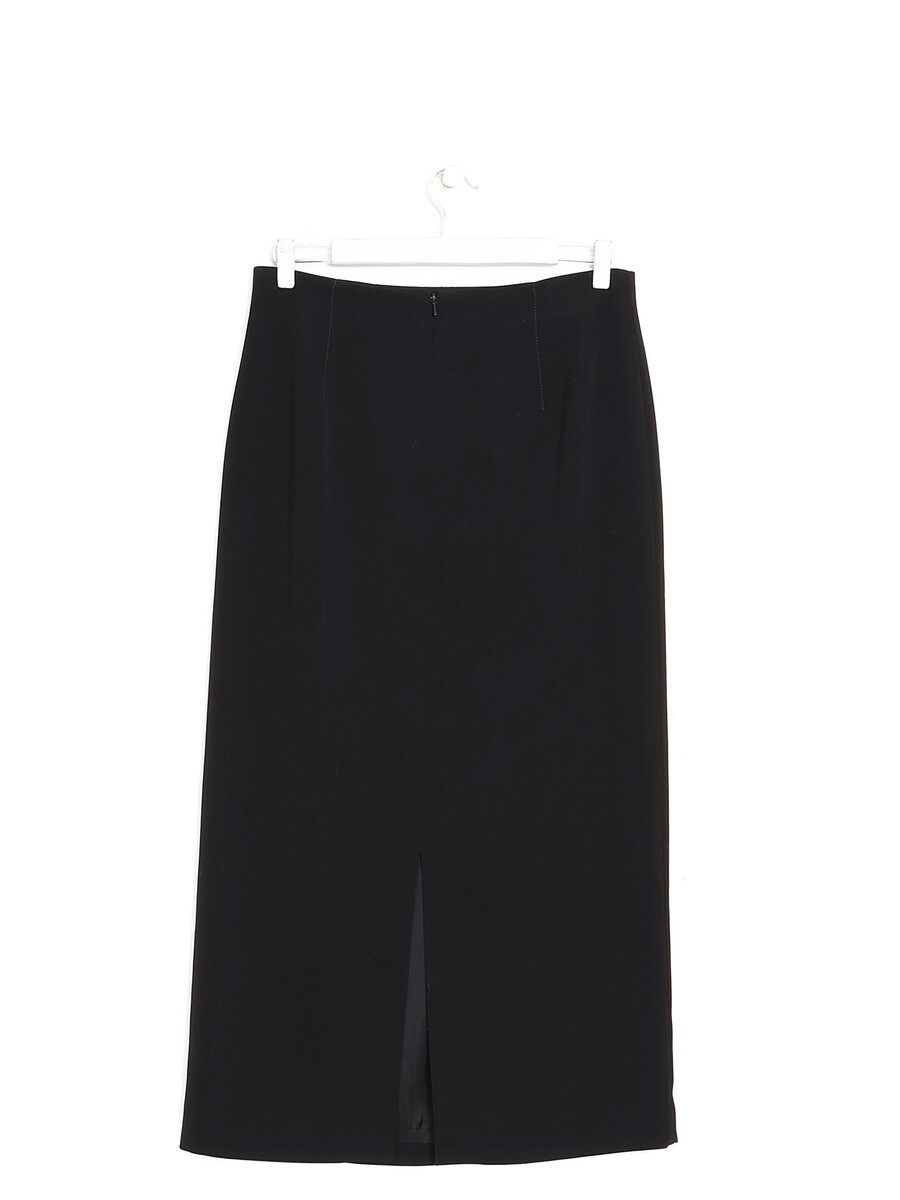 Sleek pencil skirt in black with a fitted silhouette. Zip closure at the back. 64% Polyester, 36% Acetate