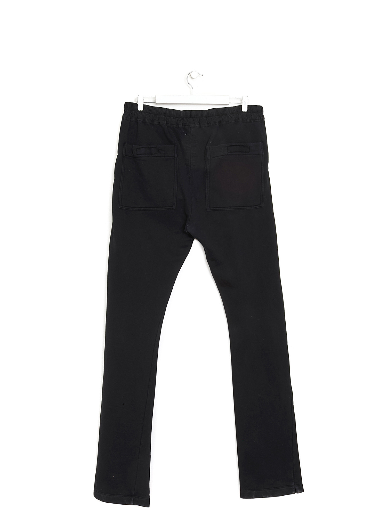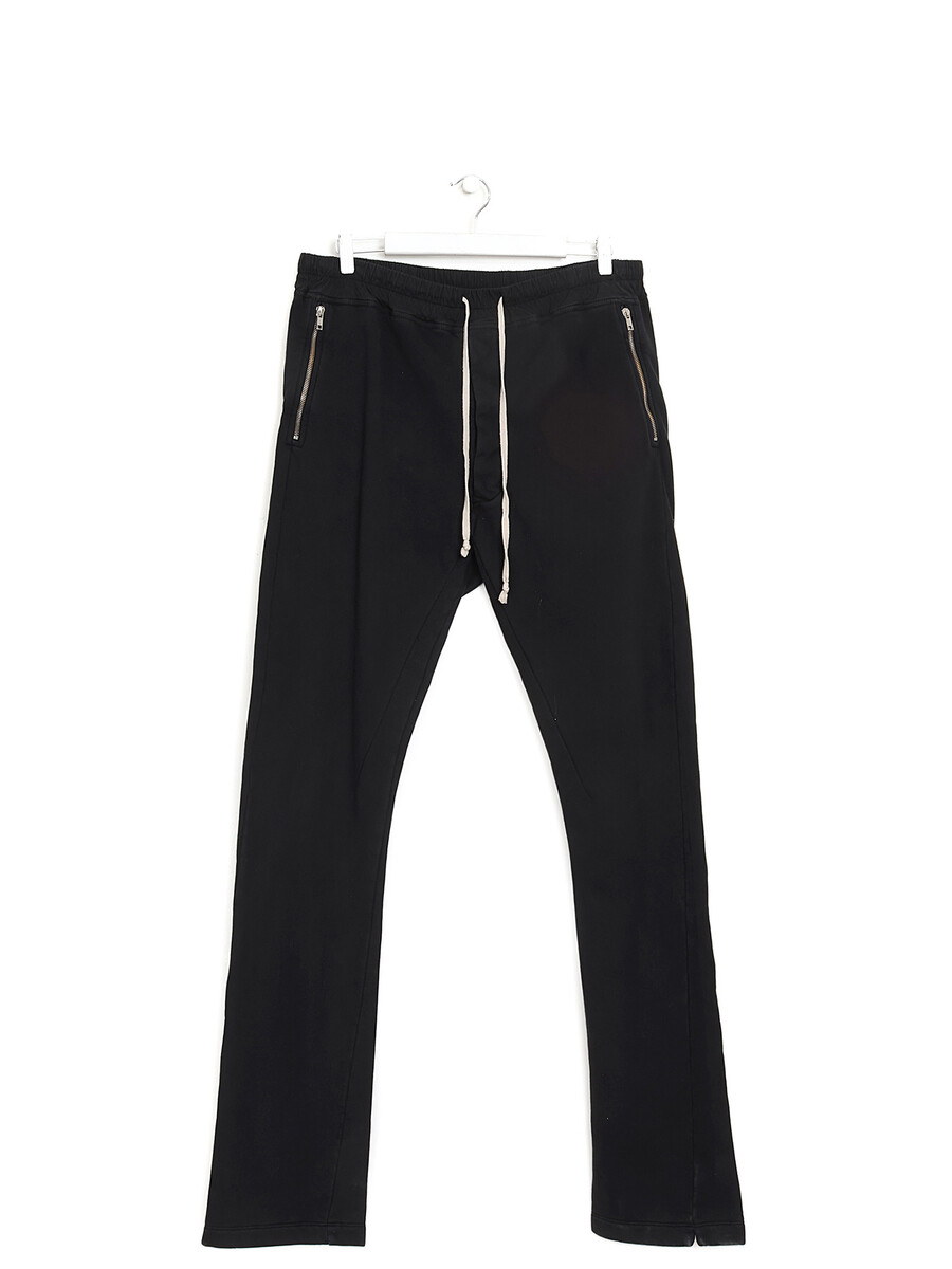 Fleece-lined joggers in black. Elastic waistband with drawstrings. Zipper pockets on the side, Patch pockets at the back.