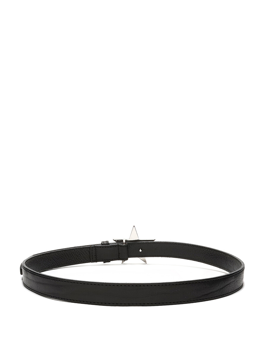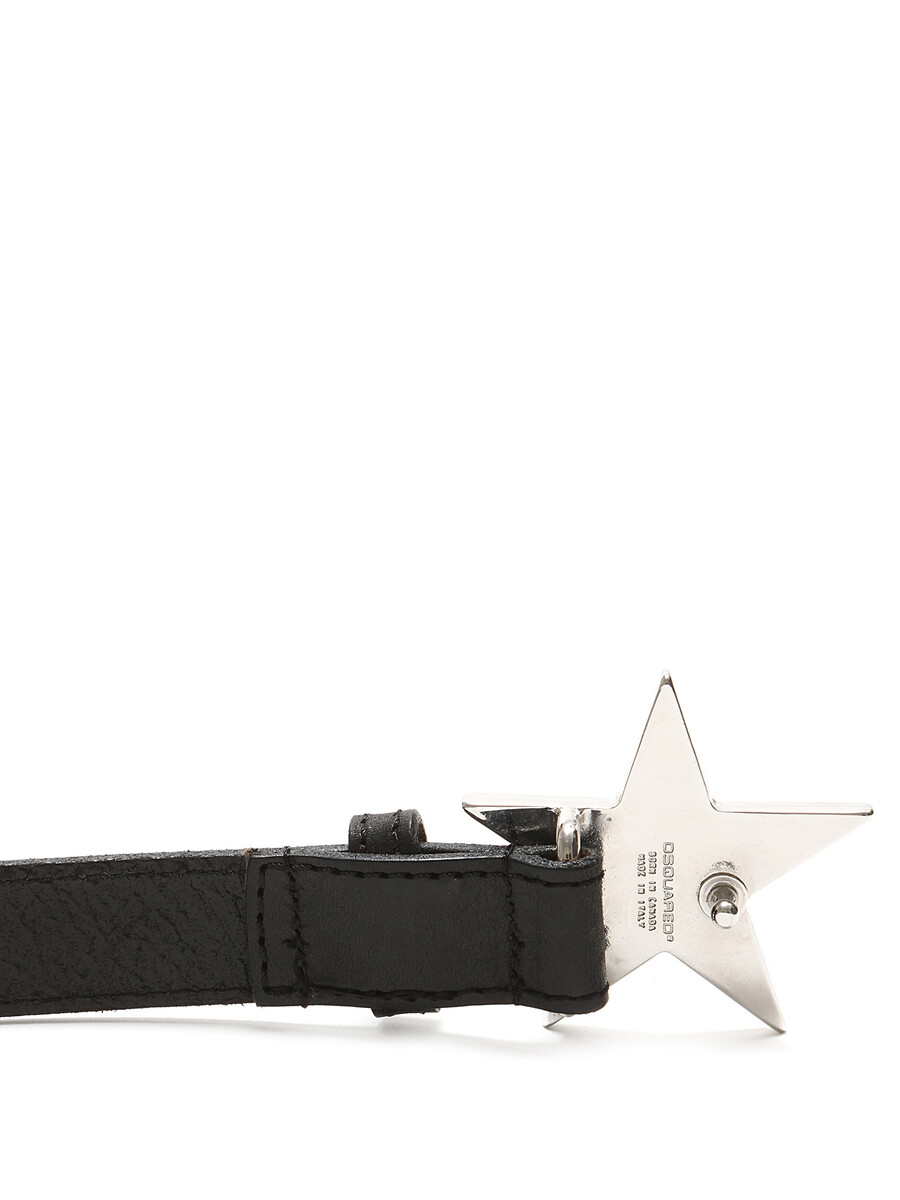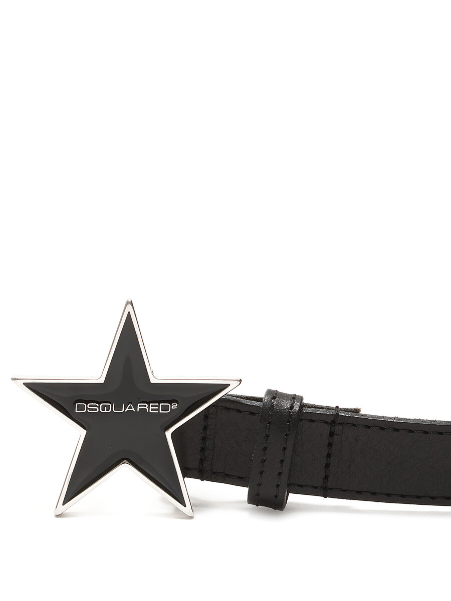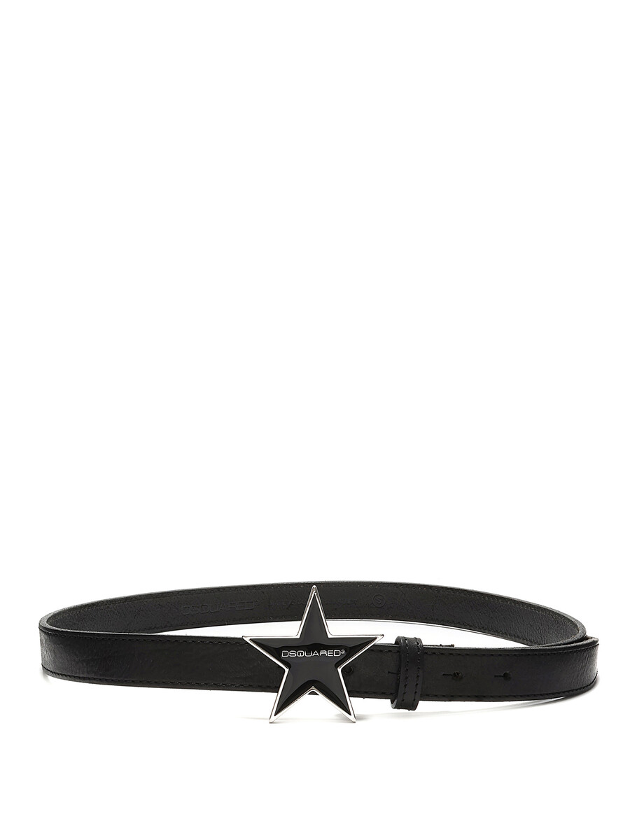 Black star-shaped belt featuring a star-shaped buckle with DSQUARED2 logo. Silver-tone finishes.