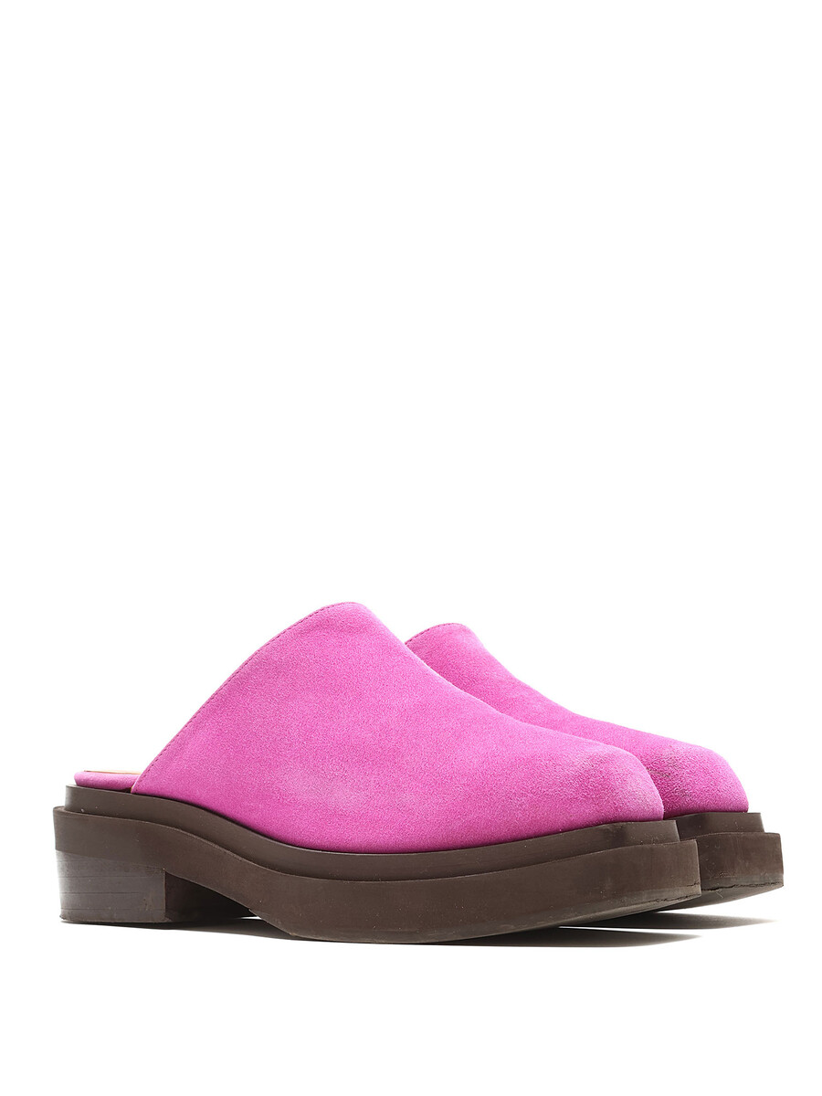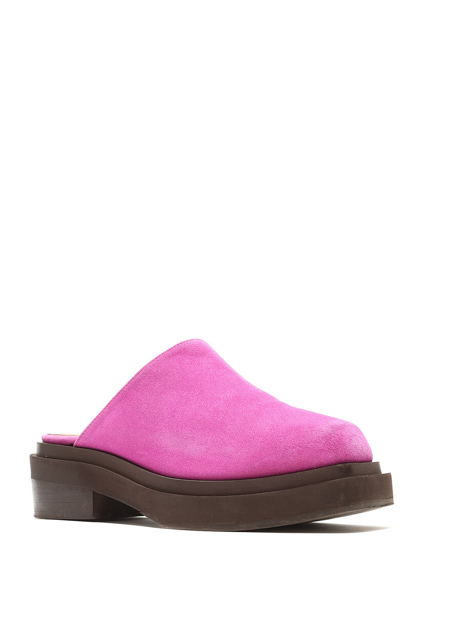 Vibrant magenta suede mules with a slip-on style. Square toe design. Flat rubber sole.